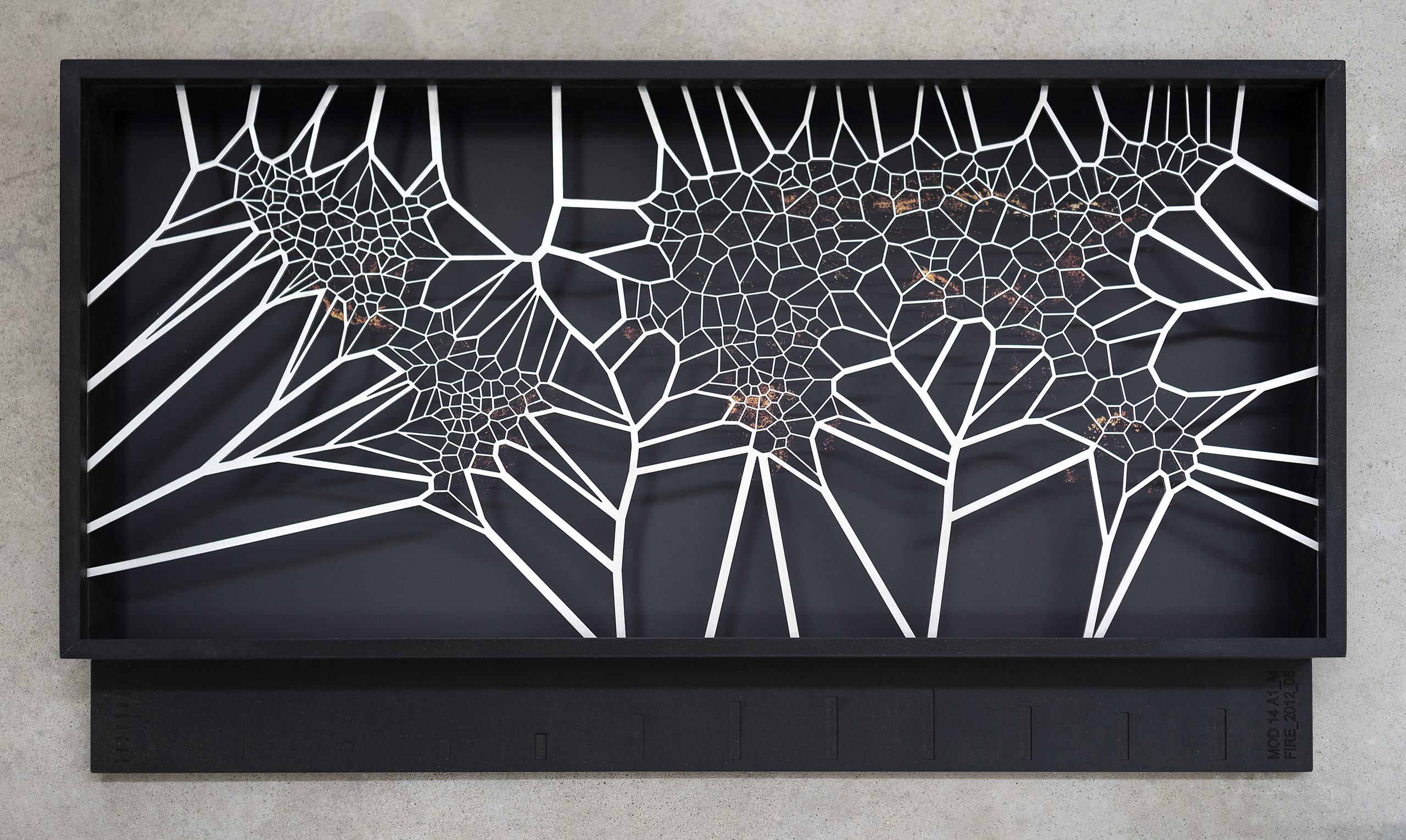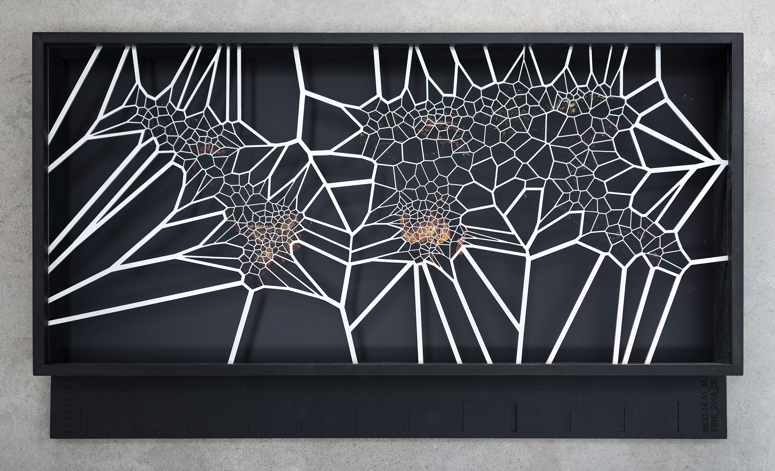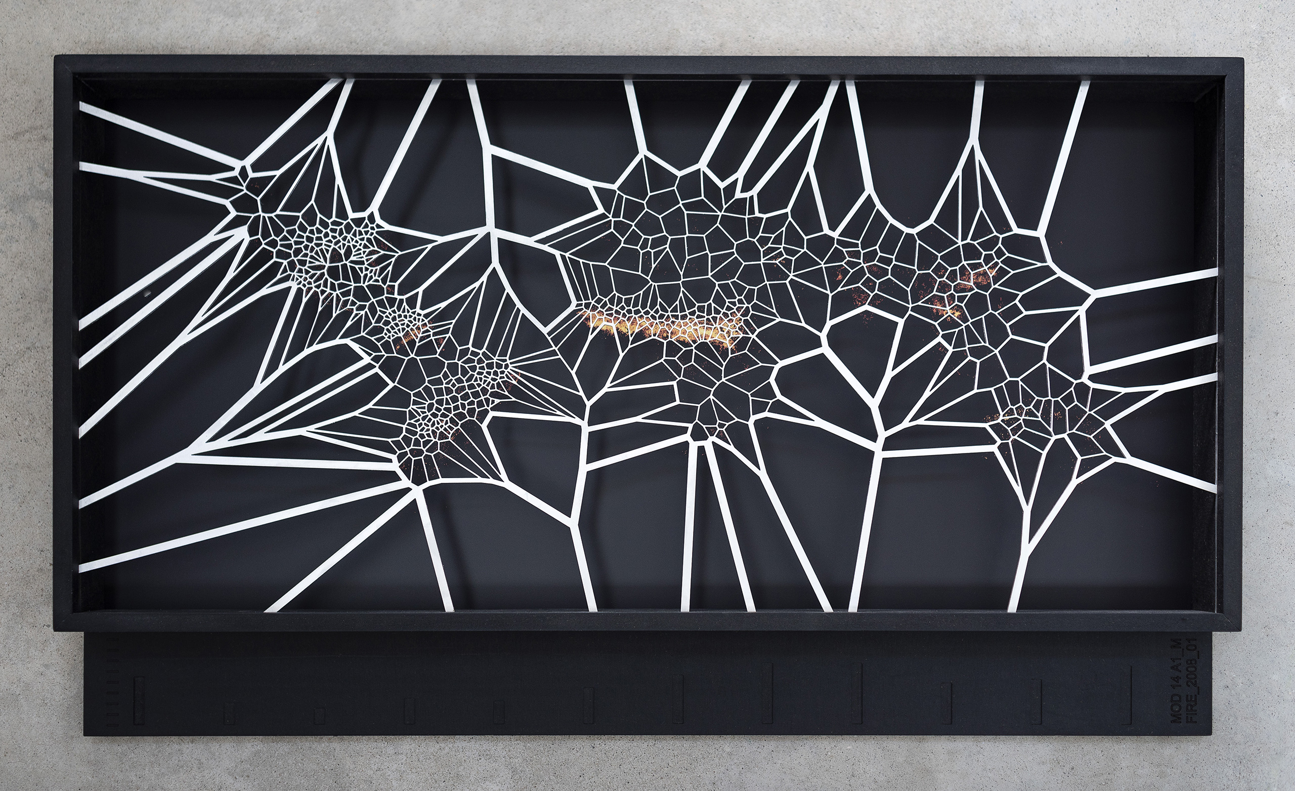 The third space presents the series [MAFD] :: MOD14A1_M_FIRE, made up of ten diagrammatic cartographies, based on the Voronoi Tessellation principle, a type of generative computational geometry based on the concept of Euclidean distance metric; and created from images extracted from the Moderate Resolution Imaging Spectroradiometry System (MODIS), on board the satellites controlled by the National Aeronautics and Space Administration (NASA).