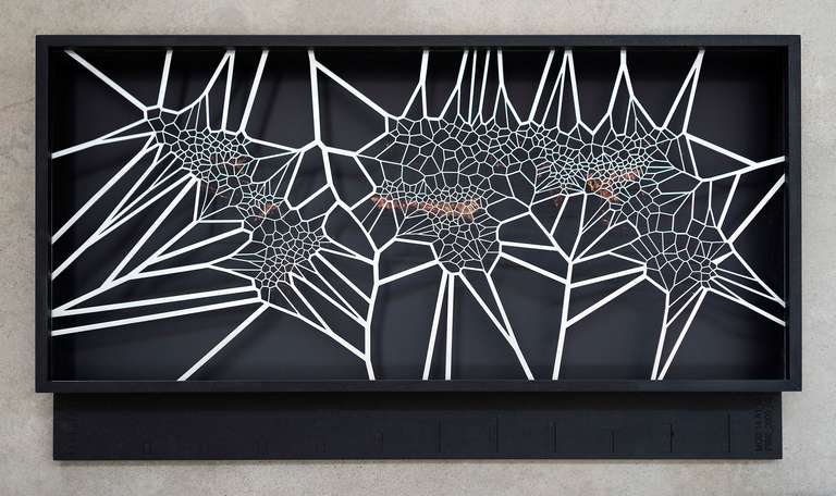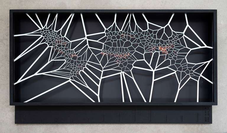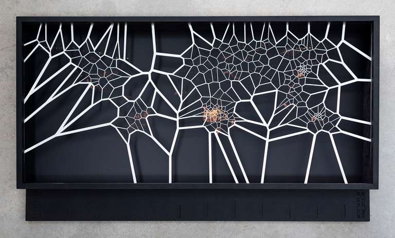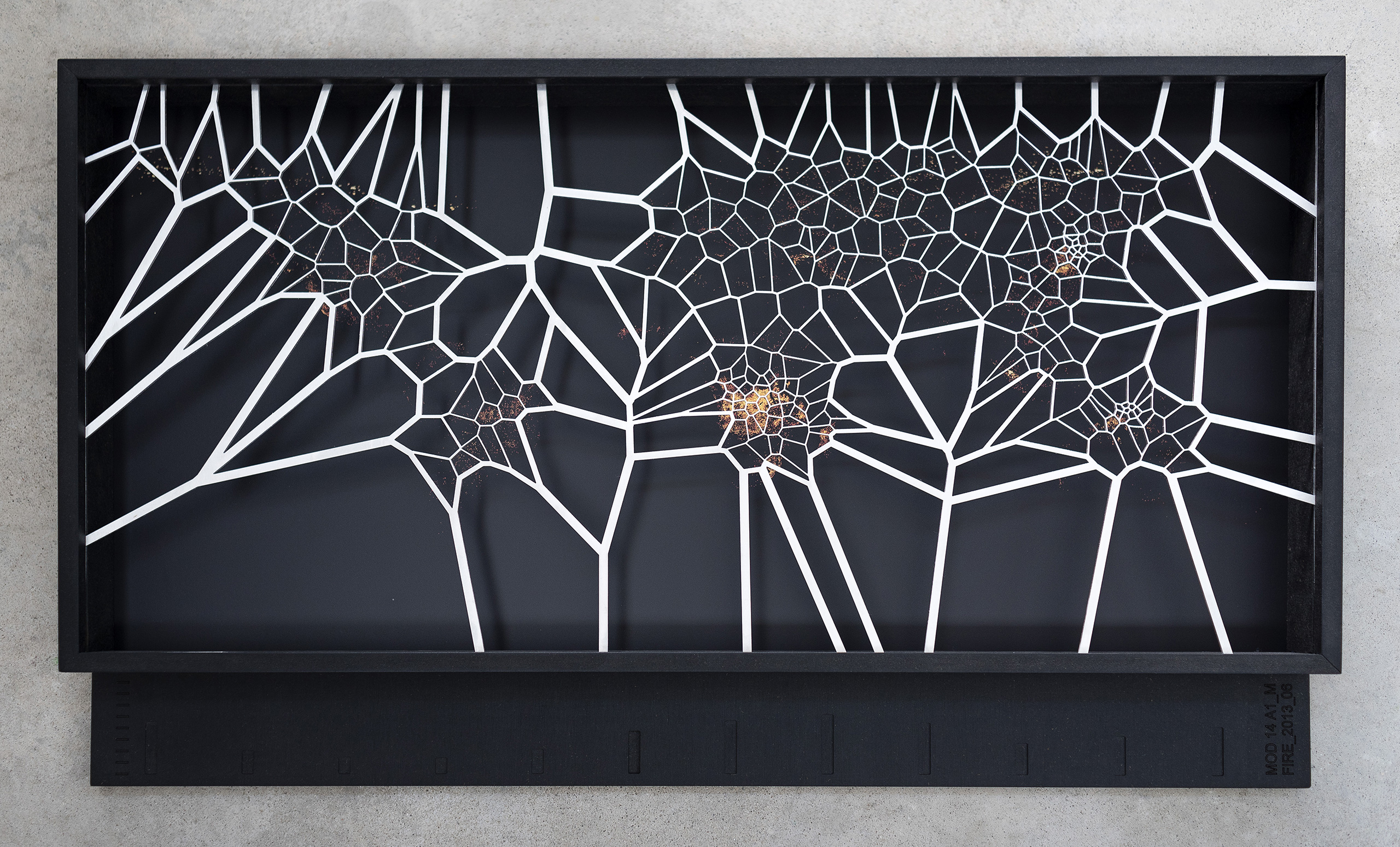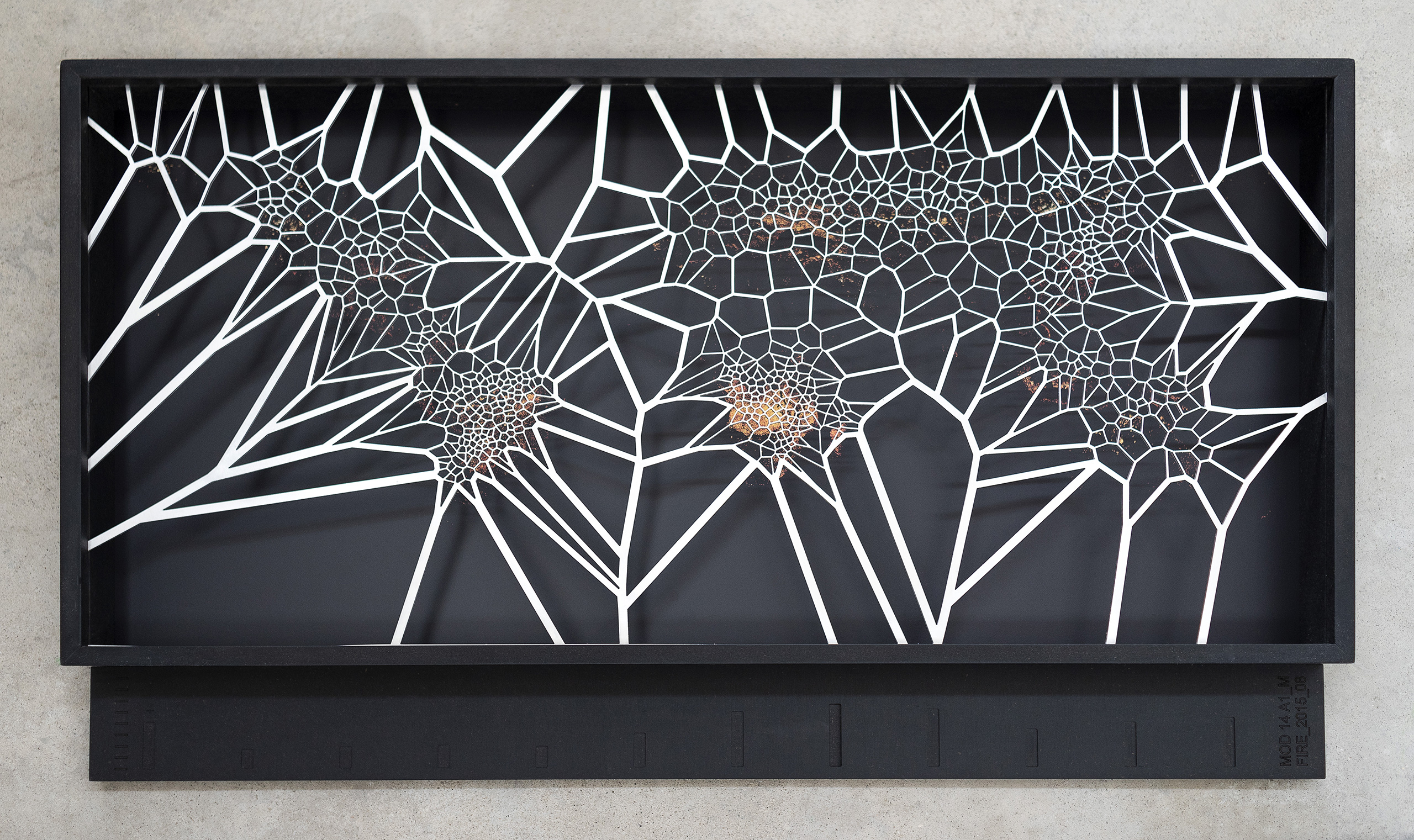The third space presents the series [MAFD] :: MOD14A1_M_FIRE, made up of ten diagrammatic cartographies, based on the Voronoi Tessellation principle, a type of generative computational geometry based on the concept of Euclidean distance metric; and created from images extracted from the Moderate Resolution Imaging Spectroradiometry System (MODIS), on board the satellites controlled by the National Aeronautics and Space Administration (NASA).