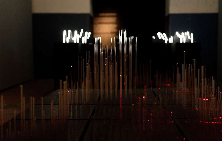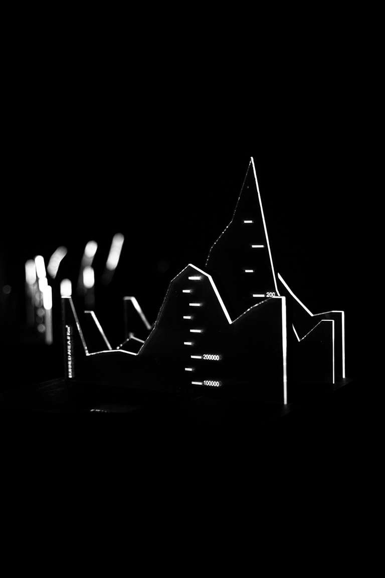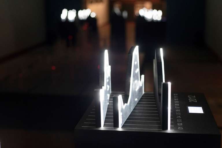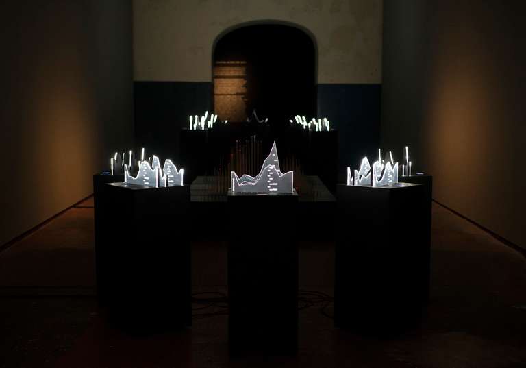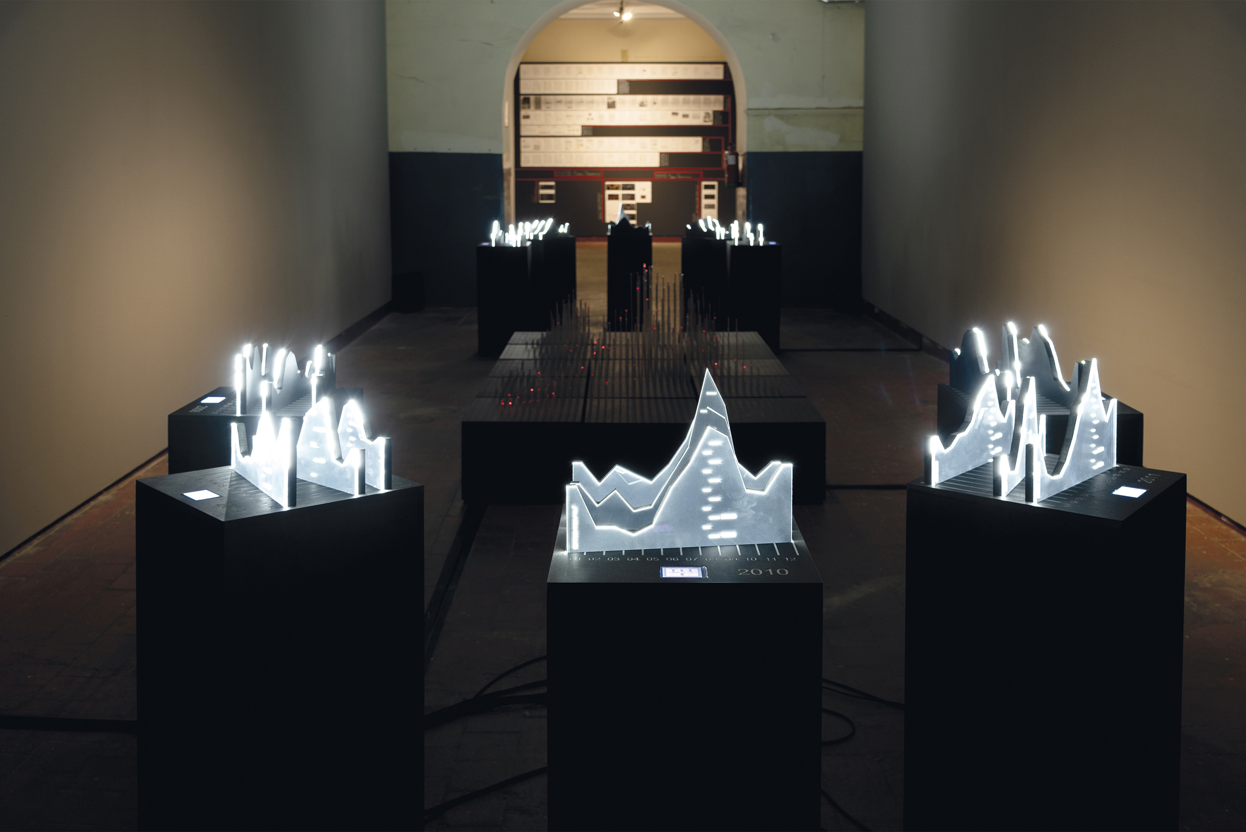 In the central space, [MAFD] :: Planisphere and [MAFD] :: Graphic Atril (2008-2017), the main core of the project, is located; a sculptural, light and interactive installation, which collects and visualises three-dimensionally the data of the active fires in the last decade. A matrix device, conceived as a three-dimensional pixel screen on which to represent, through the reflection of light on the glass, the dynamic evolution of forest fires in the time frame under investigation. Ten structures are connected to this central core, which display the monthly data and graphs for each year, based on three parameters: burned area, CO2 emissions and number of fires (fire count). The spectator can interact, via a touch screen, with the core of the installation, to choose the evolution of fires in a specific year.