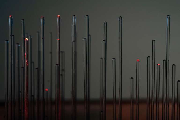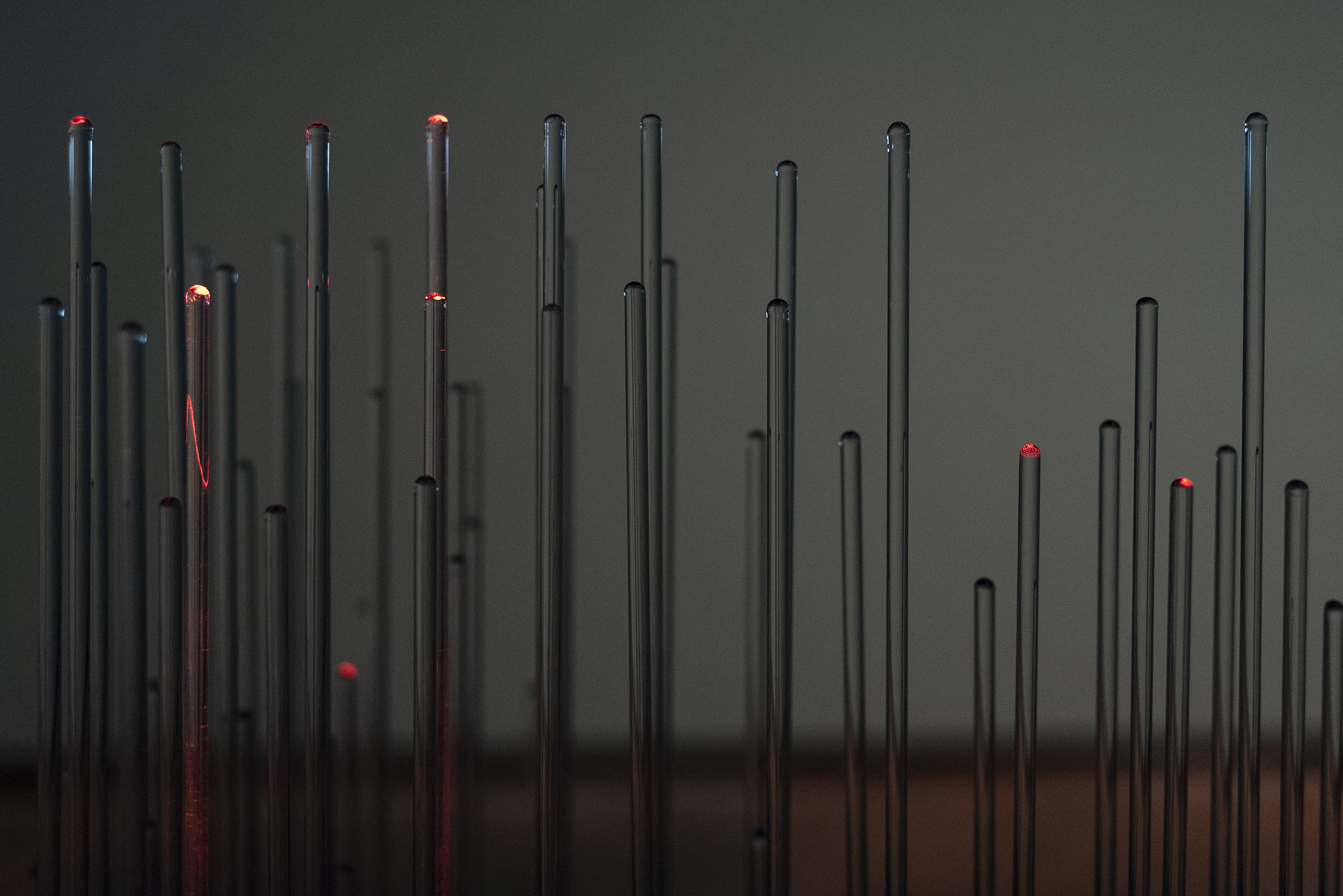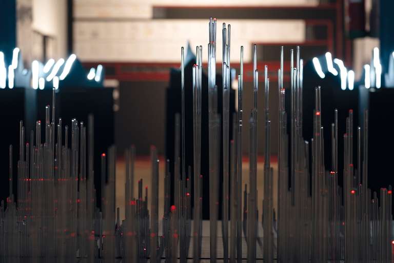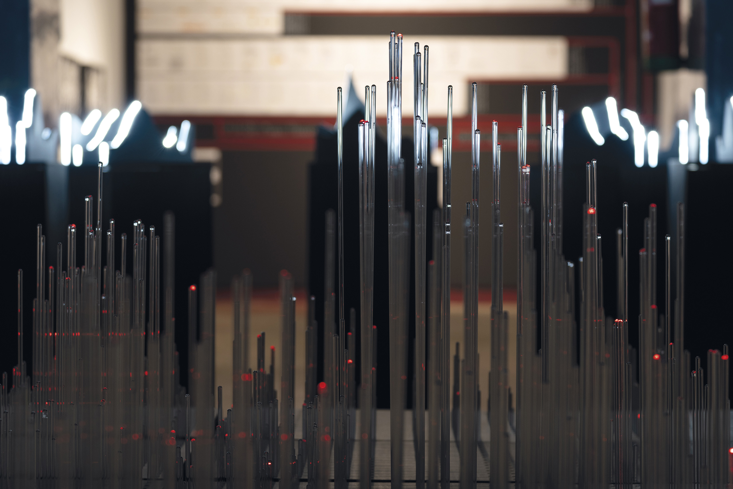 In the central space, [MAFD] :: Planisphere and [MAFD] :: Graphic Atril (2008-2017), the main core of the project, is located; a sculptural, light and interactive installation, which collects and visualises three-dimensionally the data of the active fires in the last decade. A matrix device, conceived as a three-dimensional pixel screen on which to represent, through the reflection of light on the glass, the dynamic evolution of forest fires in the time frame under investigation. Ten structures are connected to this central core, which display the monthly data and graphs for each year, based on three parameters: burned area, CO2 emissions and number of fires (fire count). The spectator can interact, via a touch screen, with the core of the installation, to choose the evolution of fires in a specific year.
