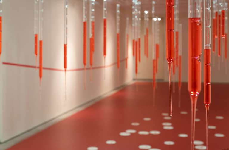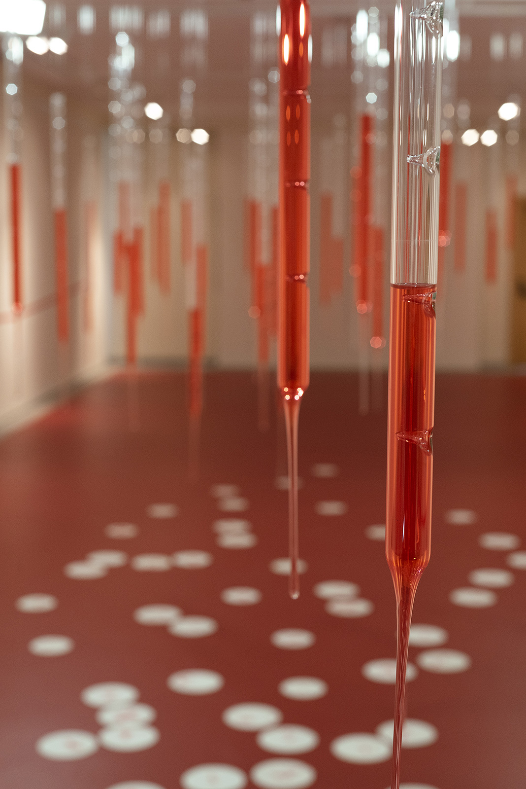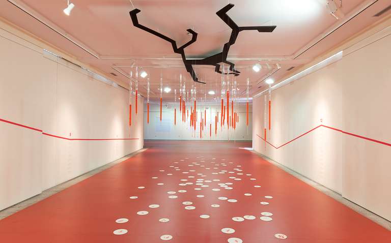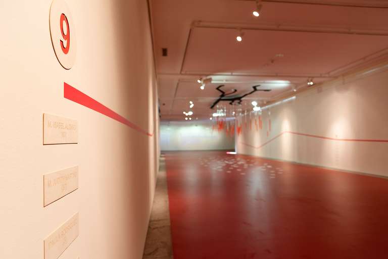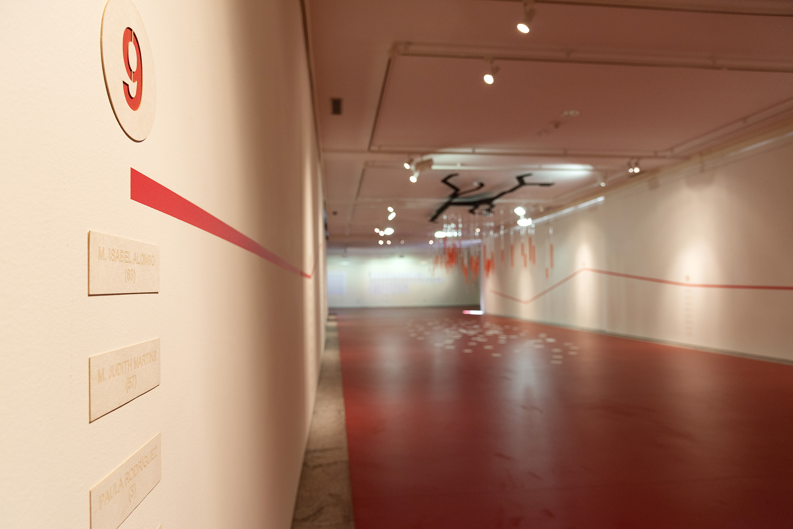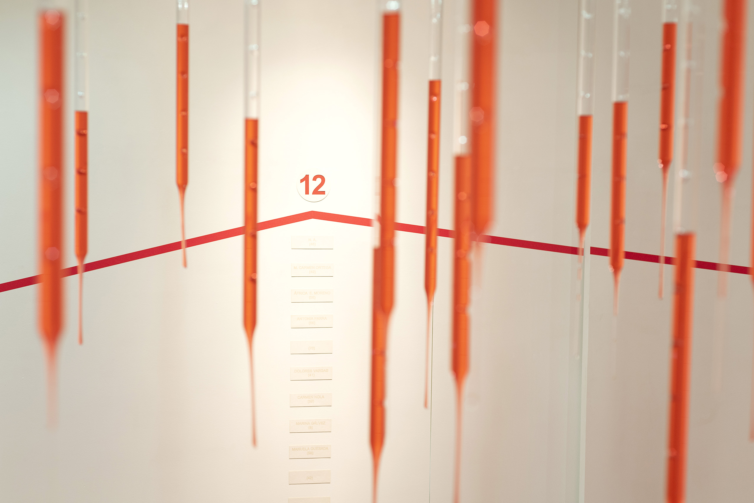 Suspended in space, 47 crystalline test tubes, containing an intense reddish liquid, allude to the murders classified within the typology of official intimate femicide (women murdered by a man with whom they were or had been in a relationship). The level of liquid in the test tubes indicates the age range of death. On the vertical canvas of the room and on both sides, a diagram of lines is articulated, whose nodes converge in the number of murders (per month) that occurred throughout the year, until a total figure of 97 is reached. Each month is completed with the name, surname and age of each of the victims. On the horizontal plane of the floor, a constellation of 97 white circles with a red spot in the centre reinforces the installation, like a scatter graph.