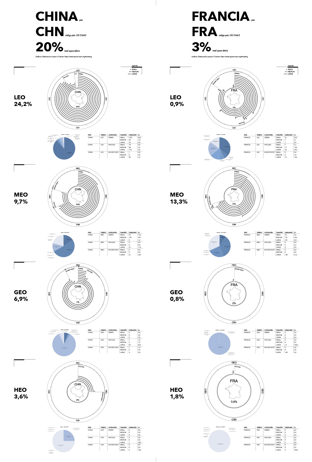 The exhibition is structured around three axes. The first, the conceptual one, reveals the data collected from scientific sources and produces graphs that help to understand them. Each country has been classified according to the four Earth orbits, LEO, MEO, GEO and HEO, and according to the three main categories of space debris: debris, rocket body and payload.