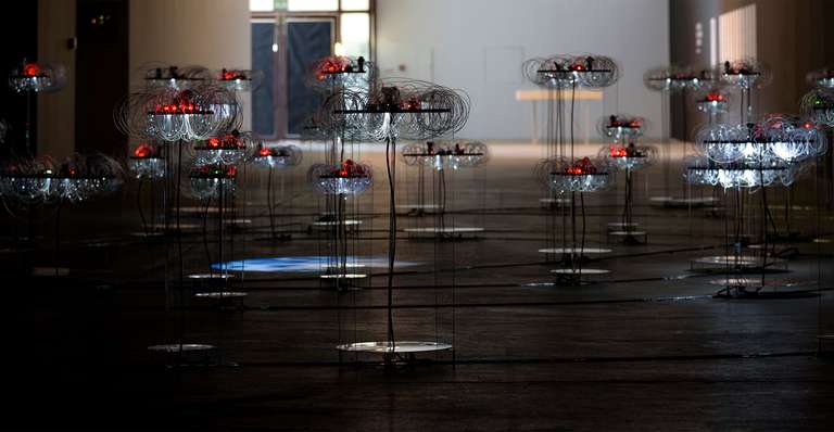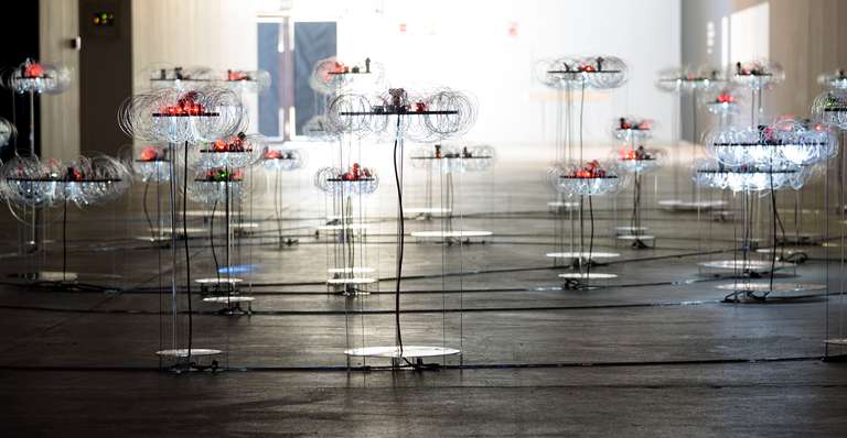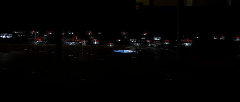 Overall dimensions: 1150 x 1150 x 95 cm (h) // 44 platforms, diameter (20-50 cm) and height (50-95 cm).