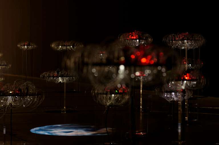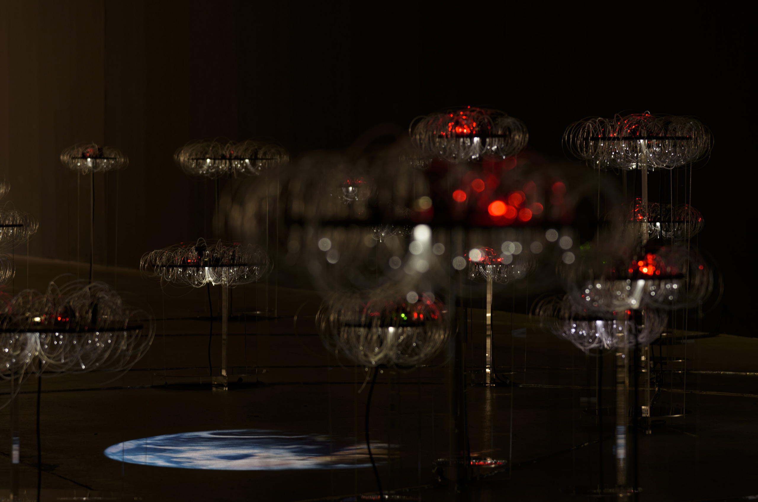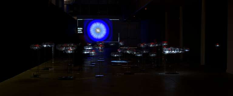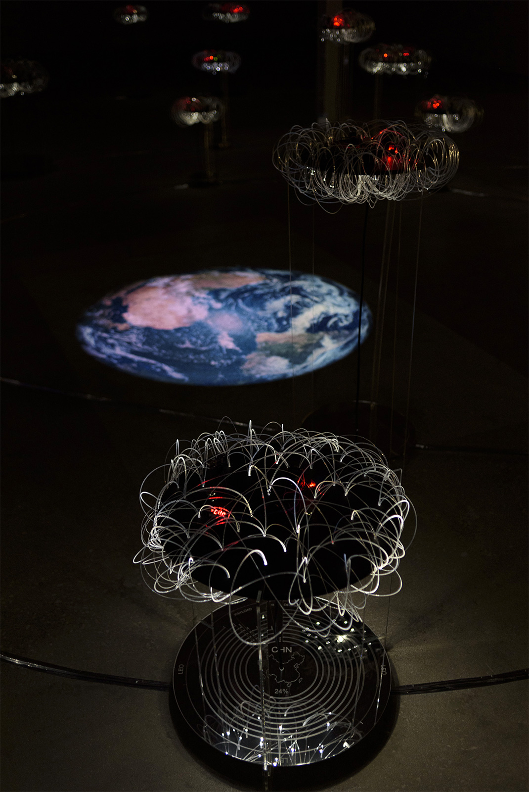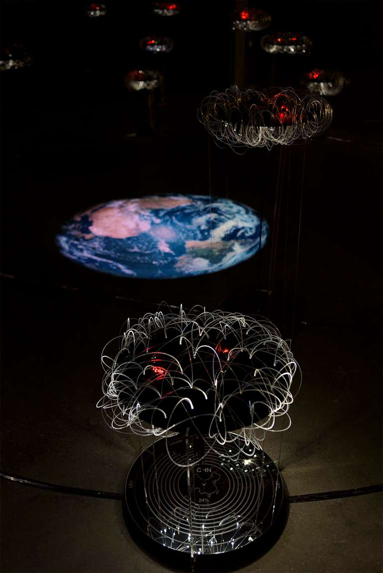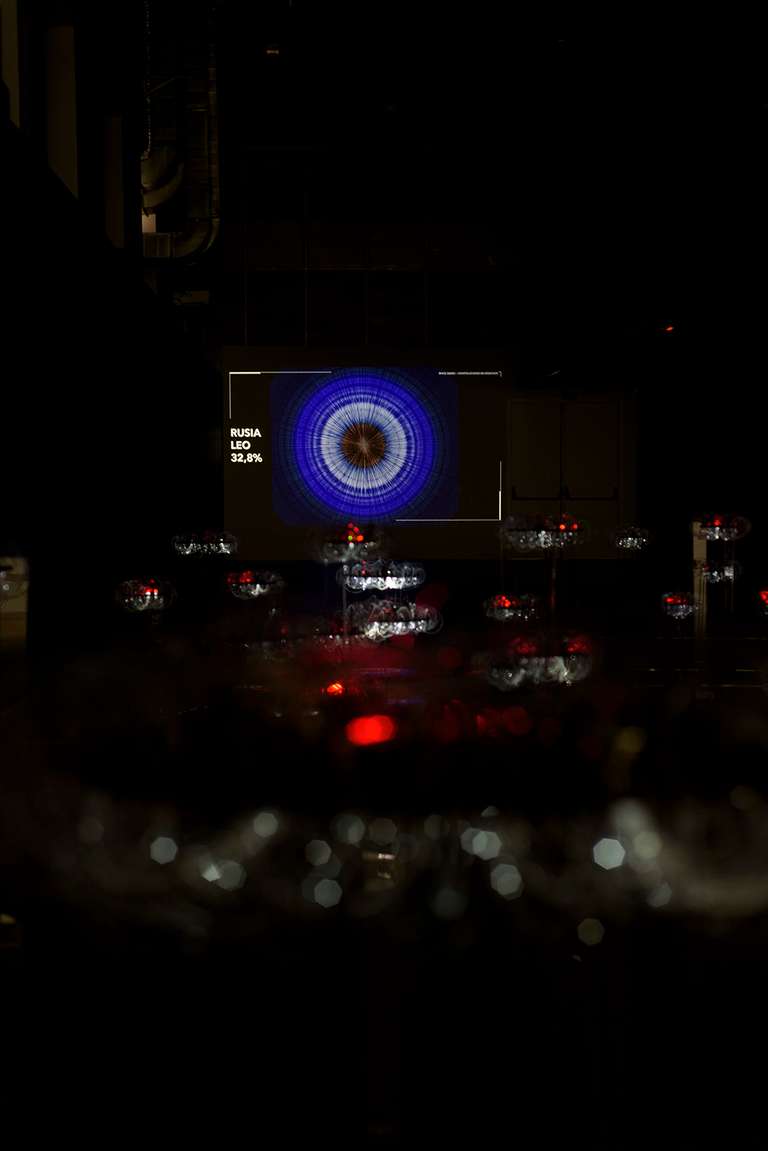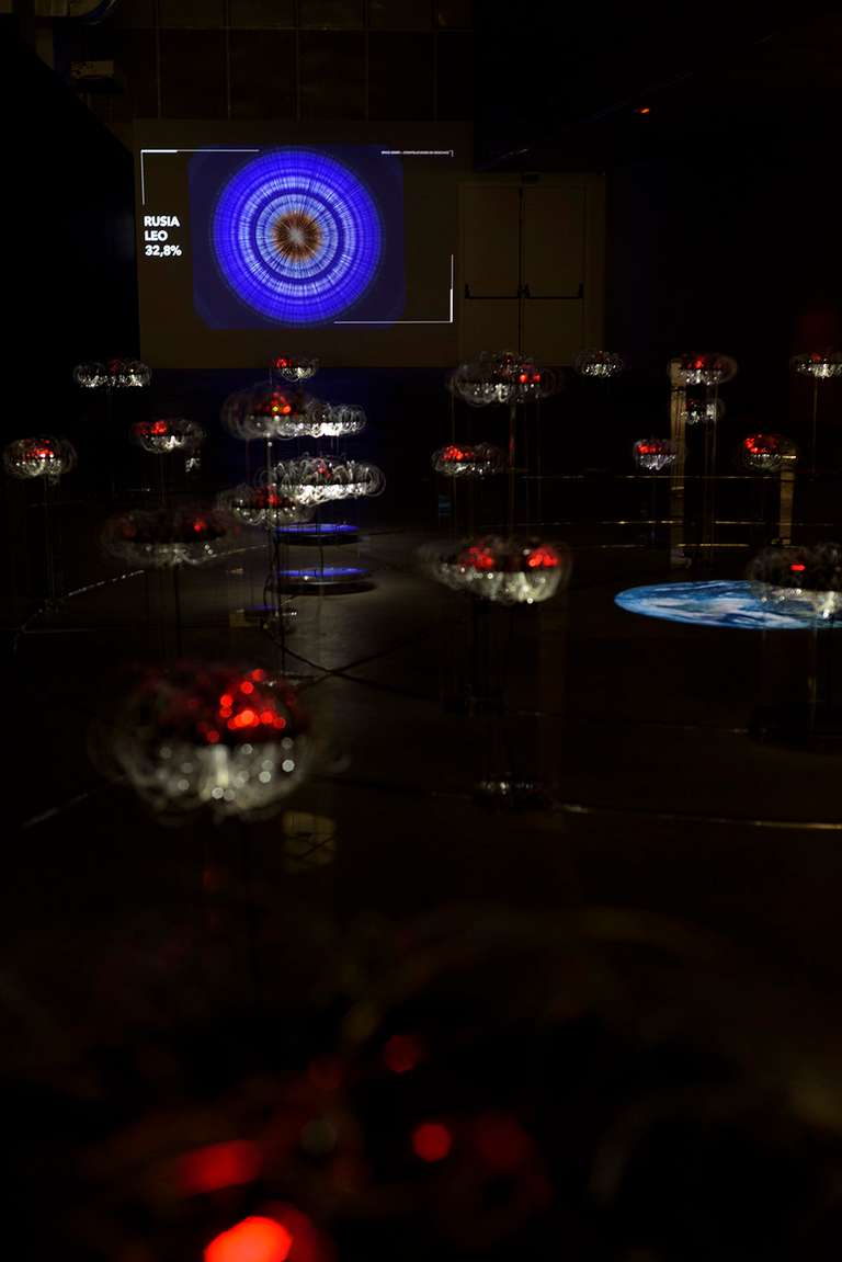 The second and main axis consists of a large, interactive, three-dimensional installation that interprets outer space and its four main orbits. A projection of the Earth acts as the centre, around which are distributed 44 platforms woven with fibre optics and activated by light sensors. In its perpendicular projection a specular oculus shows us the data of that country in the form of a circular ring chart and an audio completes this immersive environment. The platforms of the countries with the greatest impact trigger a projection that translates the data of the activated state into a dynamic and generative visualisation.