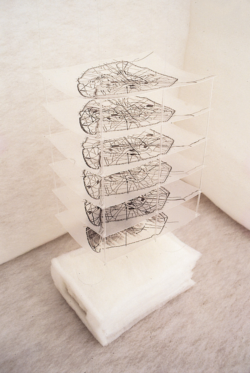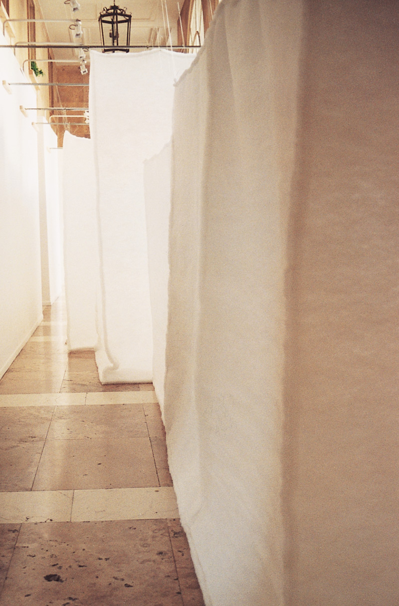Seven rooms made of white boatex define different rooms in which the spectator is progressively introduced. Inside, columns of superimposed acetates project images onto blank books also made of this material. Layering and superimposition of information and experiences fill the pages of these blank books. Maps, photographs and texts of different cities complete these visual diaries of rooms.
