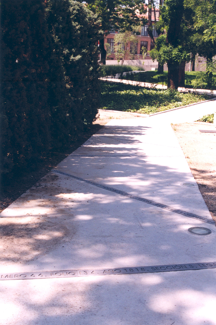The other area of intervention is located in the southern part of the park, in the so-called "cypress maze". Four trapezoidal strips, paved in concrete, serve as support for cast aluminum plates, about 12 cm. wide, which contain words and dates in negative. The text includes a list of existing documents on the Casino de la Reina, in the Archivo de la Villa de Madrid (Archivo de Secretaría No. 27, folios 128-129). In a seriation according to the structure of: YEAR, SECTION, LEGACY, NUMBER AND FOLIO, the history of the park is summarized in such a way that an interested viewer could reconstruct, through the different files and deeds, the past of the garden.
