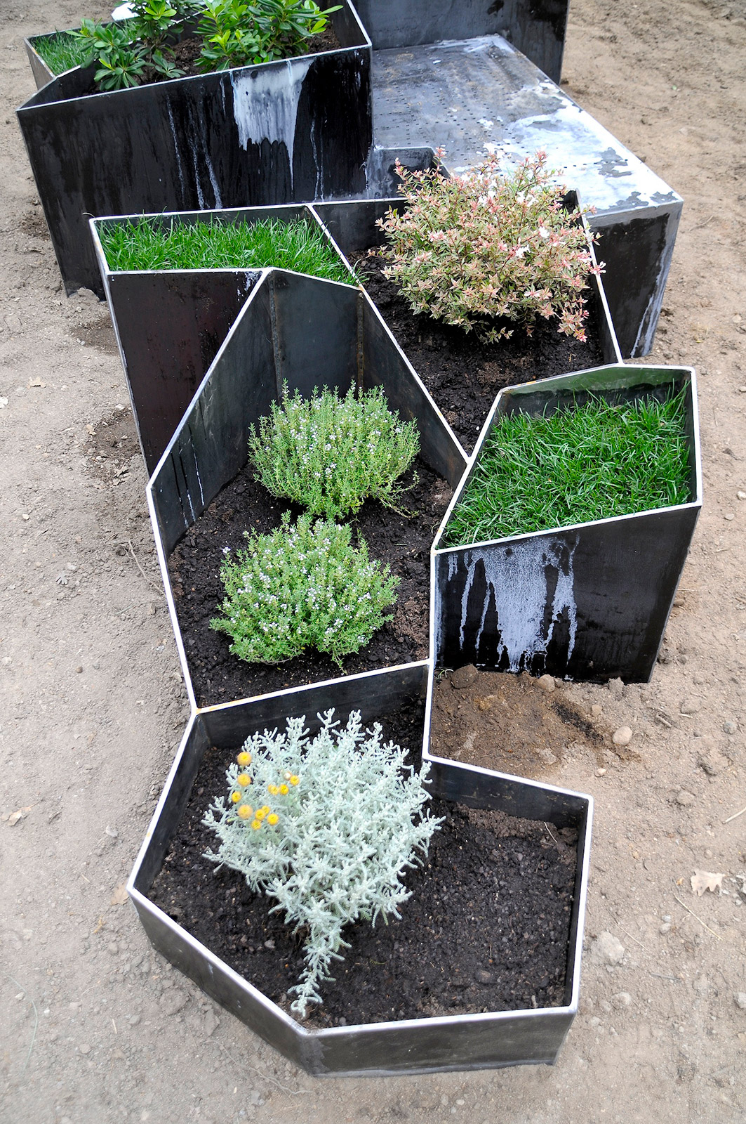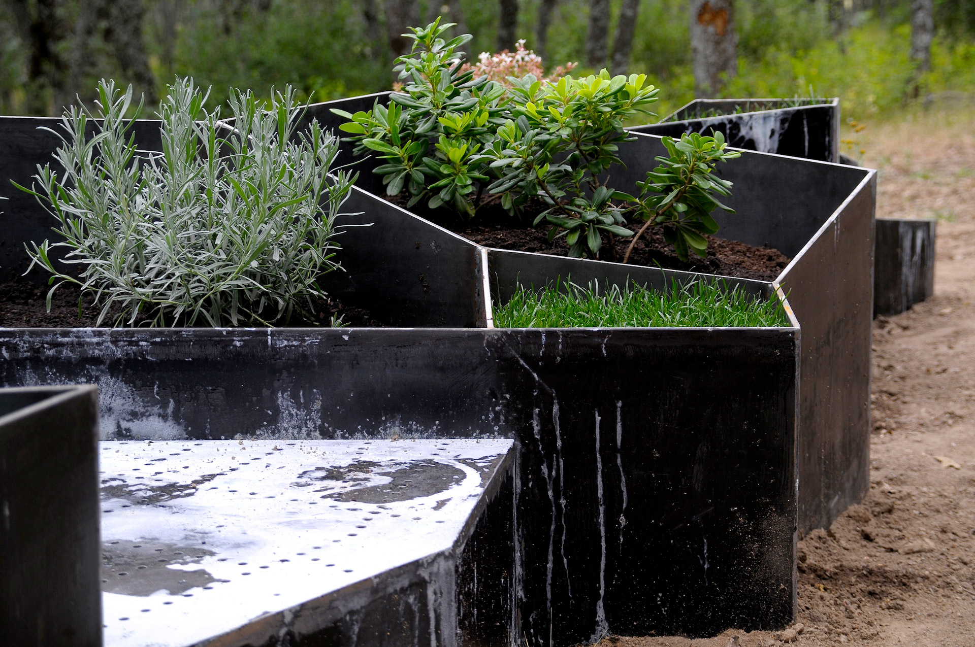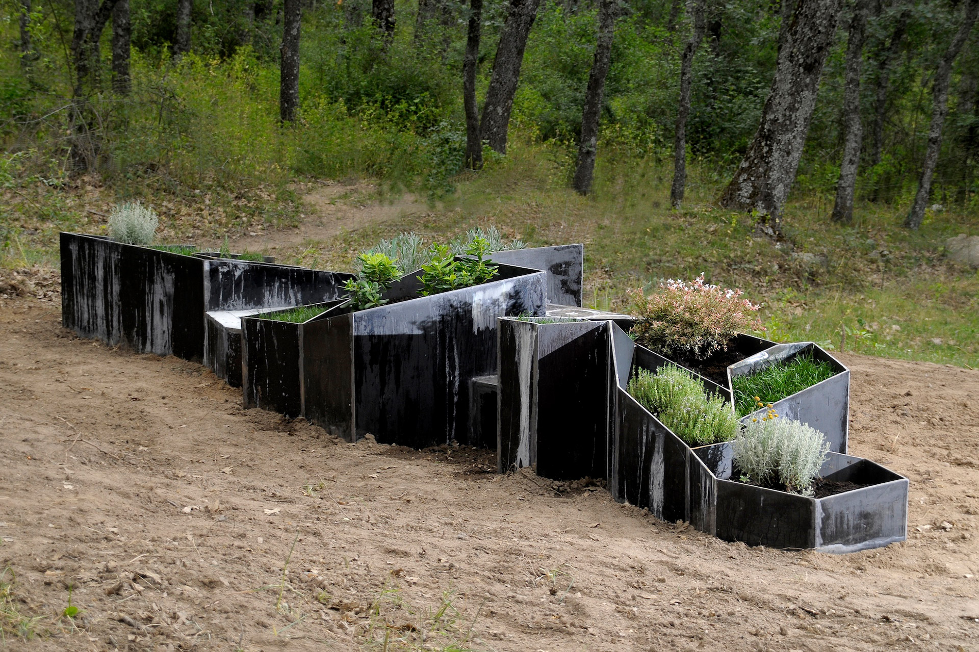 La interesante morfología urbana del municipio Navas del Marqués divide su planimetría en tres áreas diferenciadas: a la izquierda una zona laberíntica donde se localizan las principales urbanizaciones; en el centro la parte más geométrica y reticulada y, por último, a la derecha destaca un área más histórica y de carácter mucho más orgánico que el resto. Atendiendo a estas tres zonas, la intervención Jardín Urbano pretende realizar una alusión al municipio mediante la creación de tres grandes parterres que recrean una abstracción del tejido urbano de la localidad. Desarrollados en chapa de hierro de 3 mm. de espesor, volúmenes de diferentes alturas generan tres enormes contenedores metálicos donde los vecinos del municipio pueden recrear un jardín urbano. Dentro de cada parterre hay hierbas aromáticas, césped y otras especies vegetales. Cada año se podrá renovar la plantación e incluso generar un “huerto urbano”, de tal forma que sean los propios vecinos los que mantengan el lugar.