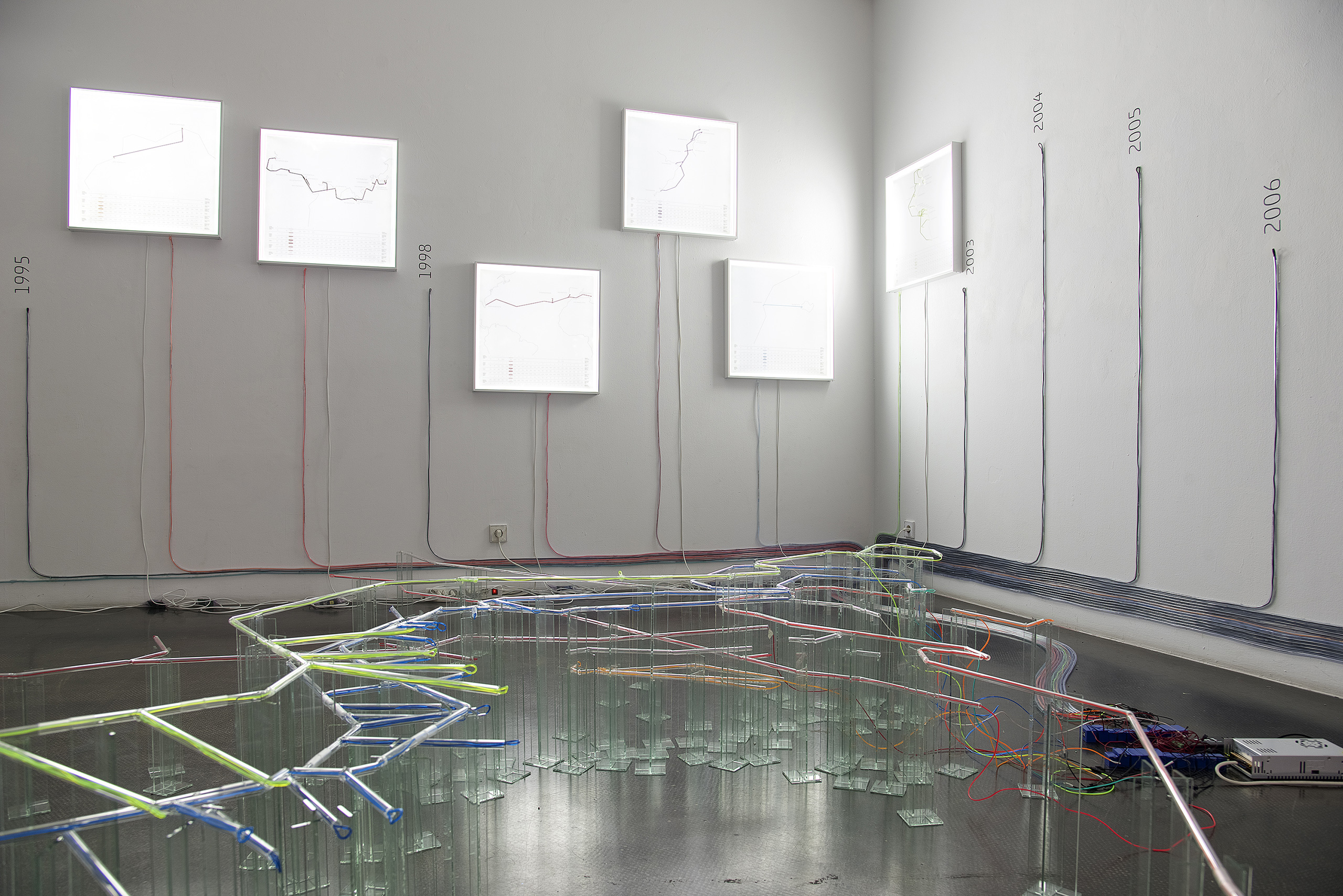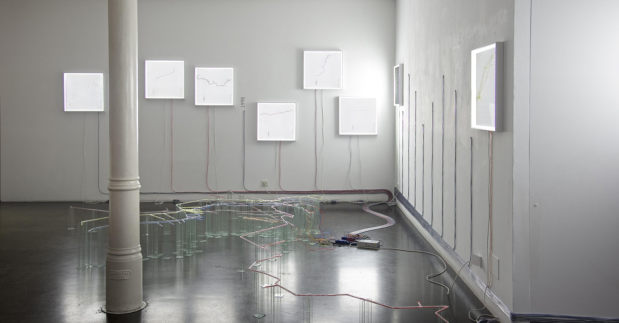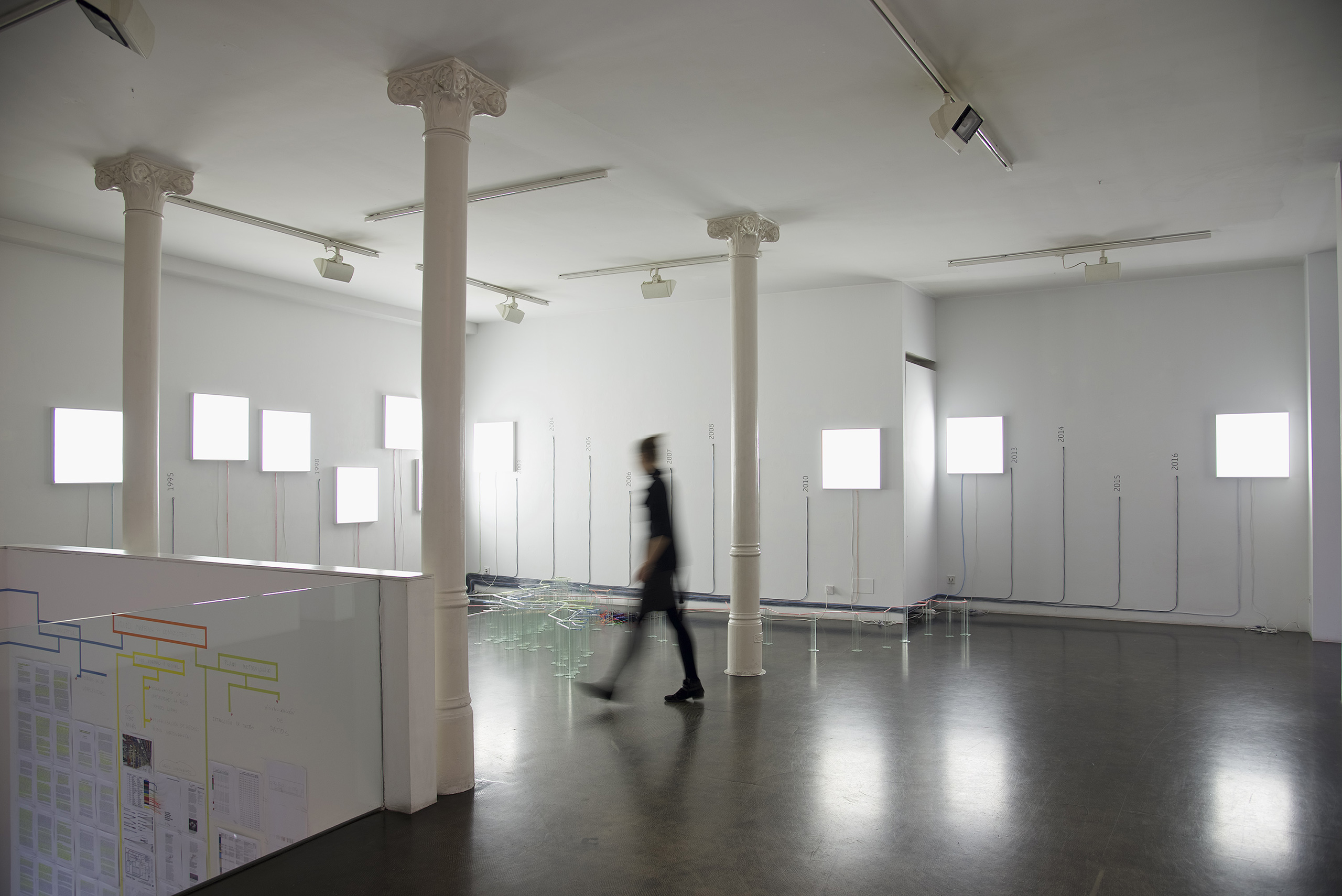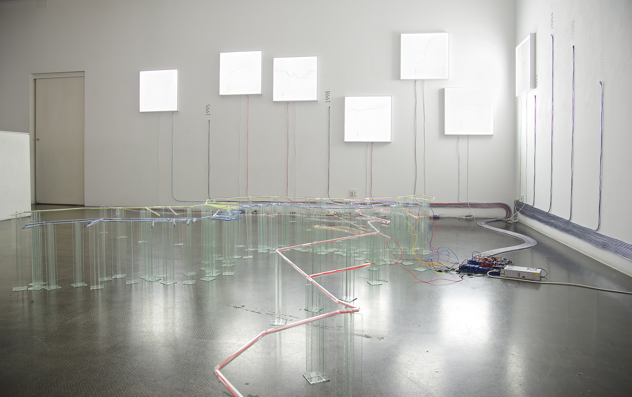 La instalación de suelo se conecta a la esquina de la galería a través de un conducto que alberga todos los cables de colores para distribuirse ordenadamente por el plano vertical de la galería y generar en su recorrido una “línea del tiempo” del crecimiento de este mapa de conectividad. Cada cable irá a parar a su correspondiente año de implantación, y alimentará una pantalla lumínica, casi como un monitor de ordenador, donde separadamente del conjunto geográfico se descontextualizan los cables construidos en ese año, para visualizarlos en su descripción lineal, con sus coordenadas geográficas, junto a la leyenda de datos que conceptualiza la instalación. Un total de diez screens, representan los años en los que ha habido actividad en la construcción de cables submarinos en nuestro país, y construyen la línea temporal que recorre tres paredes de la galería, estableciendo una continuidad visual y espacio temporal en el conjunto expositivo. Por último, un paisaje sonoro de cables subacuáticos envolverá el conjunto introduciendo al espectador en una escenografía casi acuática y metálica.