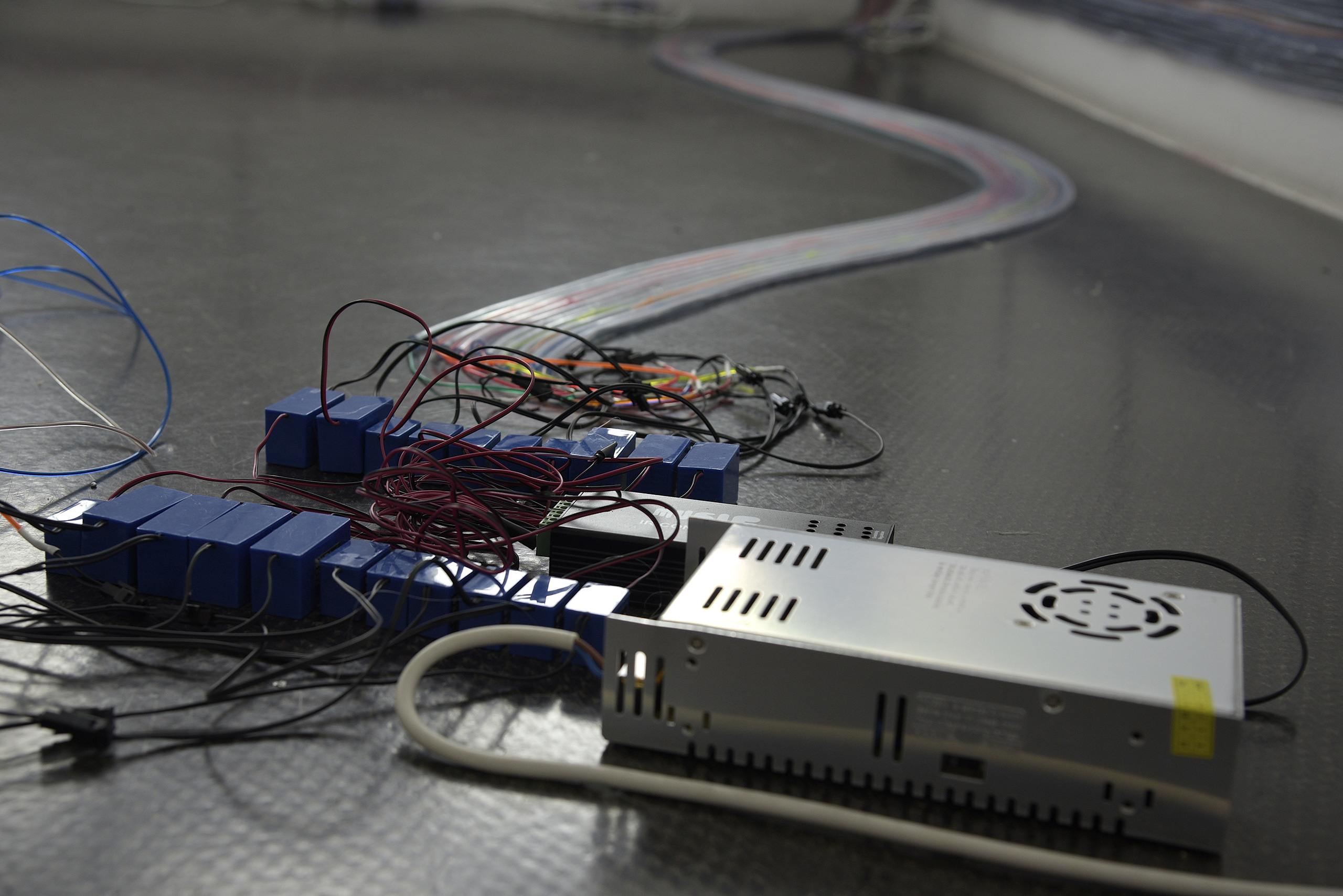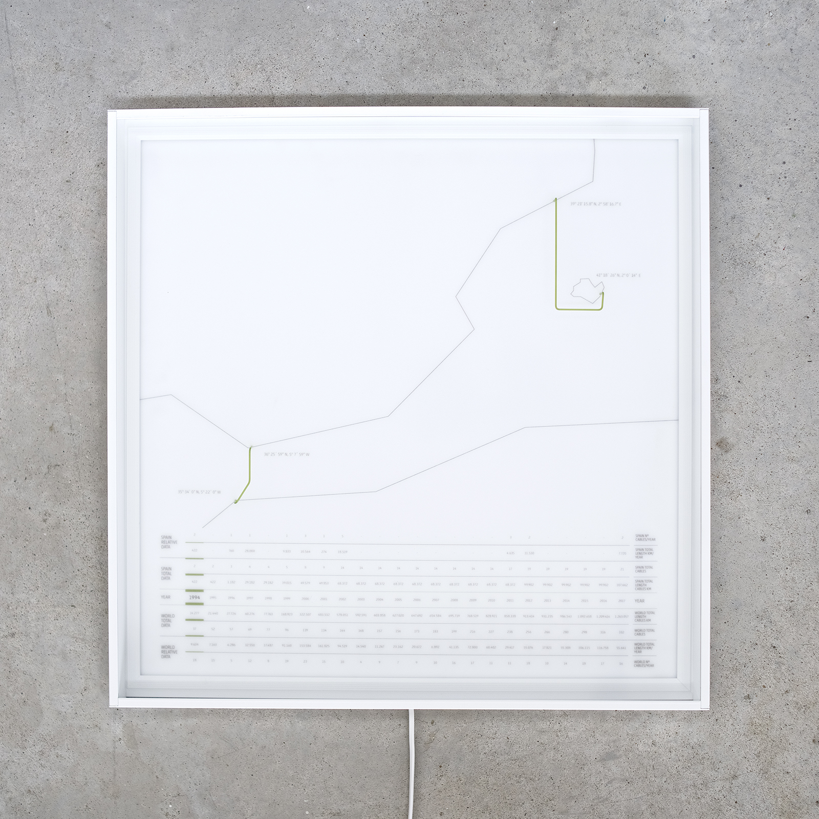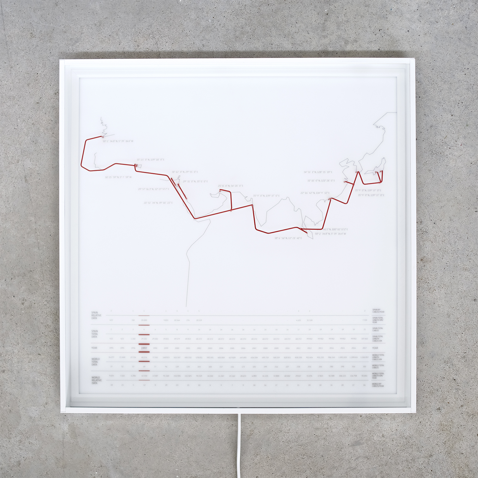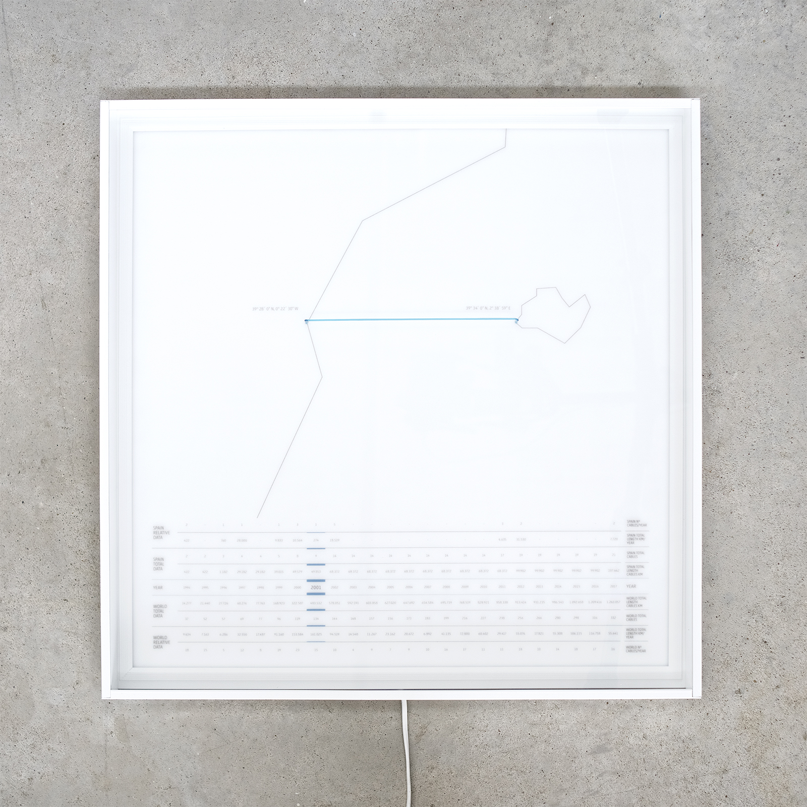 La instalación de suelo se conecta a la esquina de la galería a través de un conducto que alberga todos los cables de colores para distribuirse ordenadamente por el plano vertical de la galería y generar en su recorrido una “línea del tiempo” del crecimiento de este mapa de conectividad. Cada cable irá a parar a su correspondiente año de implantación, y alimentará una pantalla lumínica, casi como un monitor de ordenador, donde separadamente del conjunto geográfico se descontextualizan los cables construidos en ese año, para visualizarlos en su descripción lineal, con sus coordenadas geográficas, junto a la leyenda de datos que conceptualiza la instalación. Un total de diez screens, representan los años en los que ha habido actividad en la construcción de cables submarinos en nuestro país, y construyen la línea temporal que recorre tres paredes de la galería, estableciendo una continuidad visual y espacio temporal en el conjunto expositivo. Por último, un paisaje sonoro de cables subacuáticos envolverá el conjunto introduciendo al espectador en una escenografía casi acuática y metálica.