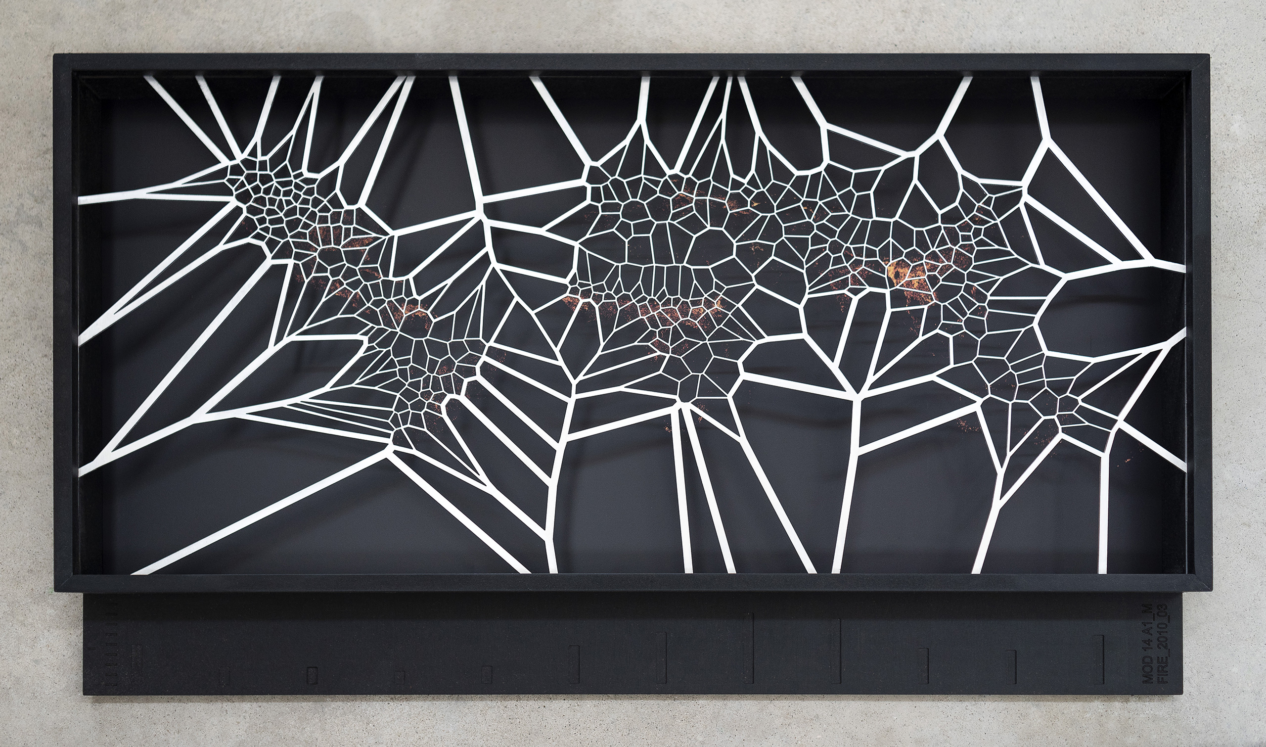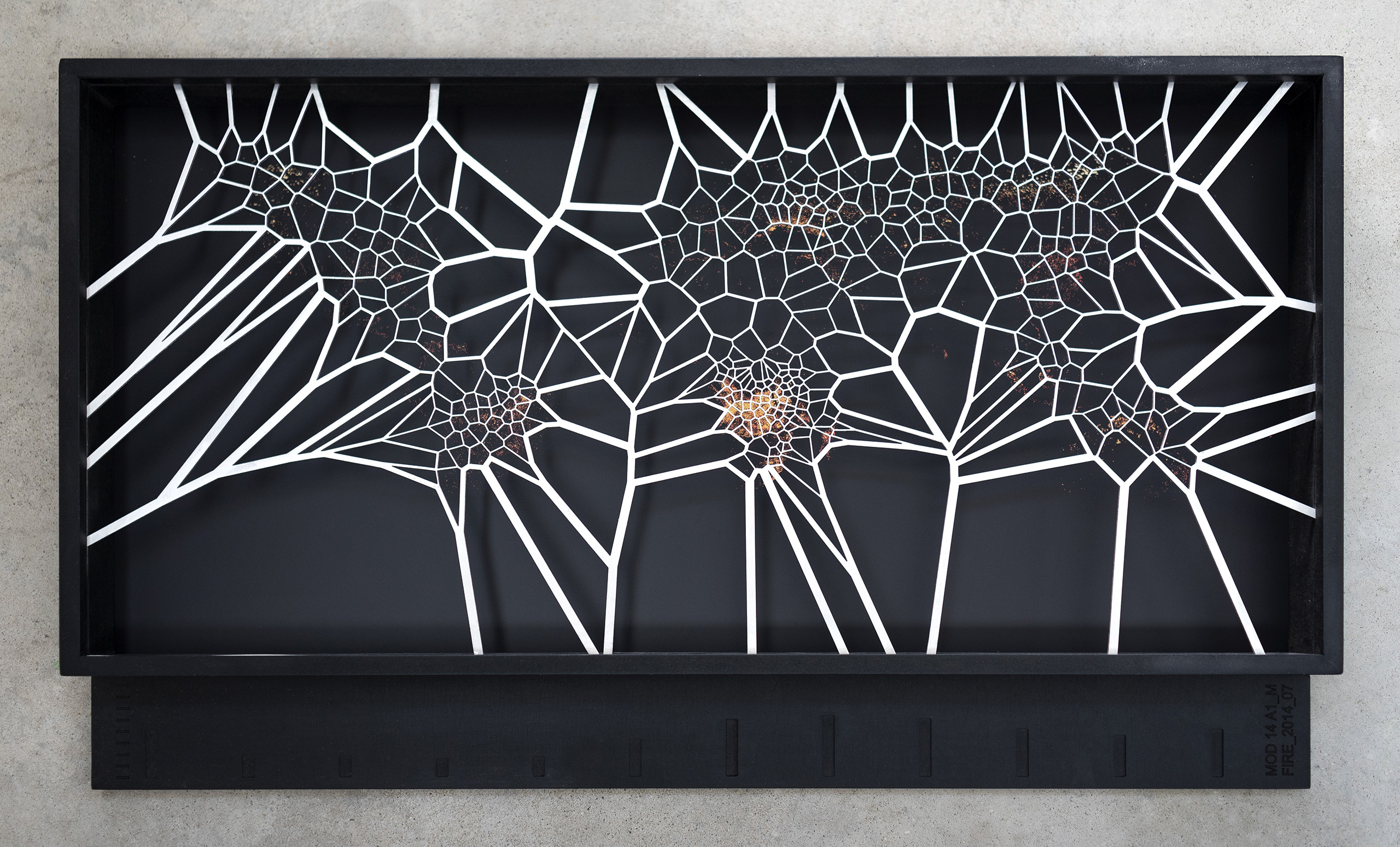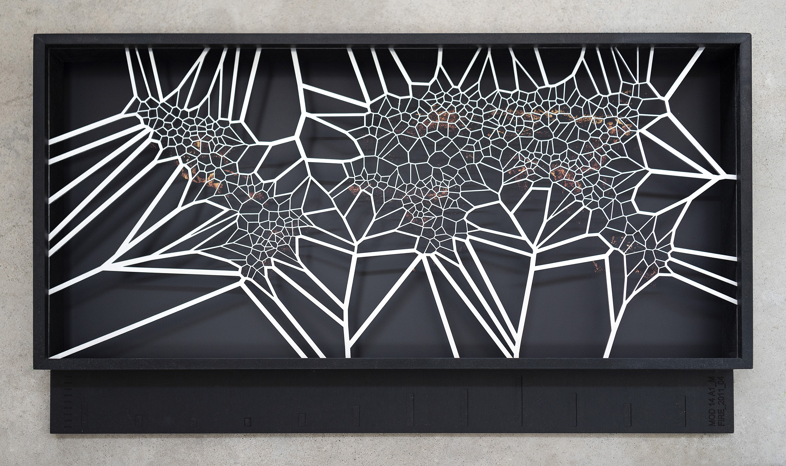 El tercer espacio acoge la serie [MAFD] :: MOD14A1_M_FIRE, formada por diez cartografías diagramáticas, sustentadas en el principio de Teselación de Voronoi, un tipo de geometría computacional generativa basada en el concepto de distancia de métrica euclídea; y creada a partir de imágenes extraidas del Moderate Resolution Imaging Spectroradiometrer (MODIS), a bordo de los satélites que controla la National Aeronautics and Space Administration (NASA).