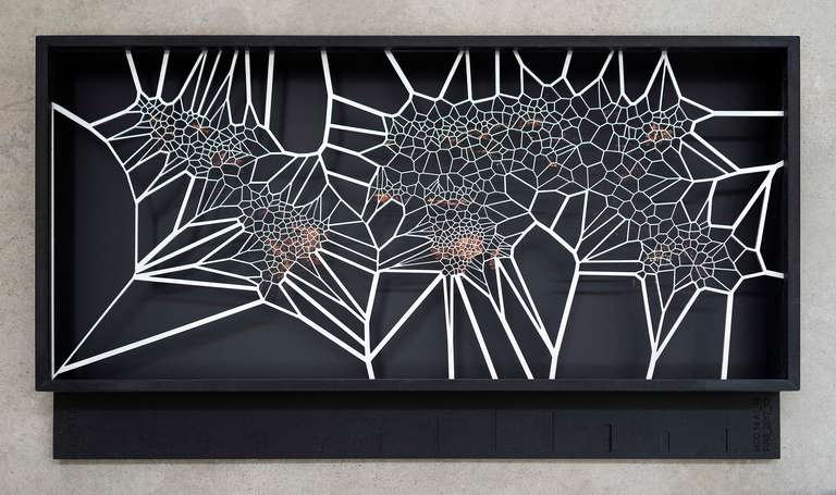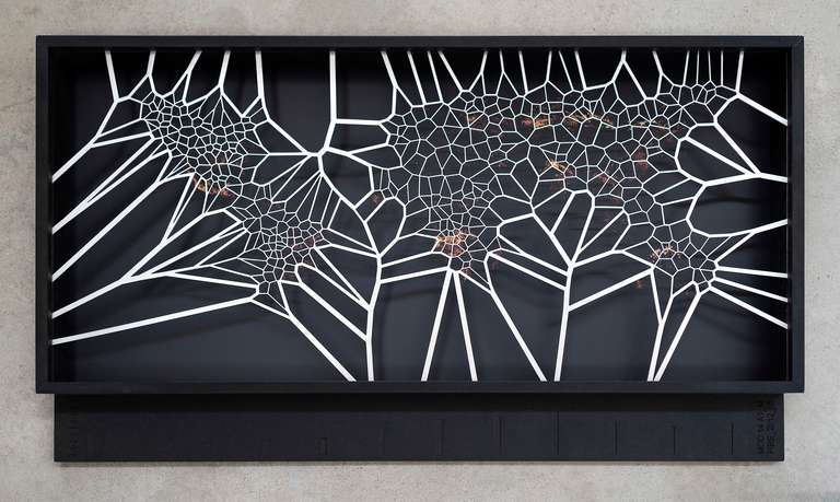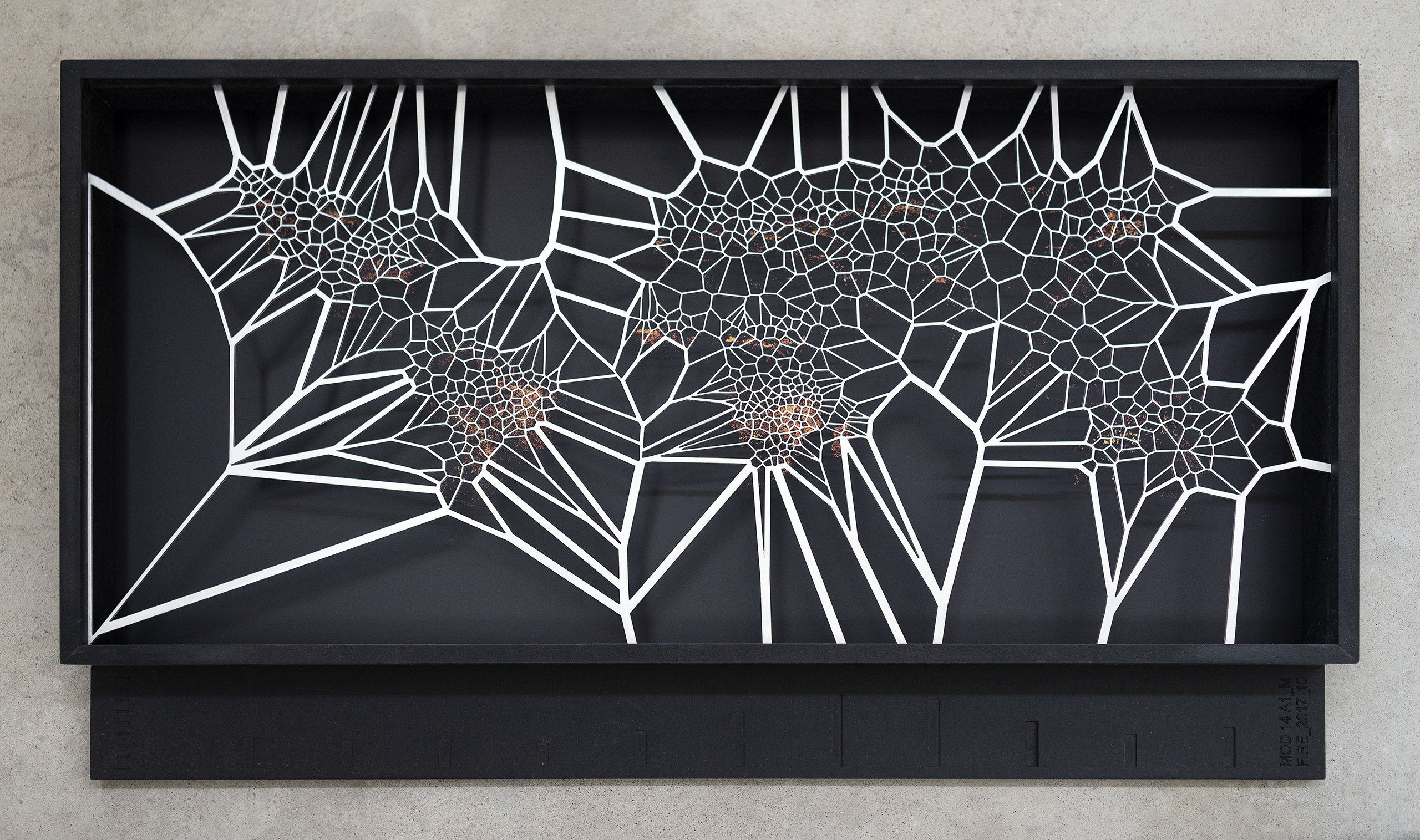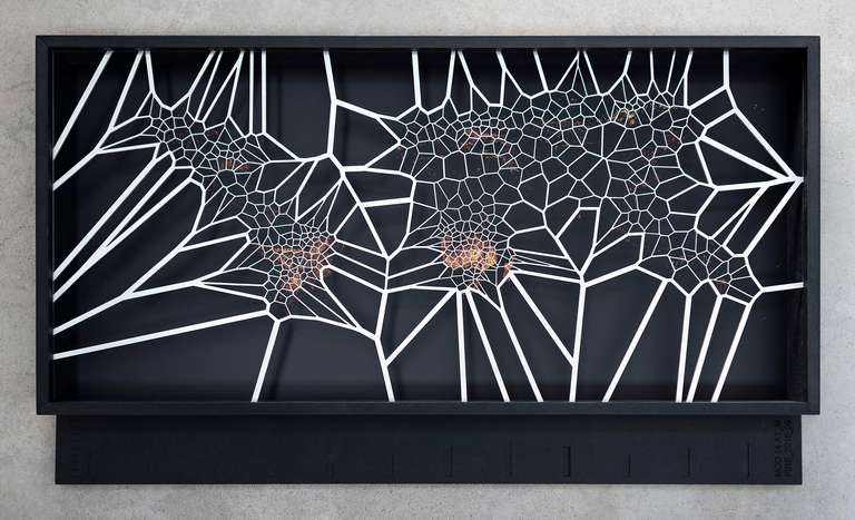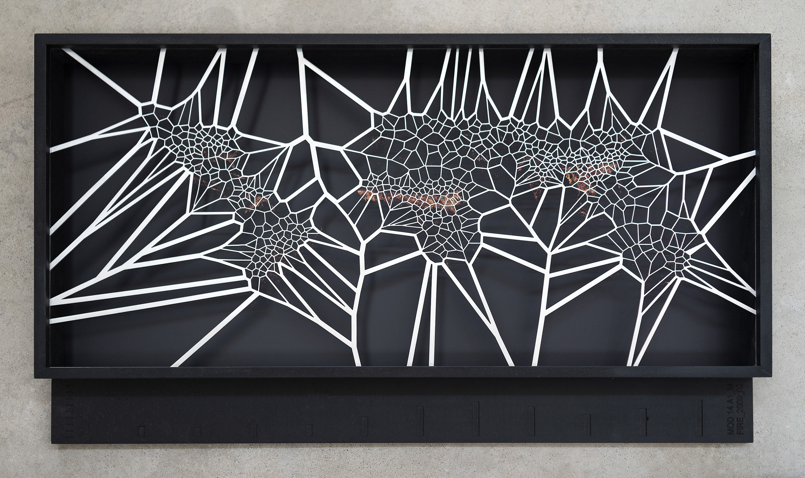 El tercer espacio acoge la serie [MAFD] :: MOD14A1_M_FIRE, formada por diez cartografías diagramáticas, sustentadas en el principio de Teselación de Voronoi, un tipo de geometría computacional generativa basada en el concepto de distancia de métrica euclídea; y creada a partir de imágenes extraidas del Moderate Resolution Imaging Spectroradiometrer (MODIS), a bordo de los satélites que controla la National Aeronautics and Space Administration (NASA).