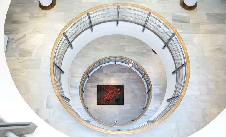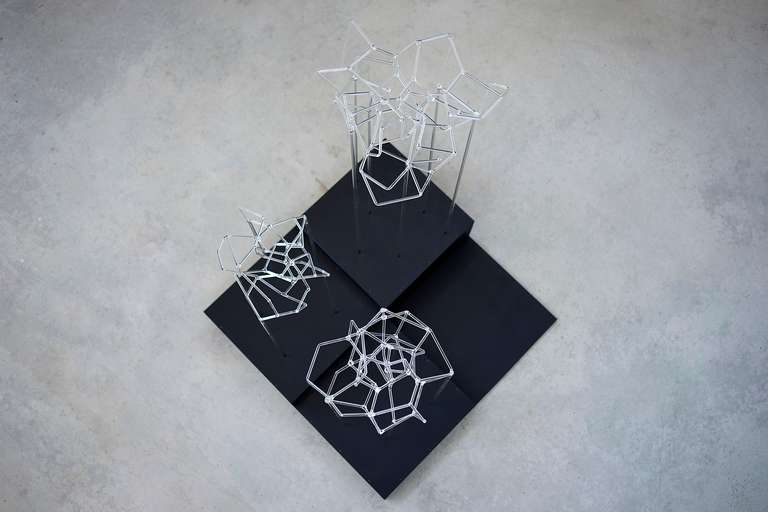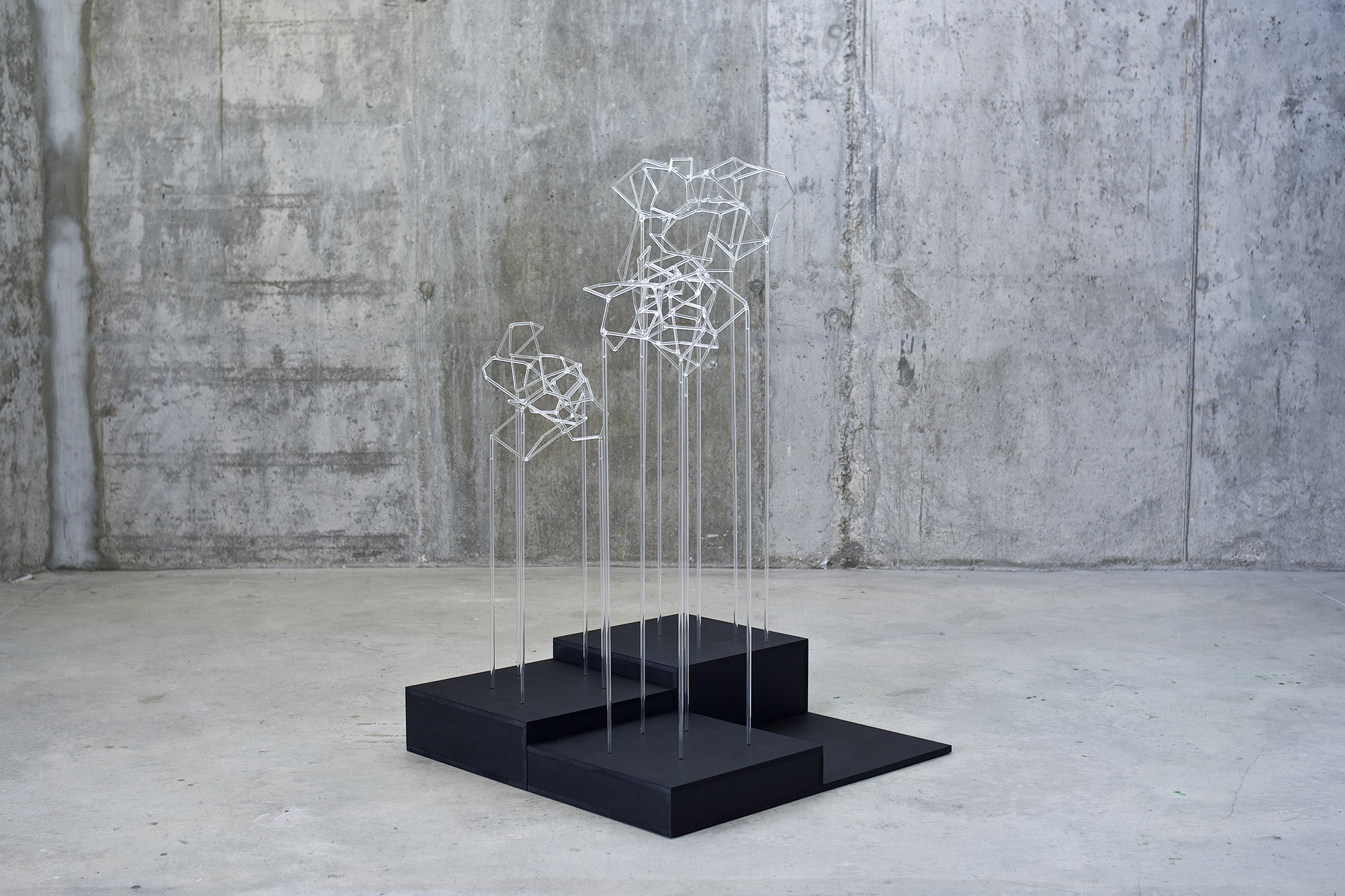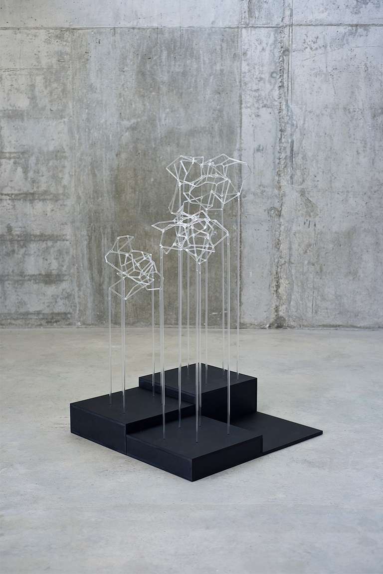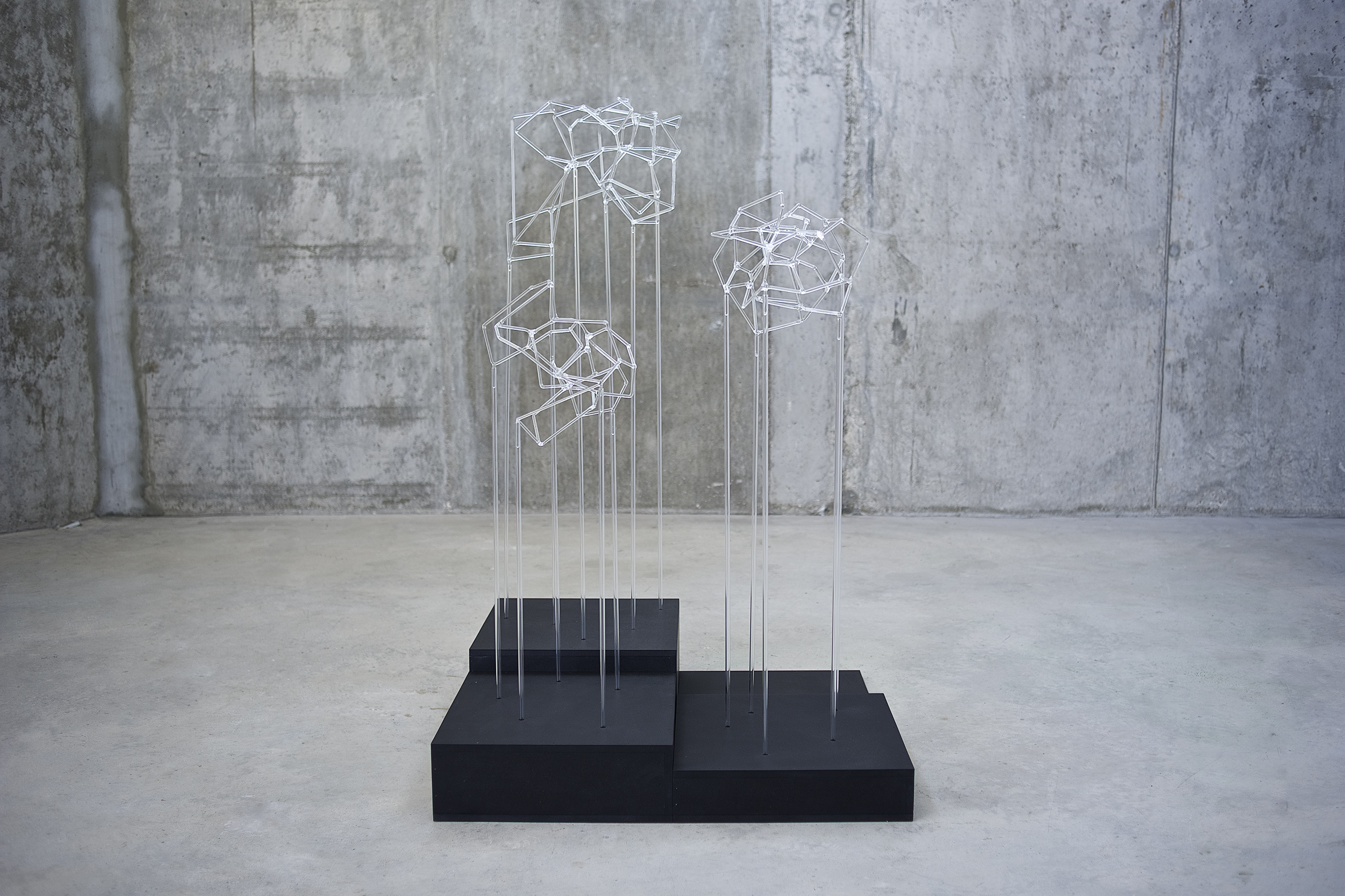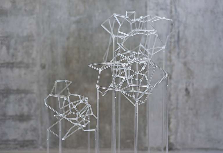 Trees network explora la visualización de una complejidad ordenada en forma de red tridimensional. Una network o red puede considerarse un modelo estructural y organizativo que impregna casi todas las áreas del conocimiento. Al considerar su representación, Trees network enfatiza principalmente el valor de los nodos como espacios de confluencia en la conectividad de los enlaces o vértices. Este conjunto escultórico está formado por tres nodos cristalinos en forma de esferas geométricas que contienen en su interior un rizoma de conexiones, también transparentes, casi intangibles. Estos nodos se sostienen mediante un metafórico tronco de tubos de vidrio. Un paisaje de árboles-redes donde la mirada va de un enfoque micro, de superposiciones y transparencias, a uno macro y relacional, compuesto de enlaces.