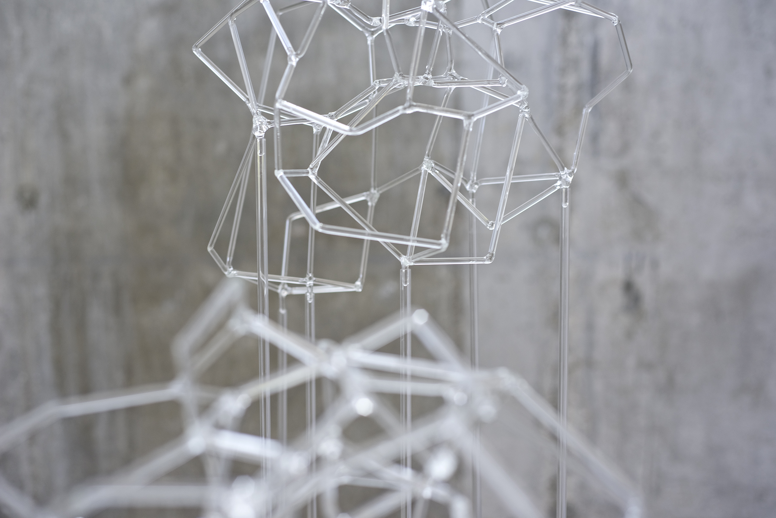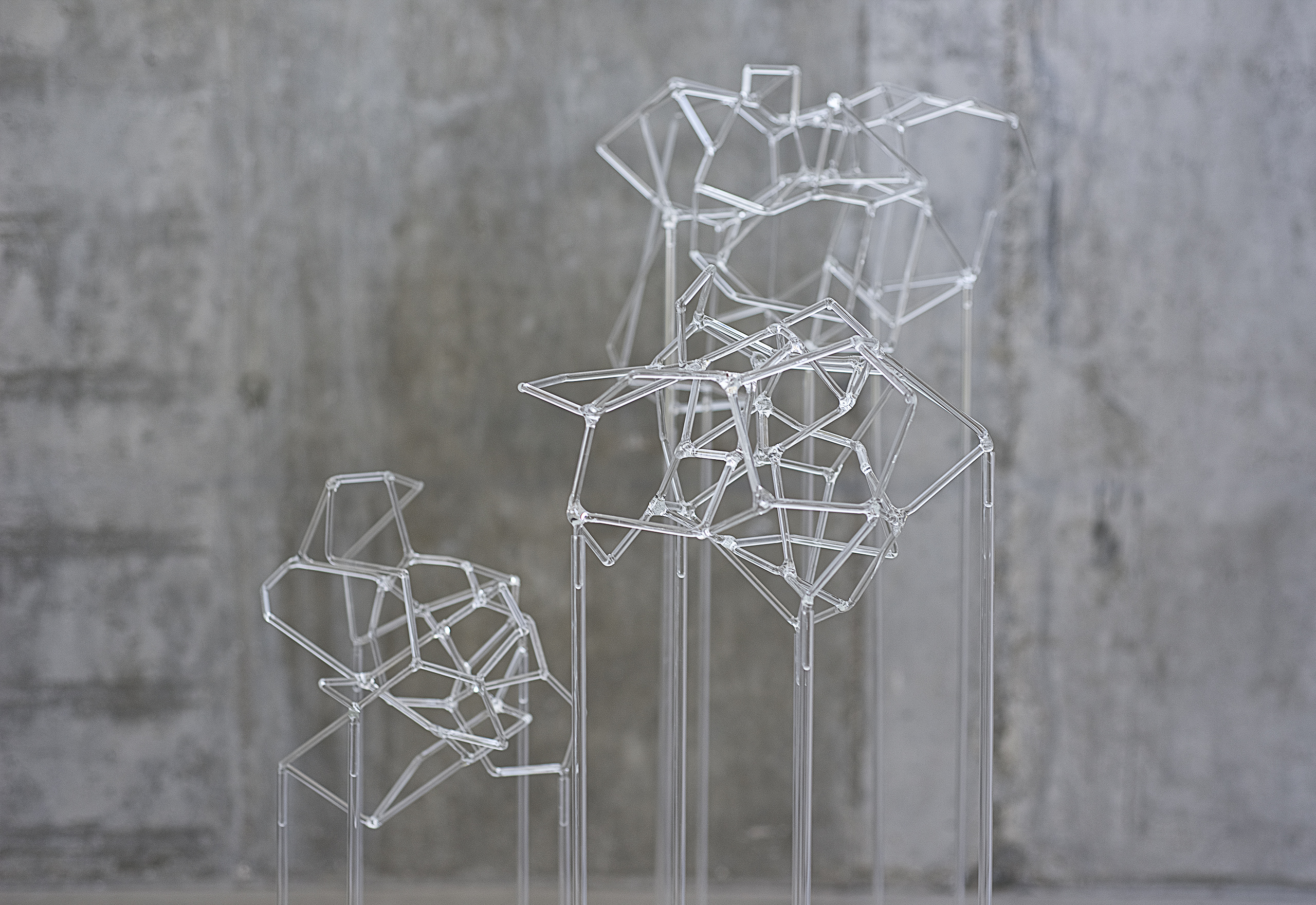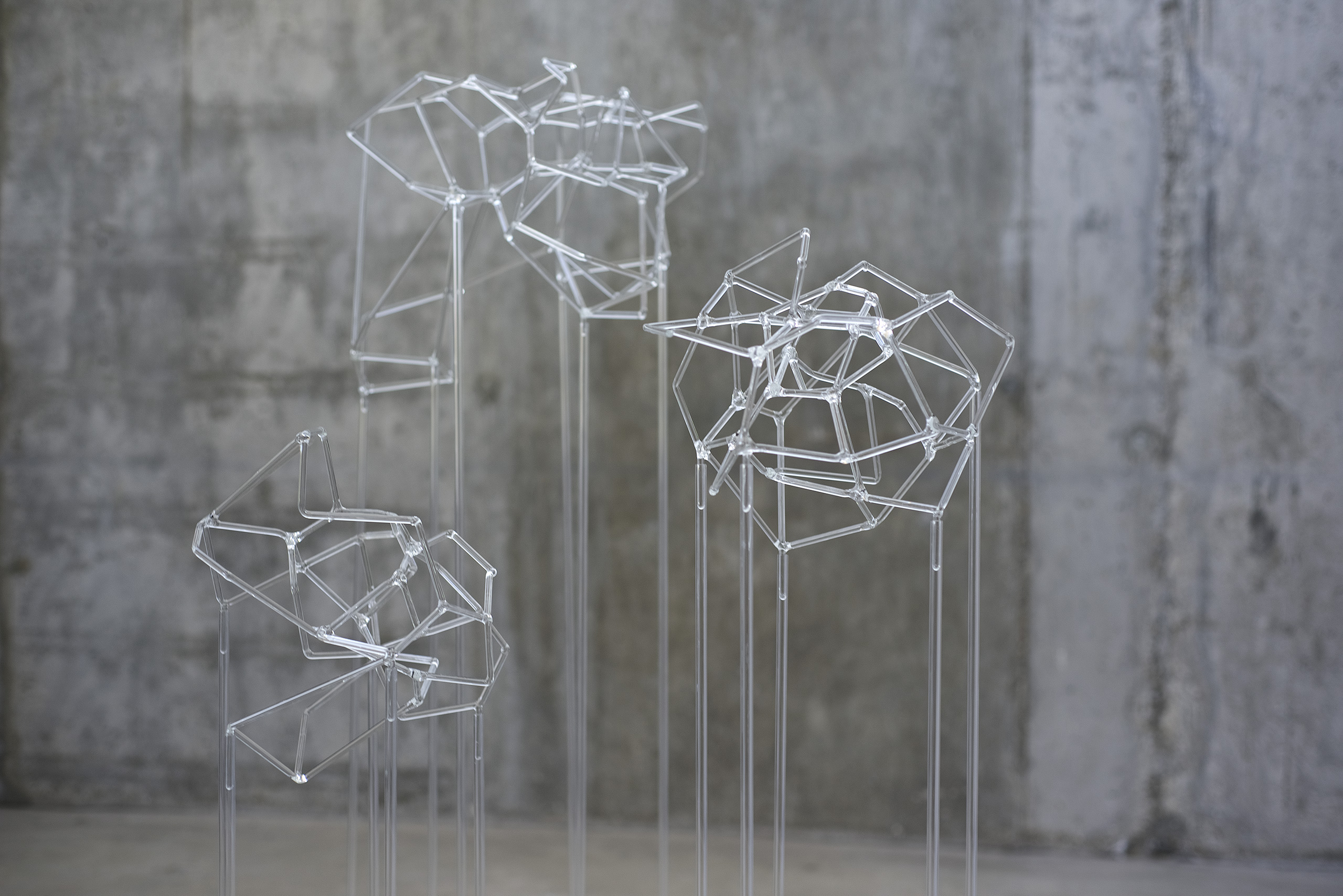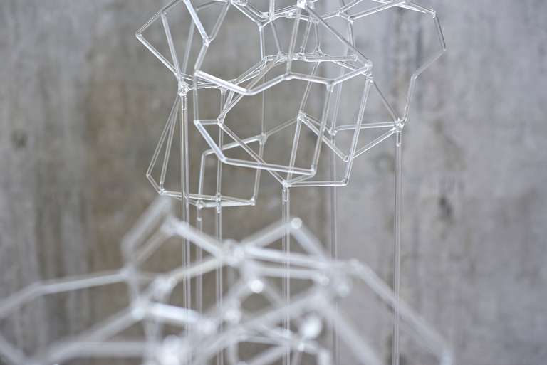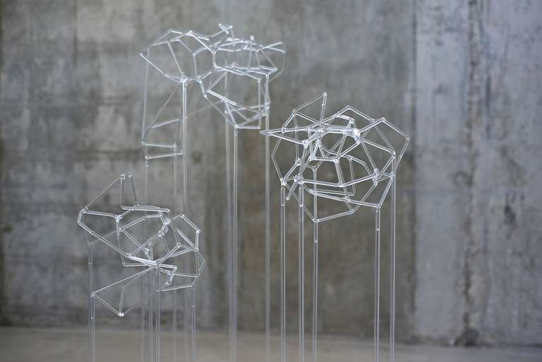 En esta serie confluyen el interés por la exploración matérica del vidrio y las visualizaciones en red que reclaman la apropiación de un espacio instalativo tridimensional.