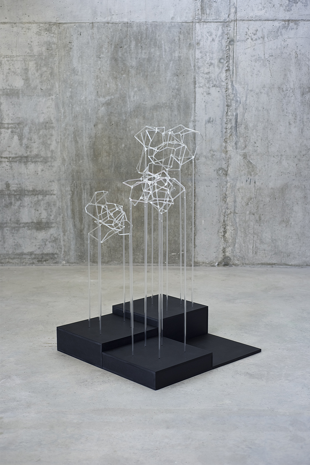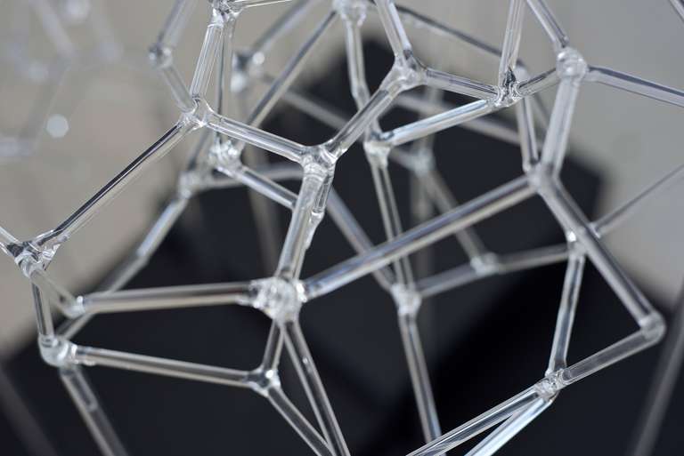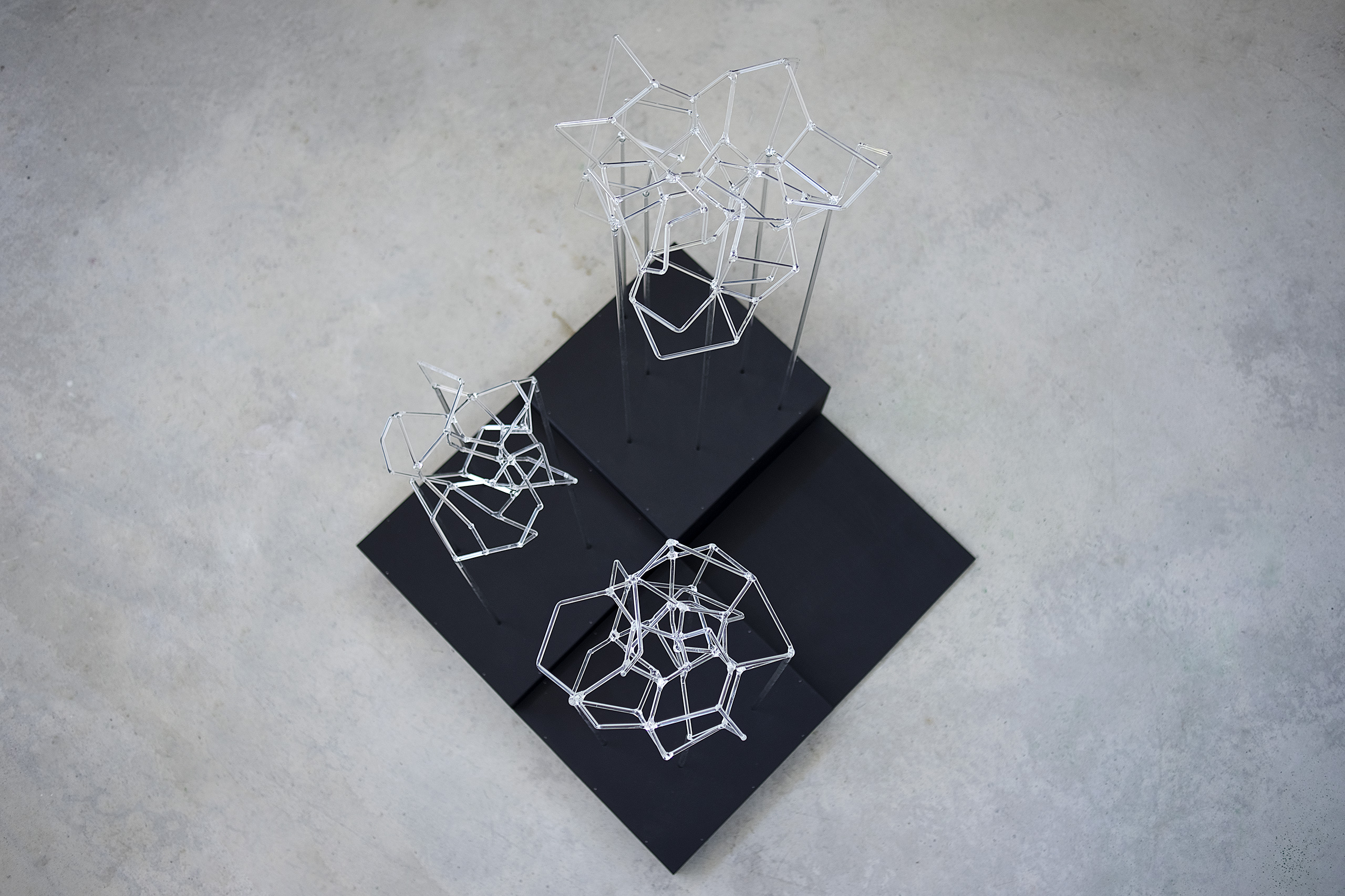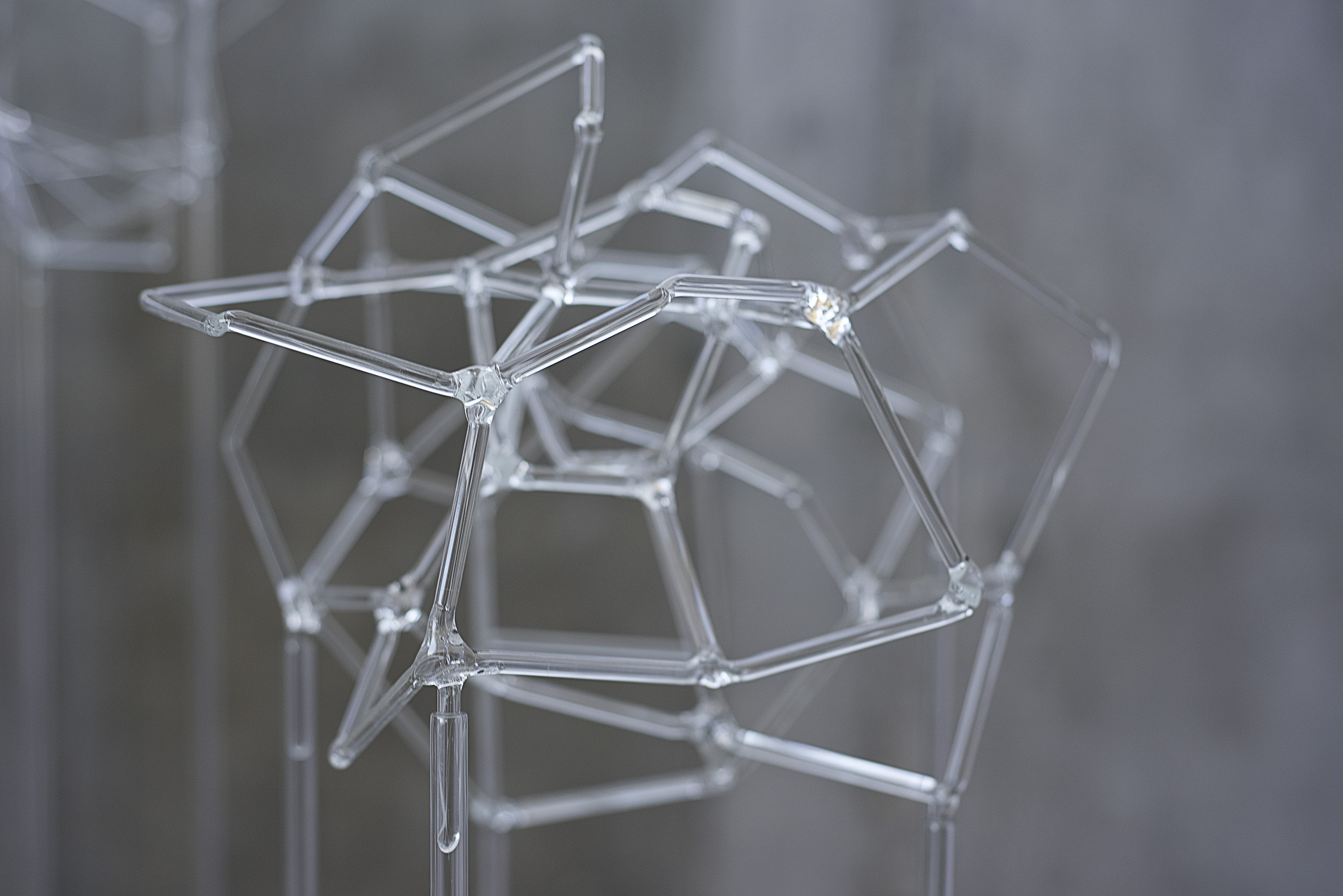 En esta serie confluyen el interés por la exploración matérica del vidrio y las visualizaciones en red que reclaman la apropiación de un espacio instalativo tridimensional.