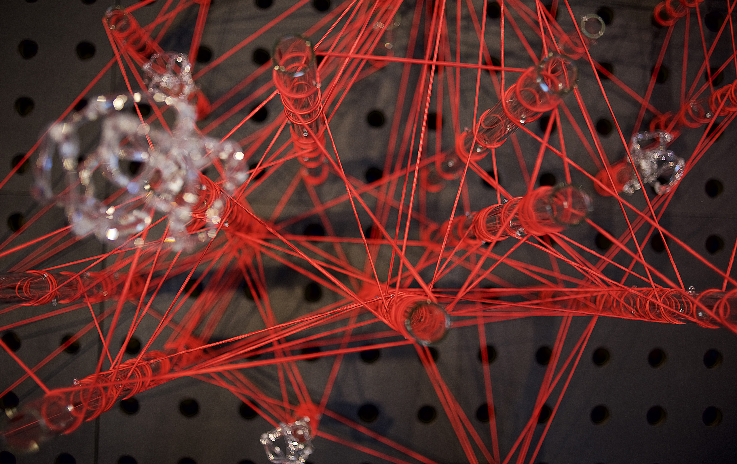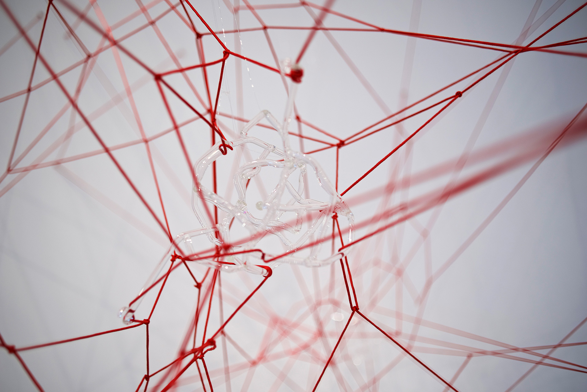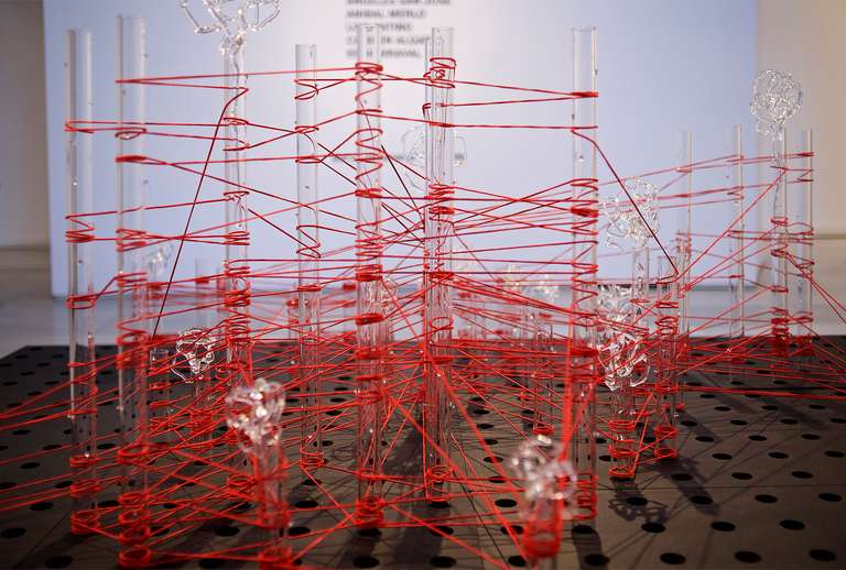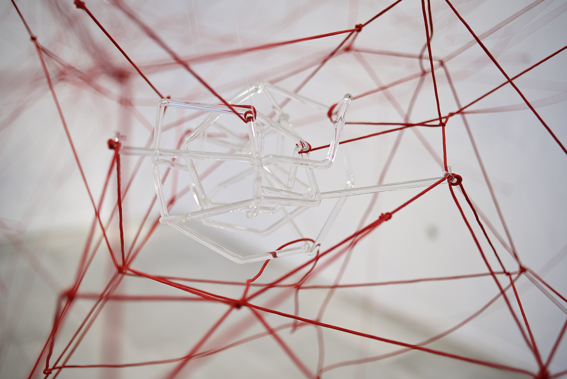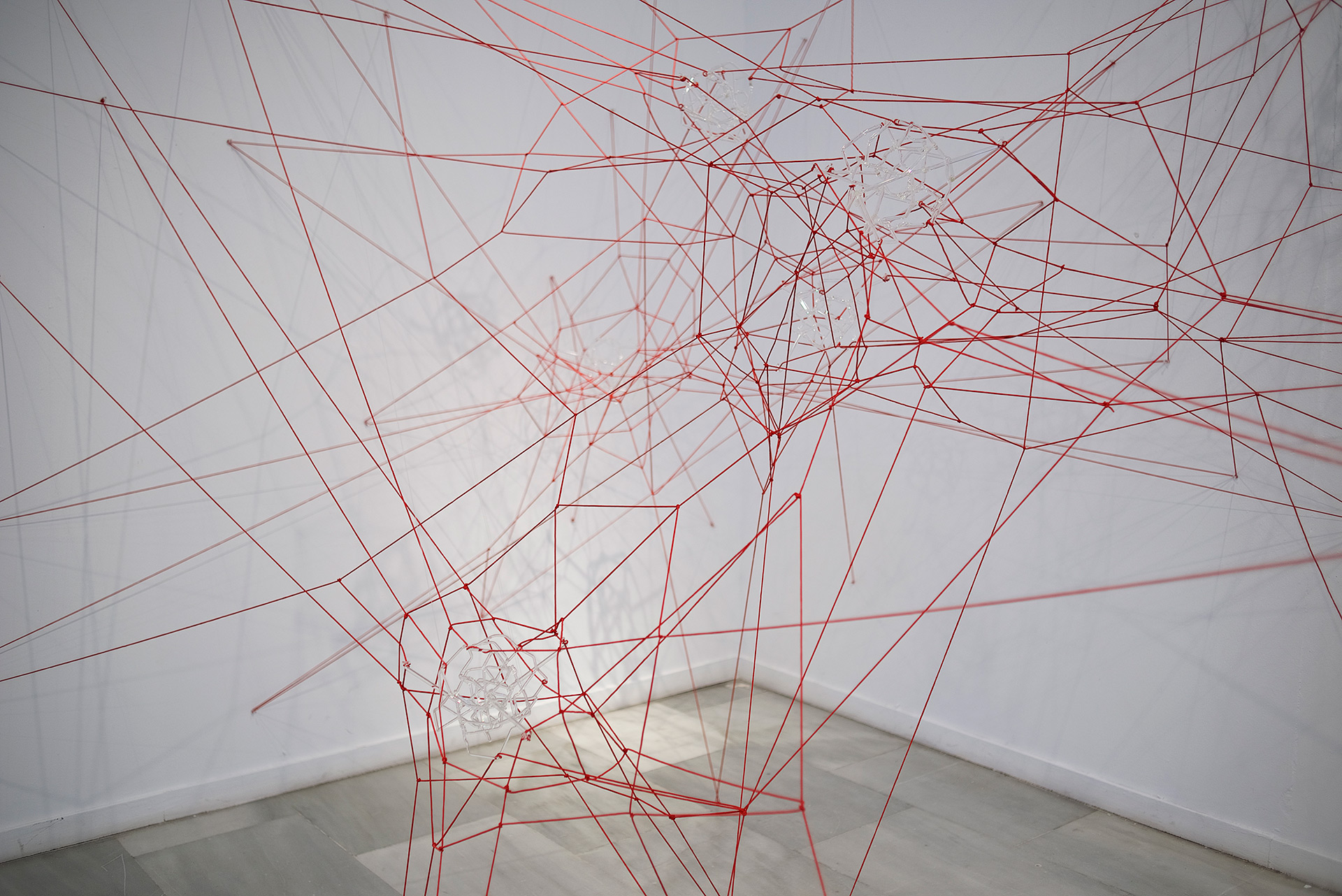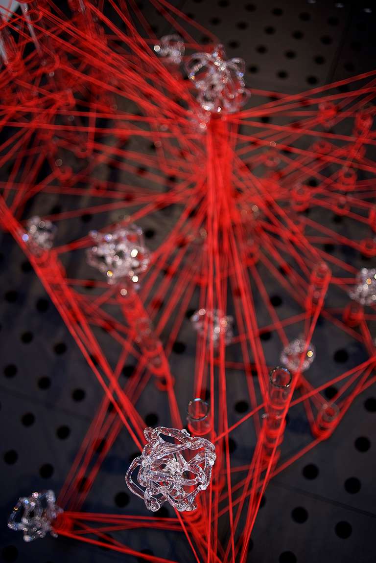 Glassnet explora la visualización de una complejidad ordenada en forma de red tridimensional. Una network o red puede considerarse un modelo estructural y organizativo que impregna casi todas las áreas del conocimiento, nos interesa especialmente el paralelismo existente entre el paisaje urbano y el neuronal. Al considerar su representación, Glassnet enfatiza principalmente el valor de los nodos como espacios de confluencia en la conectividad de los enlaces o vértices. En esta instalación los nodos se representan mediante unas estructuras cristalinas en forma de esfera orgánica que contiene en su interior un rizoma de conexiones, también transparentes, casi intangibles. Estos nodos se suspenden en el aire mediante la tensión de unas gomas rojas que generan un entramado complejo de líneas y conexiones. Un paisaje de redes donde la mirada va de un enfoque micro de nodos-neuronas-ciudades a uno macro y relacional de enlaces-cerebro- cartografías.