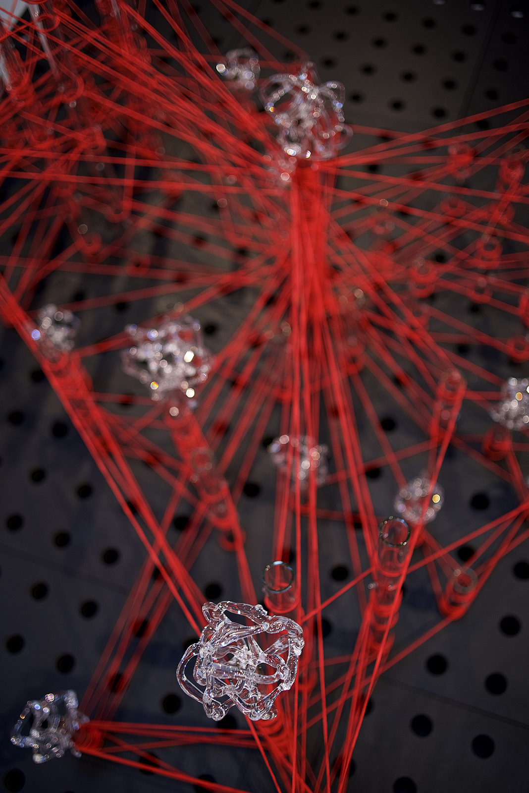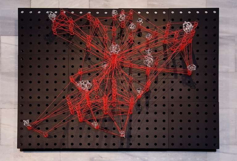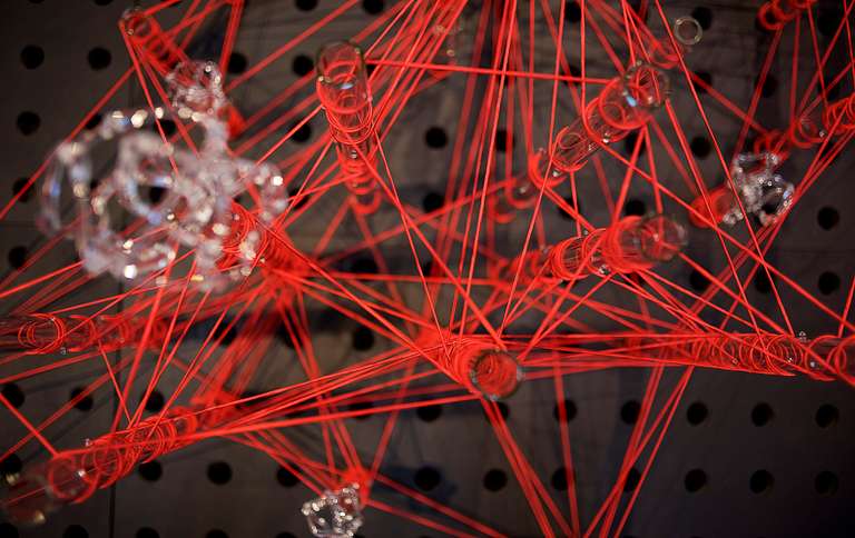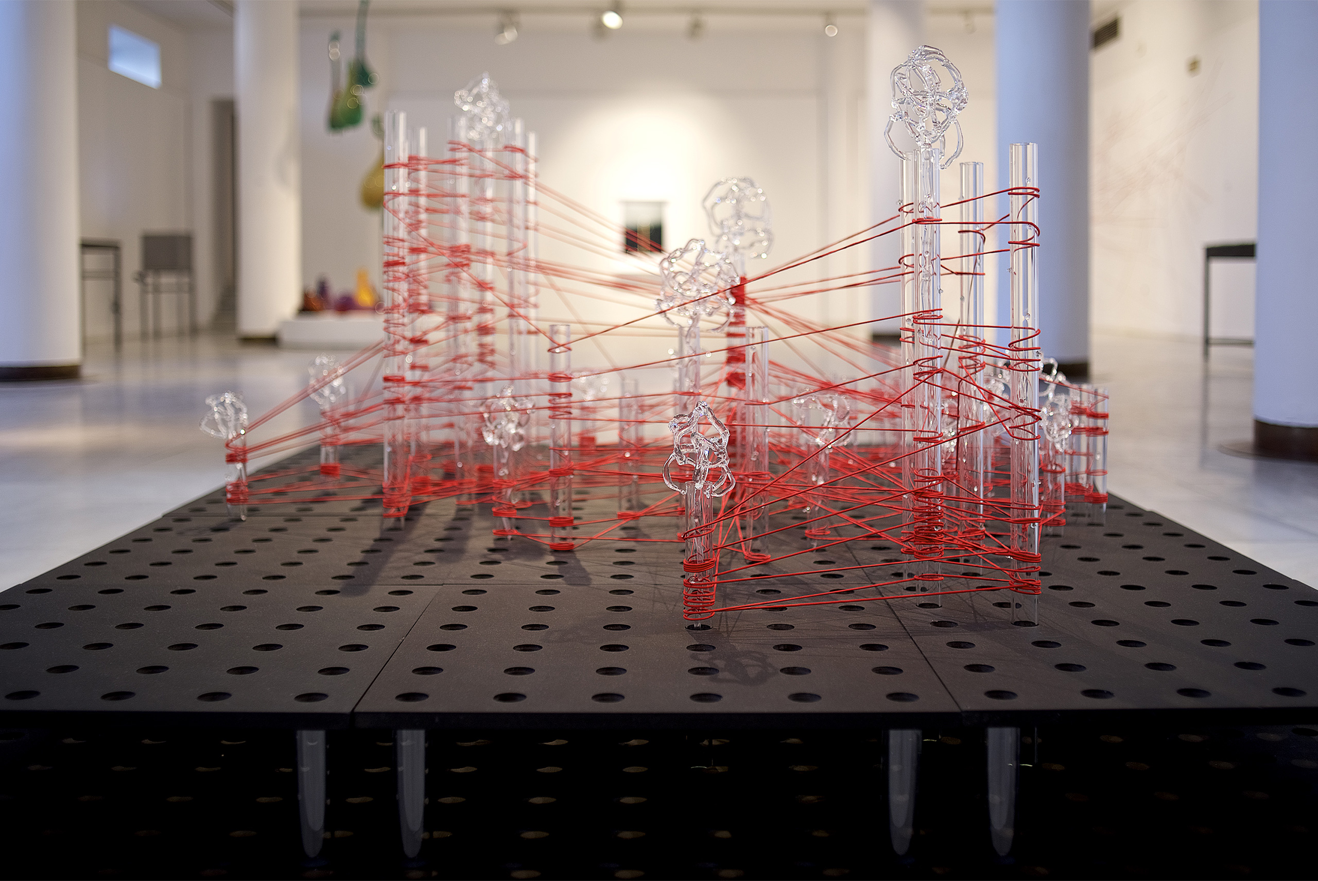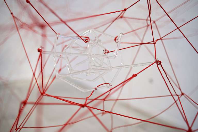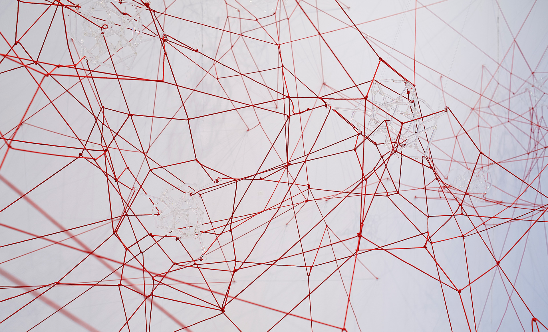Glassnet explora la visualización de una complejidad ordenada en forma de red tridimensional. Una network o red puede considerarse un modelo estructural y organizativo que impregna casi todas las áreas del conocimiento, nos interesa especialmente el paralelismo existente entre el paisaje urbano y el neuronal. Al considerar su representación, Glassnet enfatiza principalmente el valor de los nodos como espacios de confluencia en la conectividad de los enlaces o vértices. En esta instalación los nodos se representan mediante unas estructuras cristalinas en forma de esfera orgánica que contiene en su interior un rizoma de conexiones, también transparentes, casi intangibles. Estos nodos se suspenden en el aire mediante la tensión de unas gomas rojas que generan un entramado complejo de líneas y conexiones. Un paisaje de redes donde la mirada va de un enfoque micro de nodos-neuronas-ciudades a uno macro y relacional de enlaces-cerebro- cartografías.