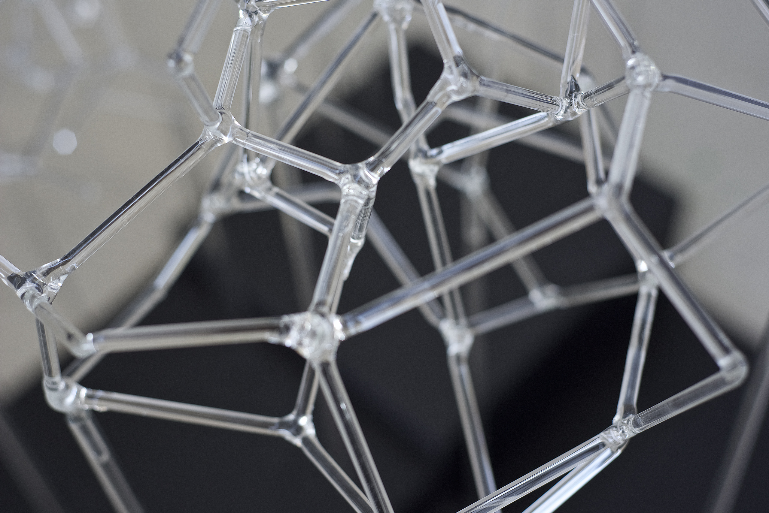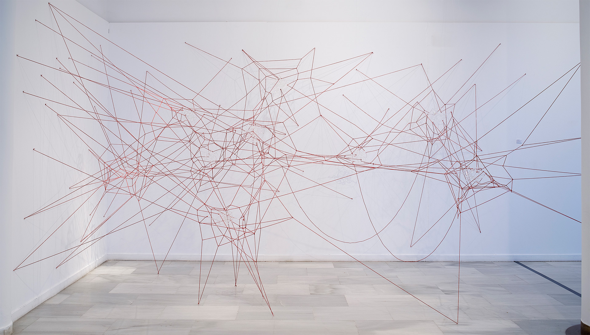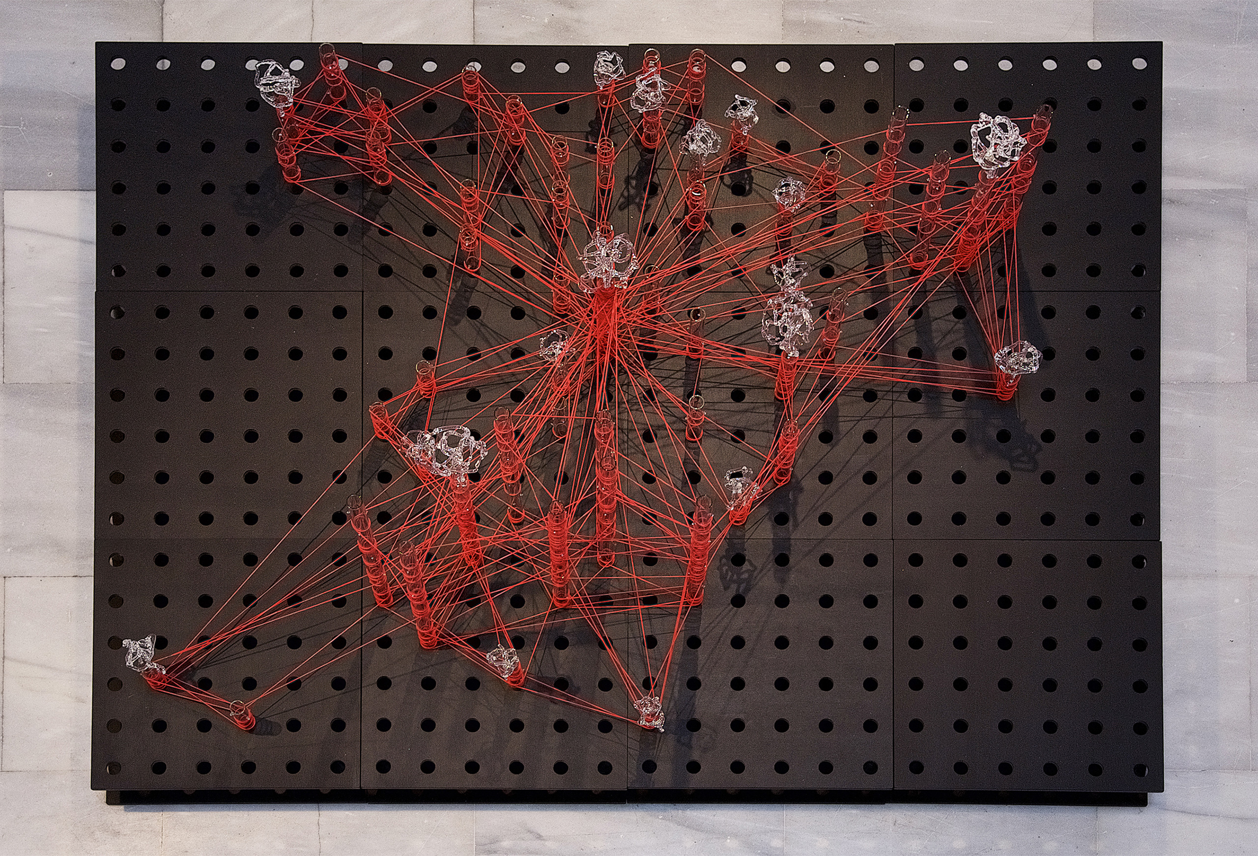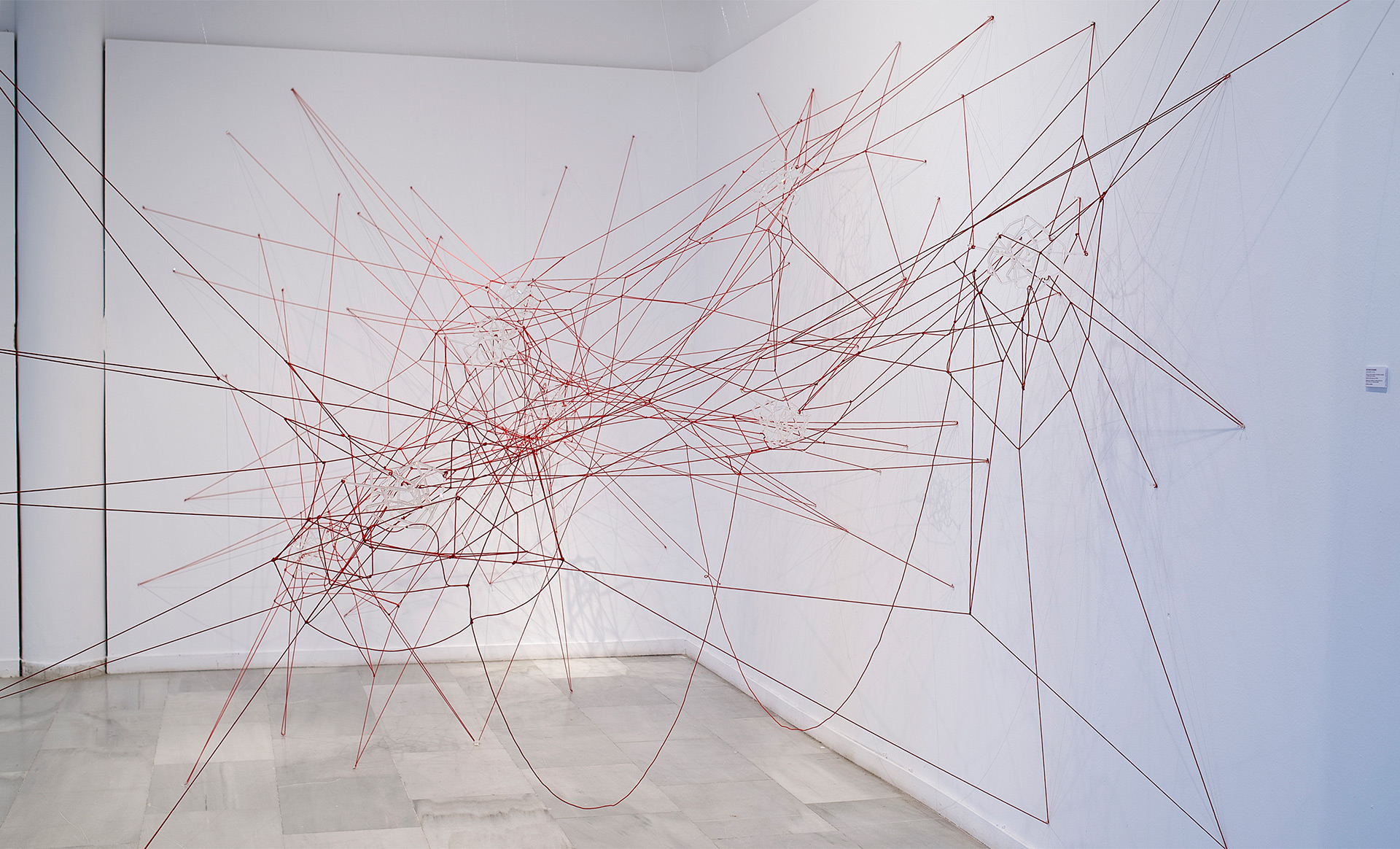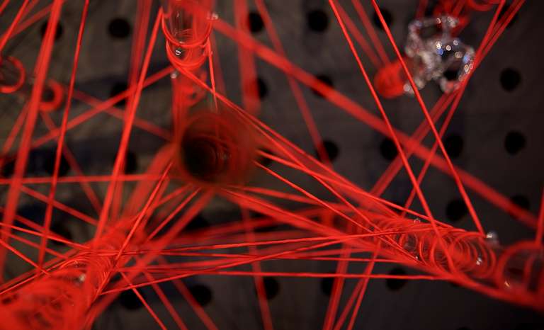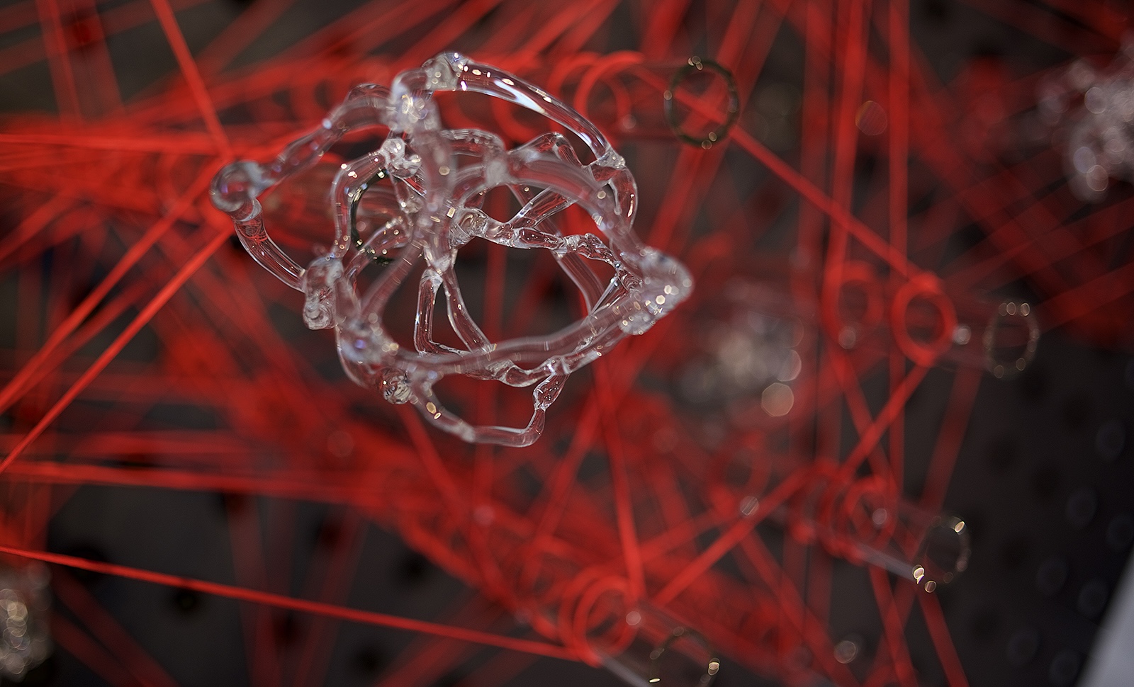Glassnet explora la visualización de una complejidad ordenada en forma de red tridimensional. Una network o red puede considerarse un modelo estructural y organizativo que impregna casi todas las áreas del conocimiento, nos interesa especialmente el paralelismo existente entre el paisaje urbano y el neuronal. Al considerar su representación, Glassnet enfatiza principalmente el valor de los nodos como espacios de confluencia en la conectividad de los enlaces o vértices. En esta instalación los nodos se representan mediante unas estructuras cristalinas en forma de esfera orgánica que contiene en su interior un rizoma de conexiones, también transparentes, casi intangibles. Estos nodos se suspenden en el aire mediante la tensión de unas gomas rojas que generan un entramado complejo de líneas y conexiones. Un paisaje de redes donde la mirada va de un enfoque micro de nodos-neuronas-ciudades a uno macro y relacional de enlaces-cerebro- cartografías.