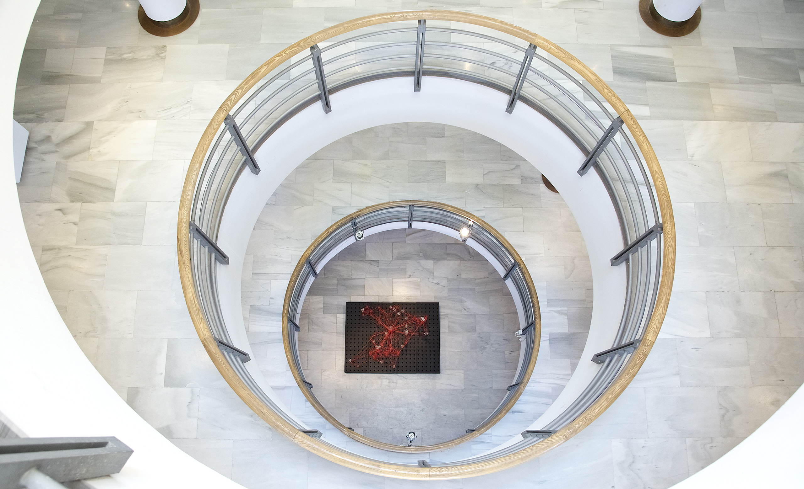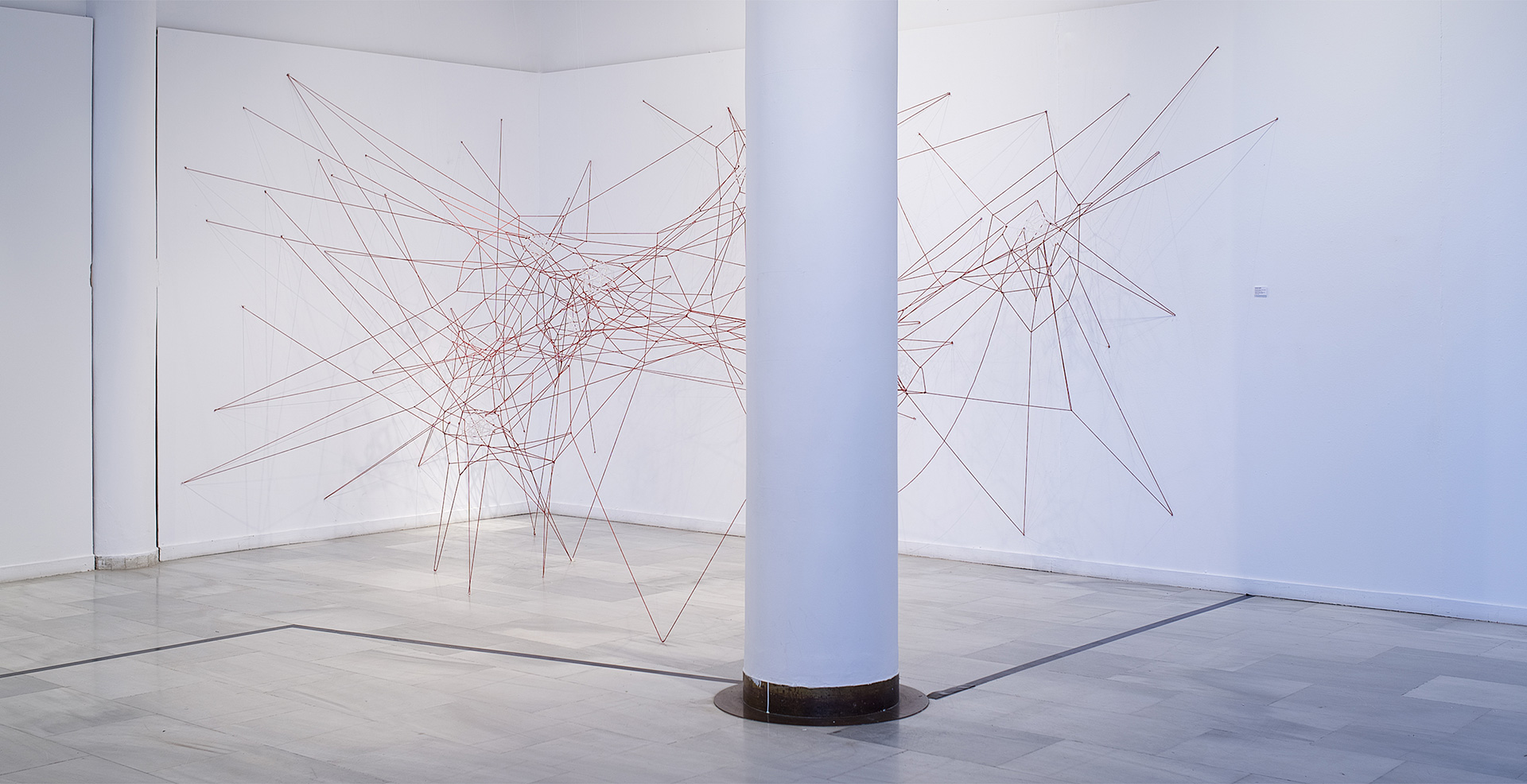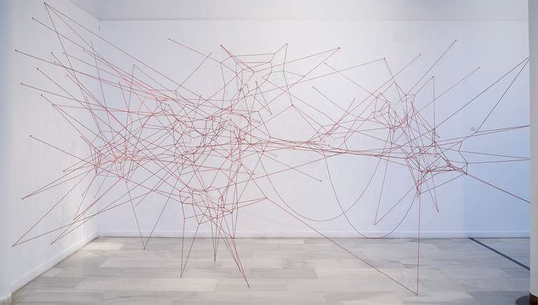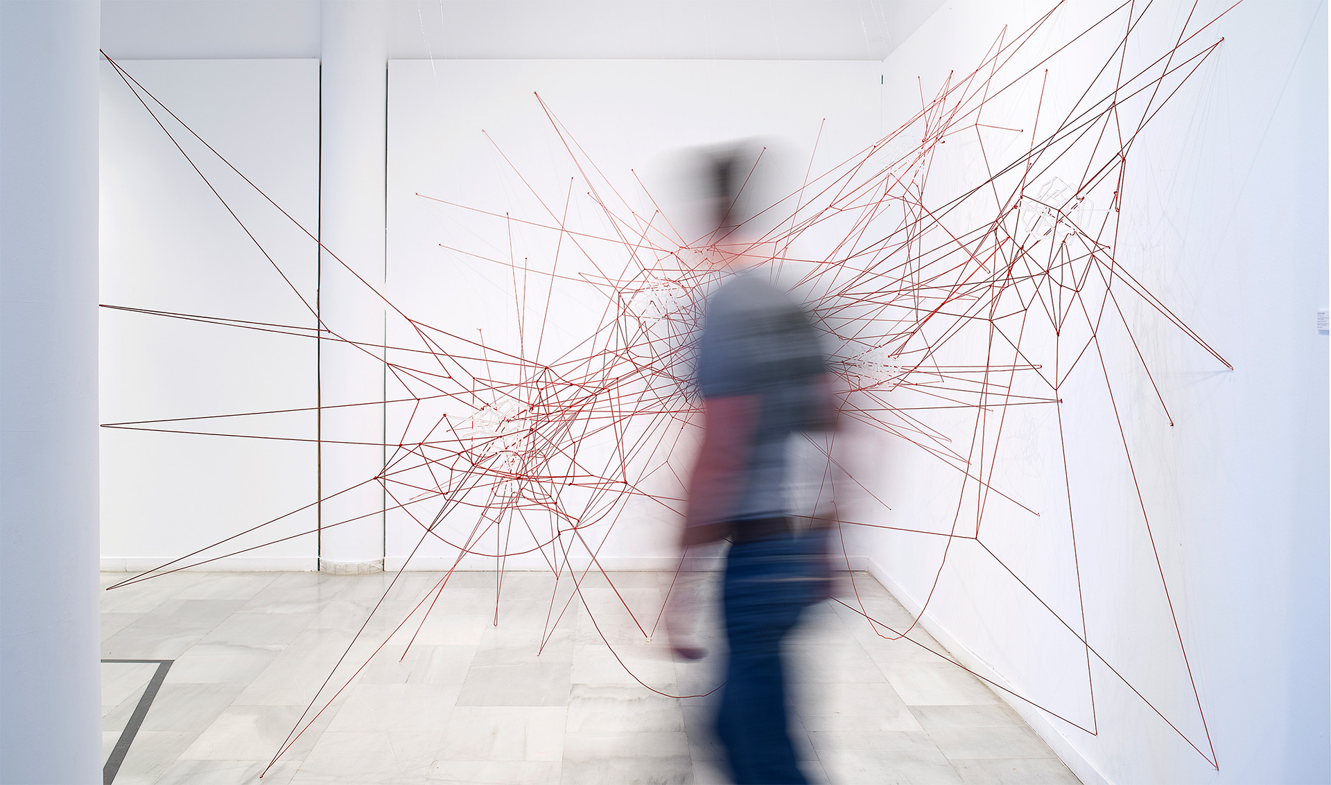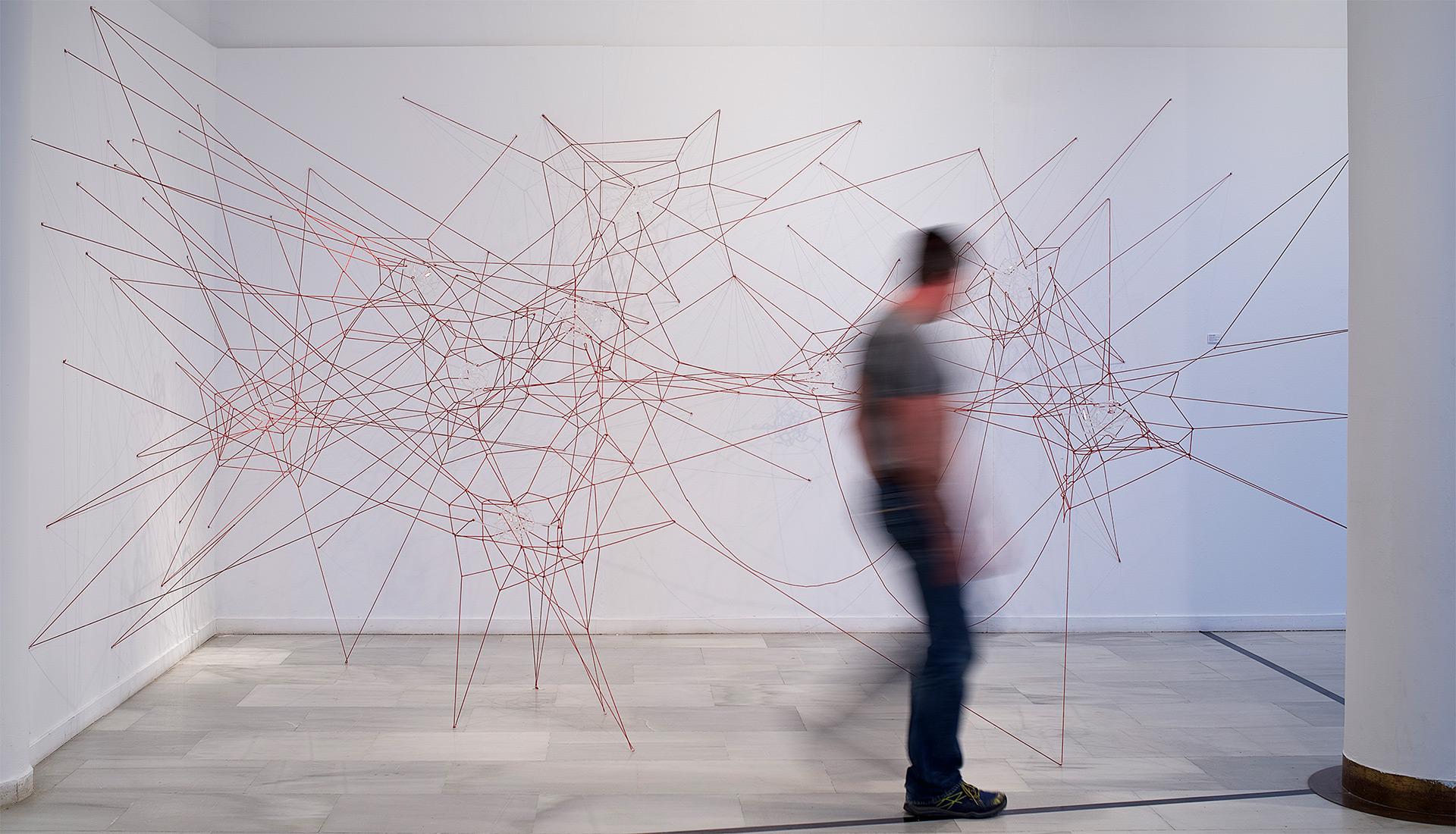 Glassnet explora la visualización de una complejidad ordenada en forma de red tridimensional. Una network o red puede considerarse un modelo estructural y organizativo que impregna casi todas las áreas del conocimiento, nos interesa especialmente el paralelismo existente entre el paisaje urbano y el neuronal. Al considerar su representación, Glassnet enfatiza principalmente el valor de los nodos como espacios de confluencia en la conectividad de los enlaces o vértices. En esta instalación los nodos se representan mediante unas estructuras cristalinas en forma de esfera orgánica que contiene en su interior un rizoma de conexiones, también transparentes, casi intangibles. Estos nodos se suspenden en el aire mediante la tensión de unas gomas rojas que generan un entramado complejo de líneas y conexiones. Un paisaje de redes donde la mirada va de un enfoque micro de nodos-neuronas-ciudades a uno macro y relacional de enlaces-cerebro- cartografías.