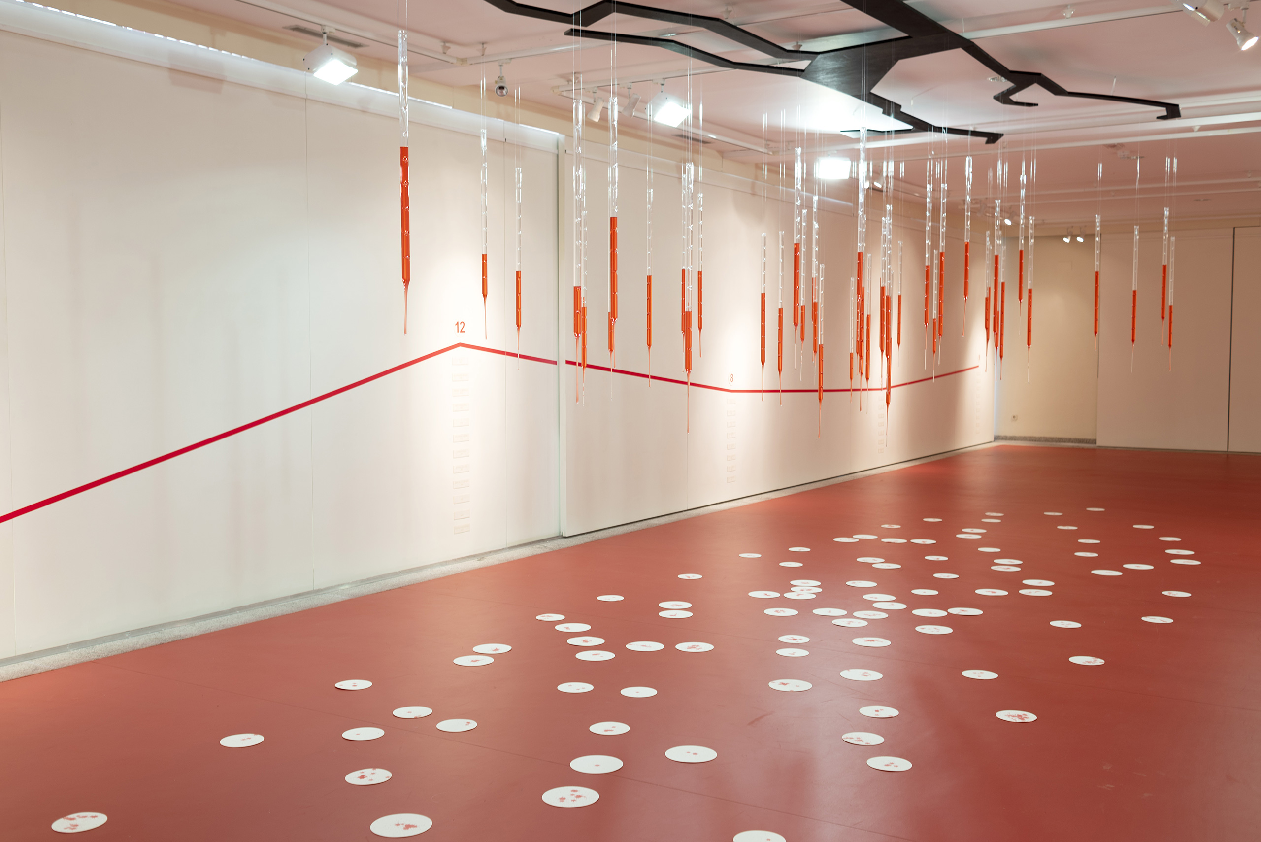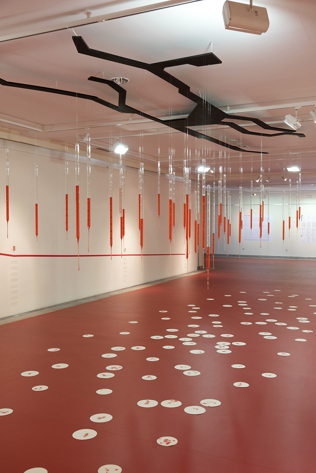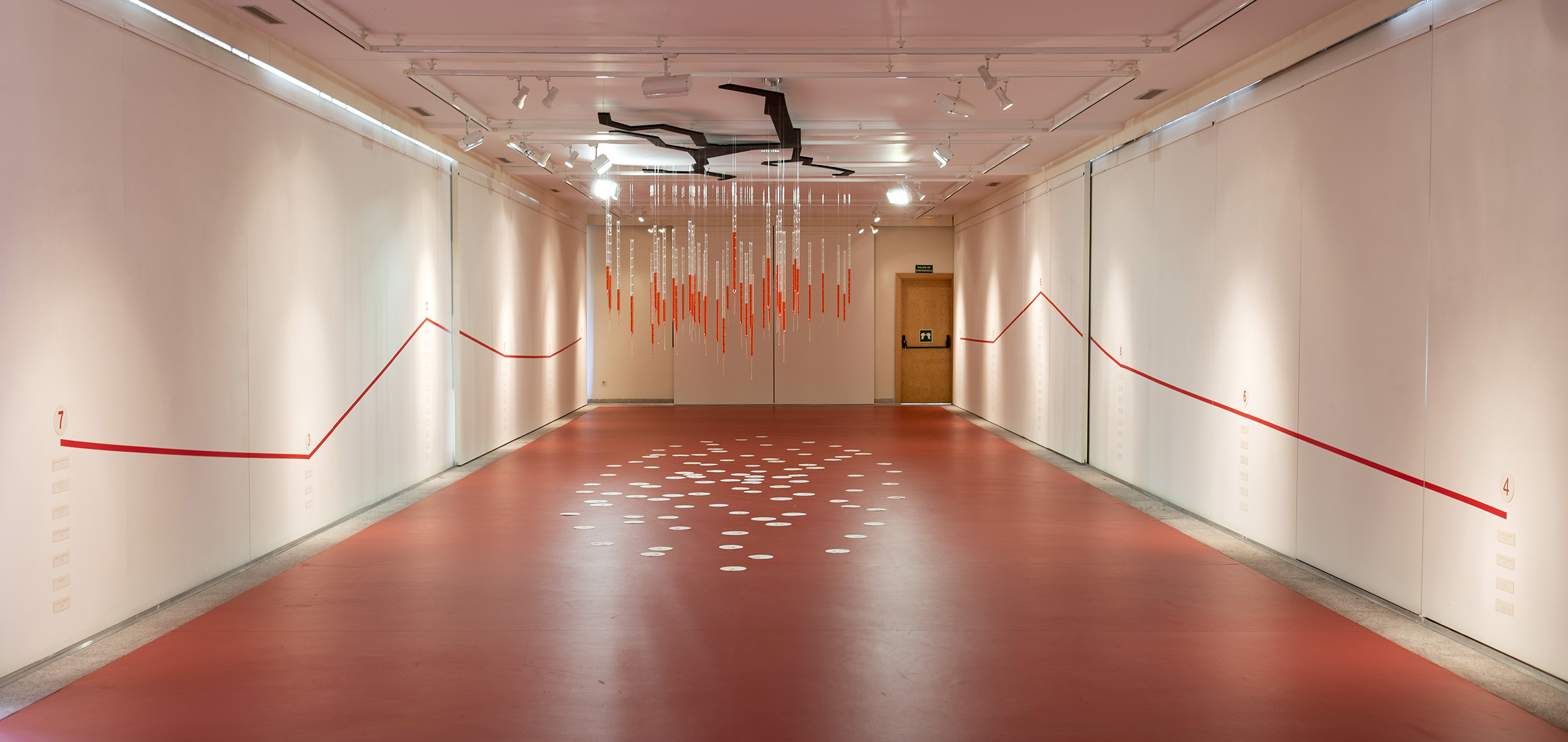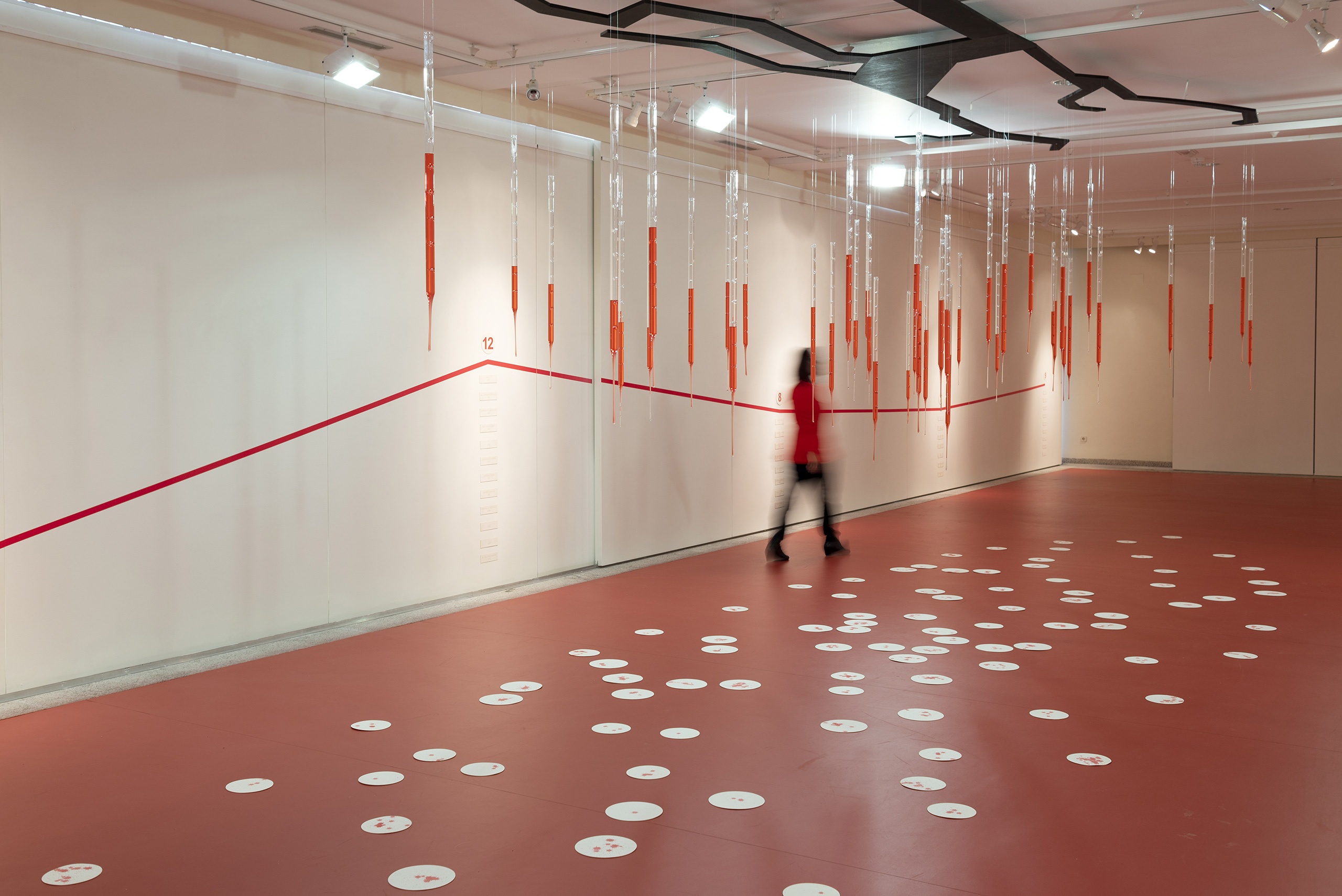 Suspendidas en el espacio, 47 probetas cristalinas, que albergan en su interior un líquido de intenso color rojizo, hacen alusión a los asesinatos clasificados dentro de la tipología de feminicidio íntimo oficial (mujeres asesinadas por un hombre con el que mantenían o habían mantenido una relación). El nivel de líquido de las probetas nos indica el rango de edad de fallecimiento. Sobre el lienzo vertical la sala y a ambos lados, se articula un diagrama de líneas, en cuyos nodos confluyen en el número de asesinatos (por mes) ocurridos a lo largo de todo el año; hasta sumar una cifra total de 97. Cada mes se completa con el nombre, apellido y edad de cada una de las víctimas. En el plano horizontal del suelo, una constelación de 97 círculos blancos teñidos por una mancha roja en su centro refuerza la instalación, a modo de gráfico de dispersión.
