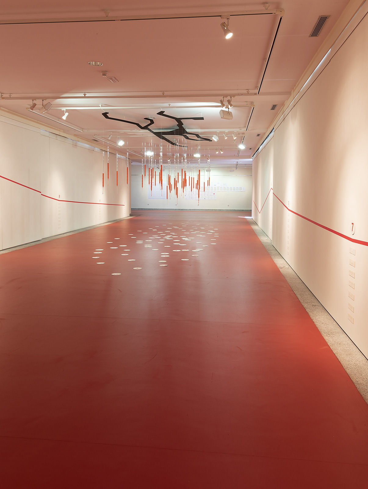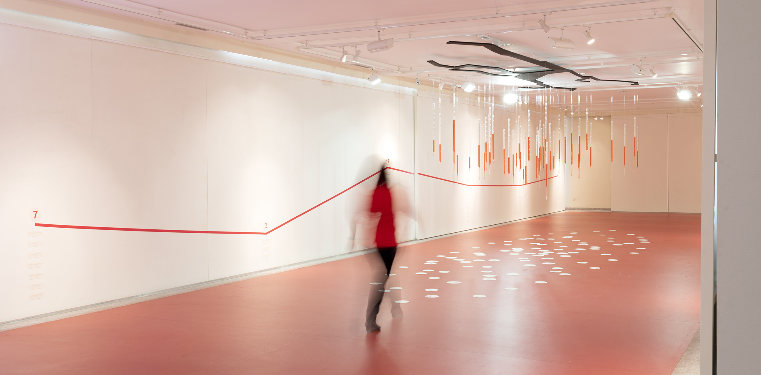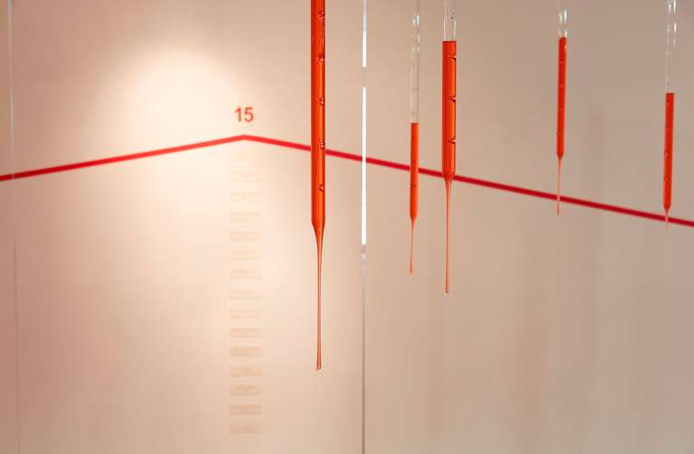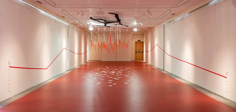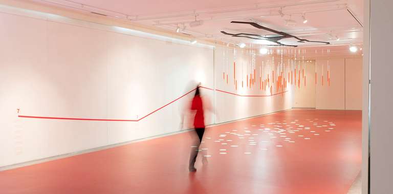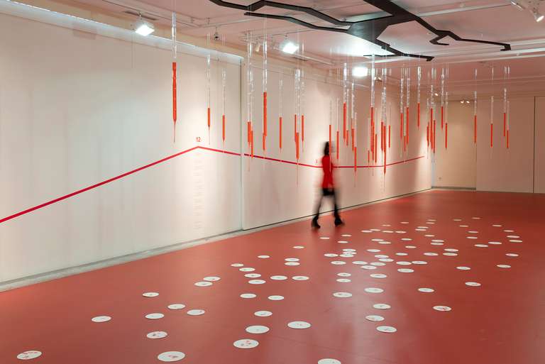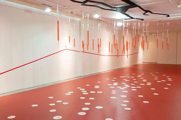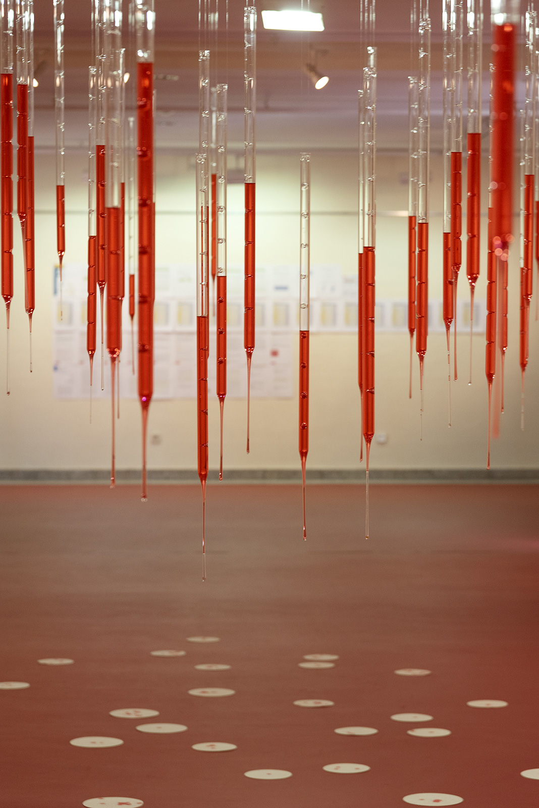 Suspendidas en el espacio, 47 probetas cristalinas, que albergan en su interior un líquido de intenso color rojizo, hacen alusión a los asesinatos clasificados dentro de la tipología de feminicidio íntimo oficial (mujeres asesinadas por un hombre con el que mantenían o habían mantenido una relación). El nivel de líquido de las probetas nos indica el rango de edad de fallecimiento. Sobre el lienzo vertical la sala y a ambos lados, se articula un diagrama de líneas, en cuyos nodos confluyen en el número de asesinatos (por mes) ocurridos a lo largo de todo el año; hasta sumar una cifra total de 97. Cada mes se completa con el nombre, apellido y edad de cada una de las víctimas. En el plano horizontal del suelo, una constelación de 97 círculos blancos teñidos por una mancha roja en su centro refuerza la instalación, a modo de gráfico de dispersión.