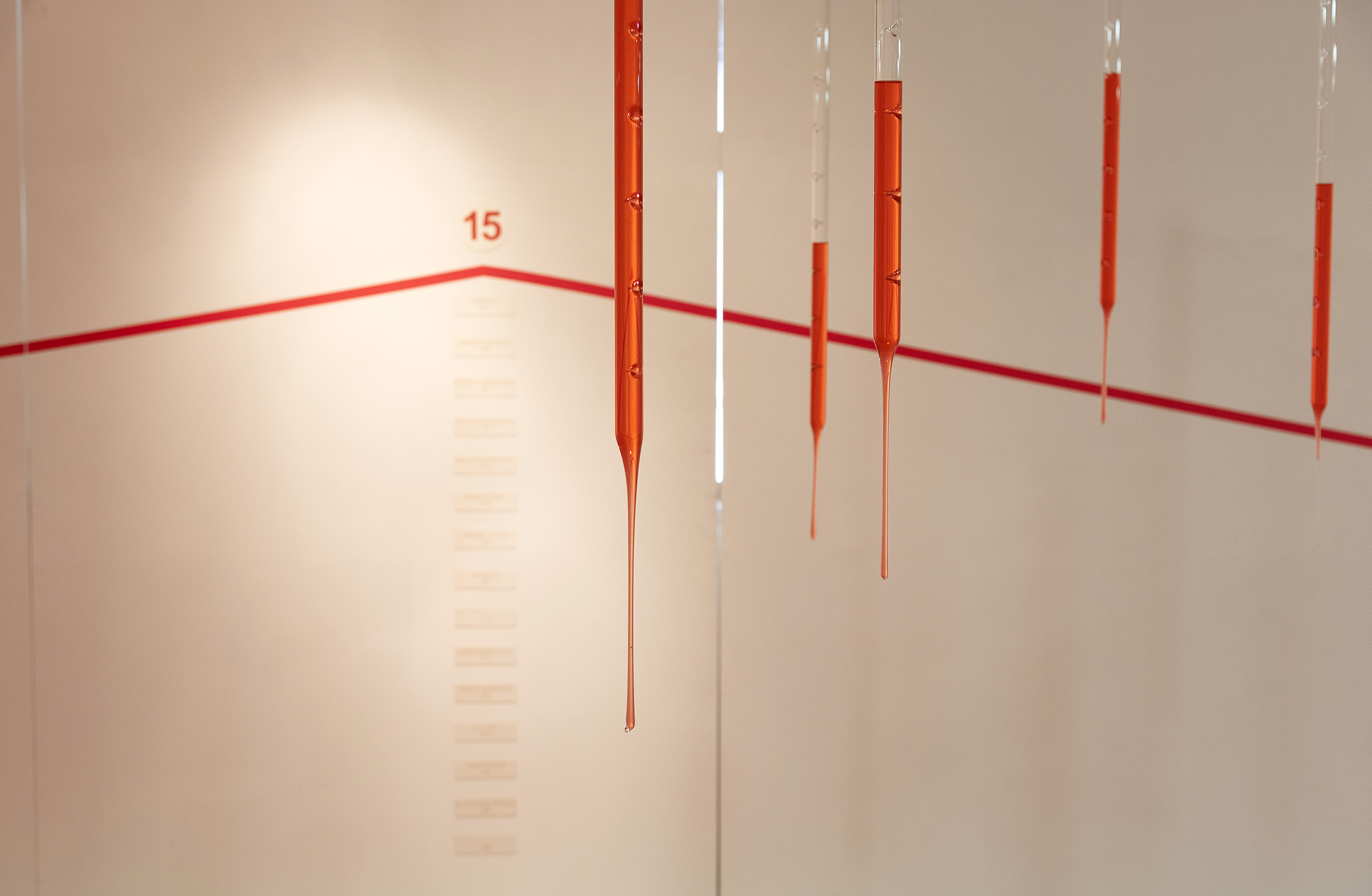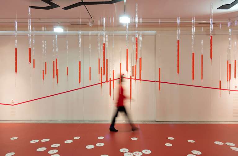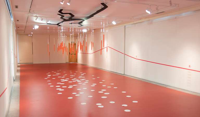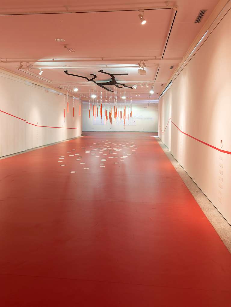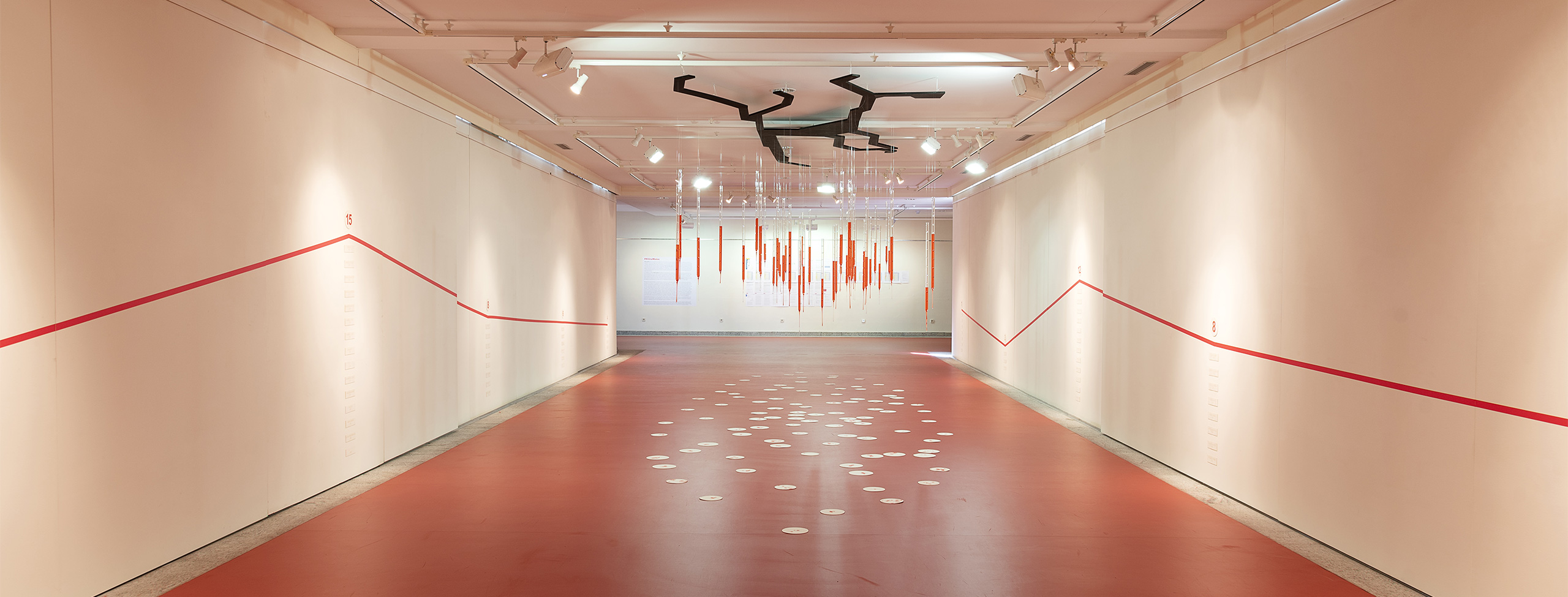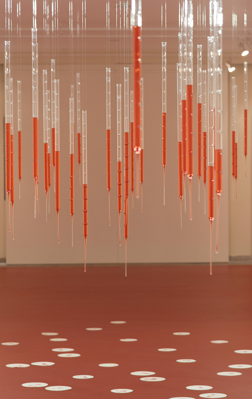 Suspendidas en el espacio, 47 probetas cristalinas, que albergan en su interior un líquido de intenso color rojizo, hacen alusión a los asesinatos clasificados dentro de la tipología de feminicidio íntimo oficial (mujeres asesinadas por un hombre con el que mantenían o habían mantenido una relación). El nivel de líquido de las probetas nos indica el rango de edad de fallecimiento. Sobre el lienzo vertical la sala y a ambos lados, se articula un diagrama de líneas, en cuyos nodos confluyen en el número de asesinatos (por mes) ocurridos a lo largo de todo el año; hasta sumar una cifra total de 97. Cada mes se completa con el nombre, apellido y edad de cada una de las víctimas. En el plano horizontal del suelo, una constelación de 97 círculos blancos teñidos por una mancha roja en su centro refuerza la instalación, a modo de gráfico de dispersión.