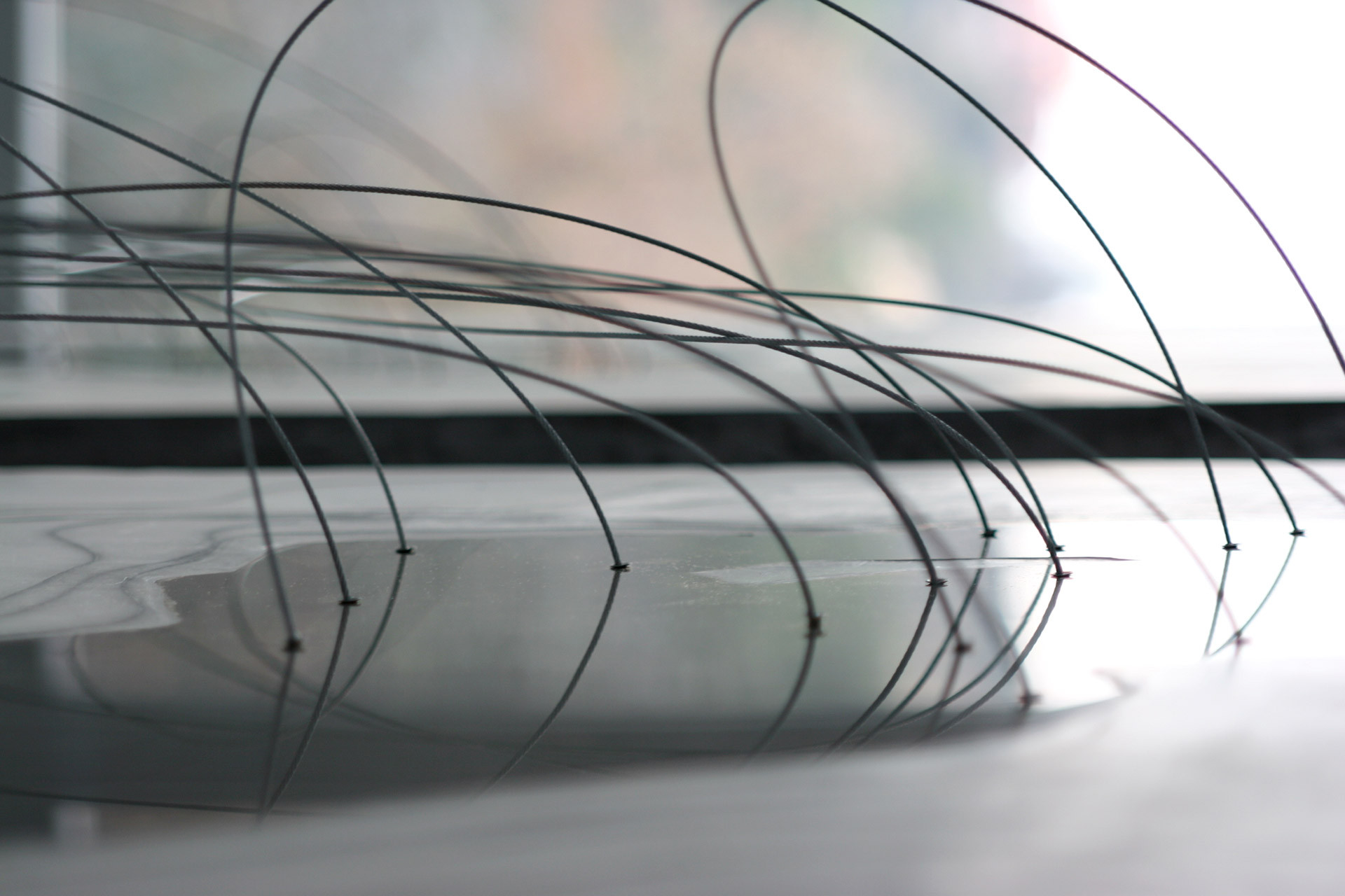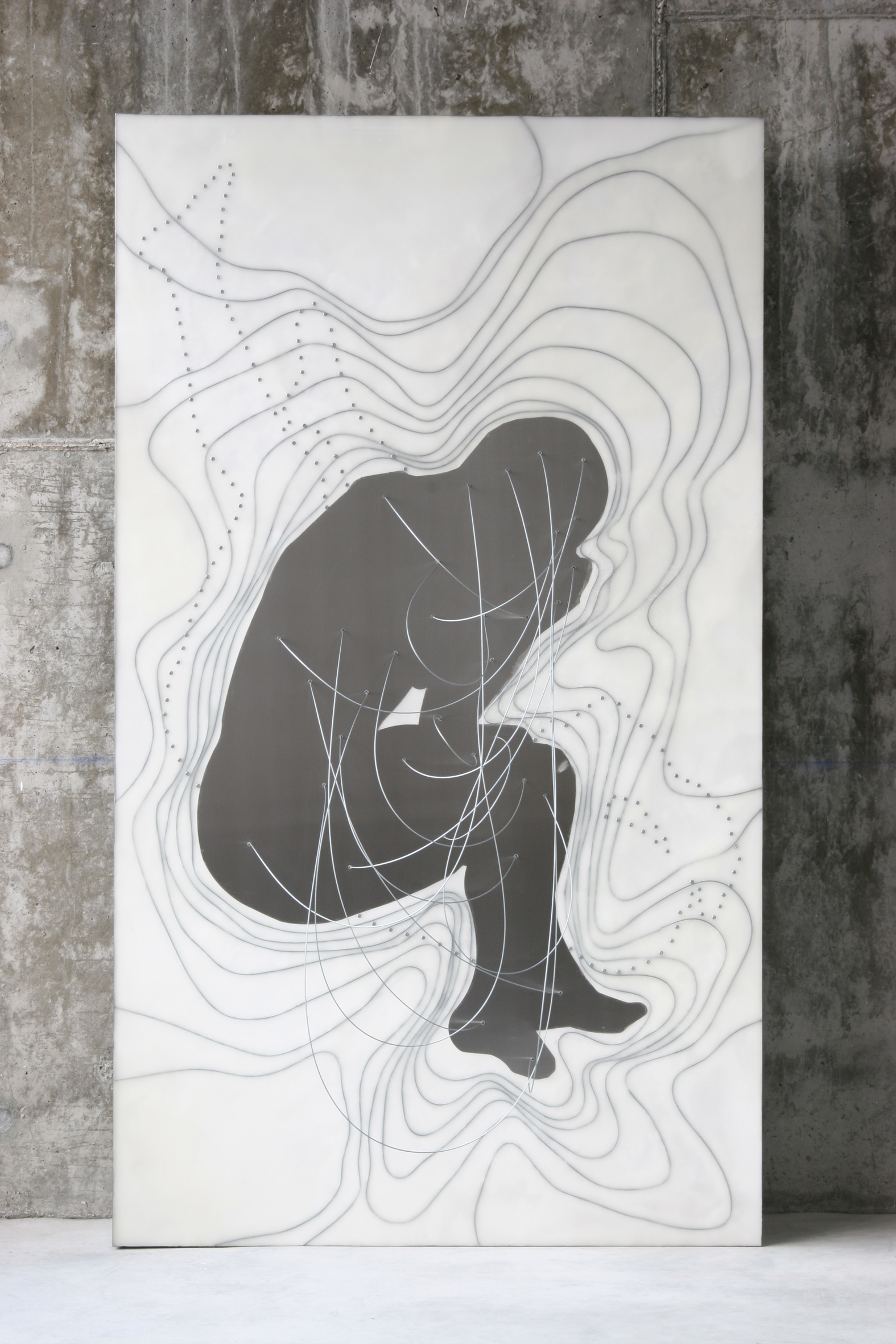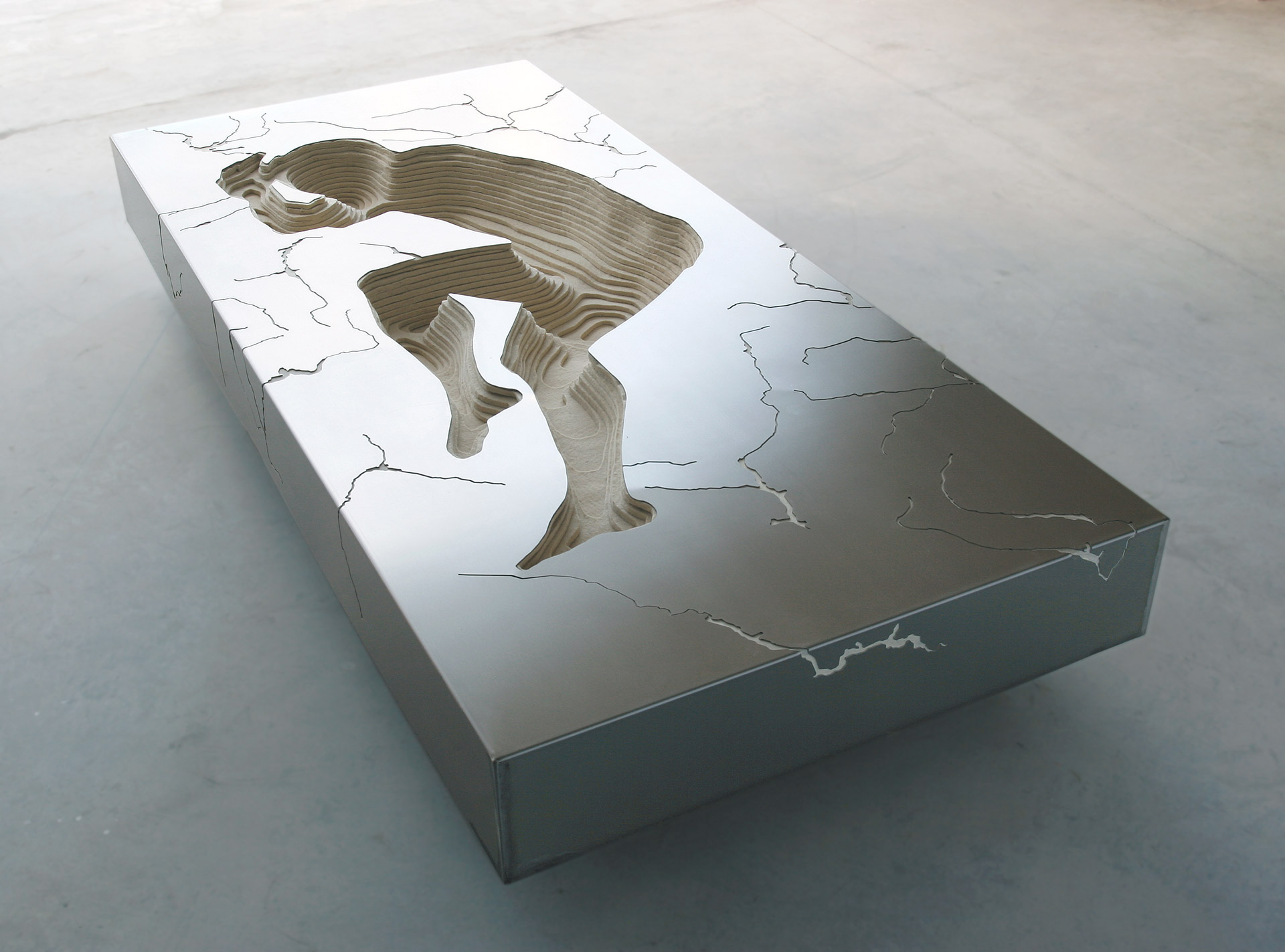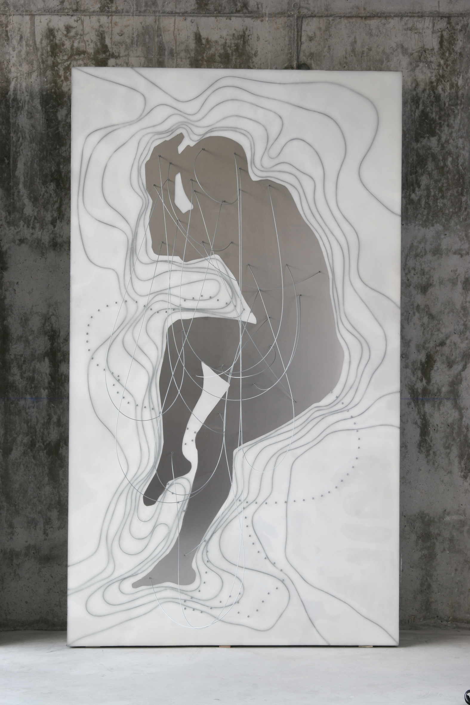 El cuerpo humano se torna topografía, mapa y, a la vez, paisaje. Un paisaje que se vuelve abstracto y al mismo tiempo corporal. Un lienzo tridimensional donde las curvas de nivel, realizadas en un material cálido como es el fieltro, describen el molde, el negativo, en definitiva, el vacío de un cuerpo masculino y otro femenino. Un lecho que se vuelve abstracto cuando aplicamos una mirada micro sobre su negativo. Una cartografía corpórea hecha de concavidades y convexidades, de valles y de montañas; en definitiva, un paisaje antropomorfoseado cuya particular geografía se encaja en un volumen metálico, calado con endiduras que nos recuerdan a las líneas de la mano, a ríos de un territorio, de nuevo un viaje del interior del cuerpo al exterior del paisaje.