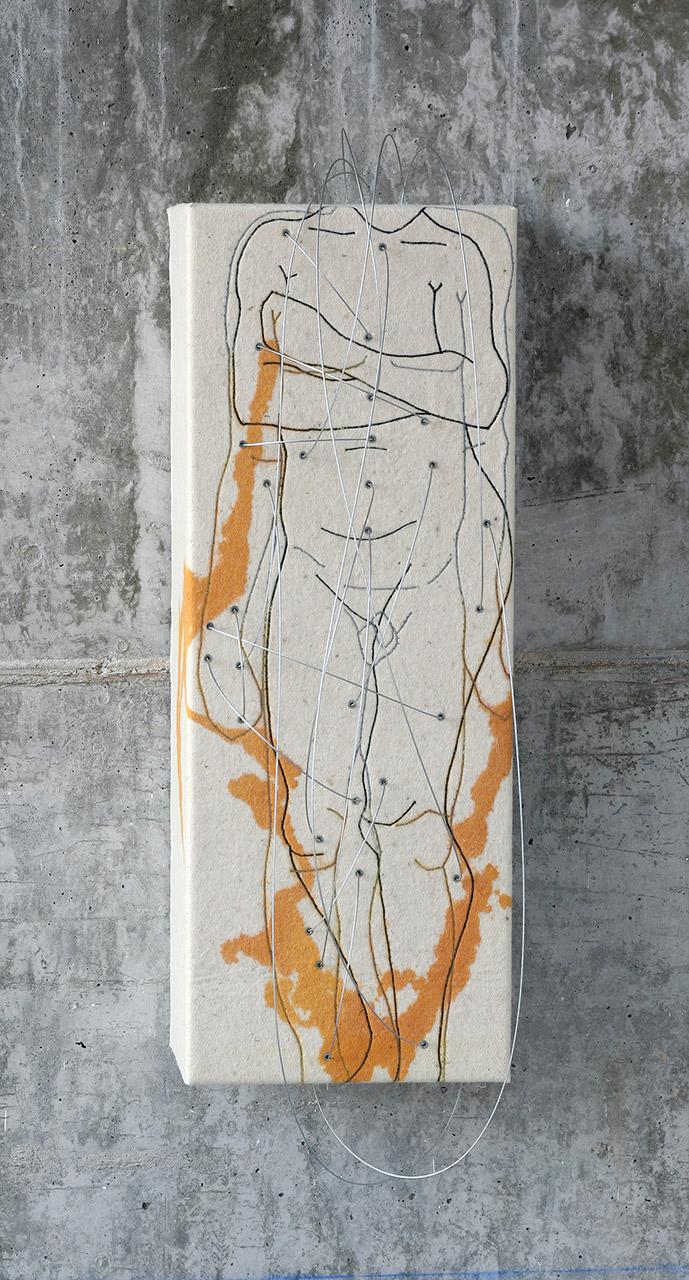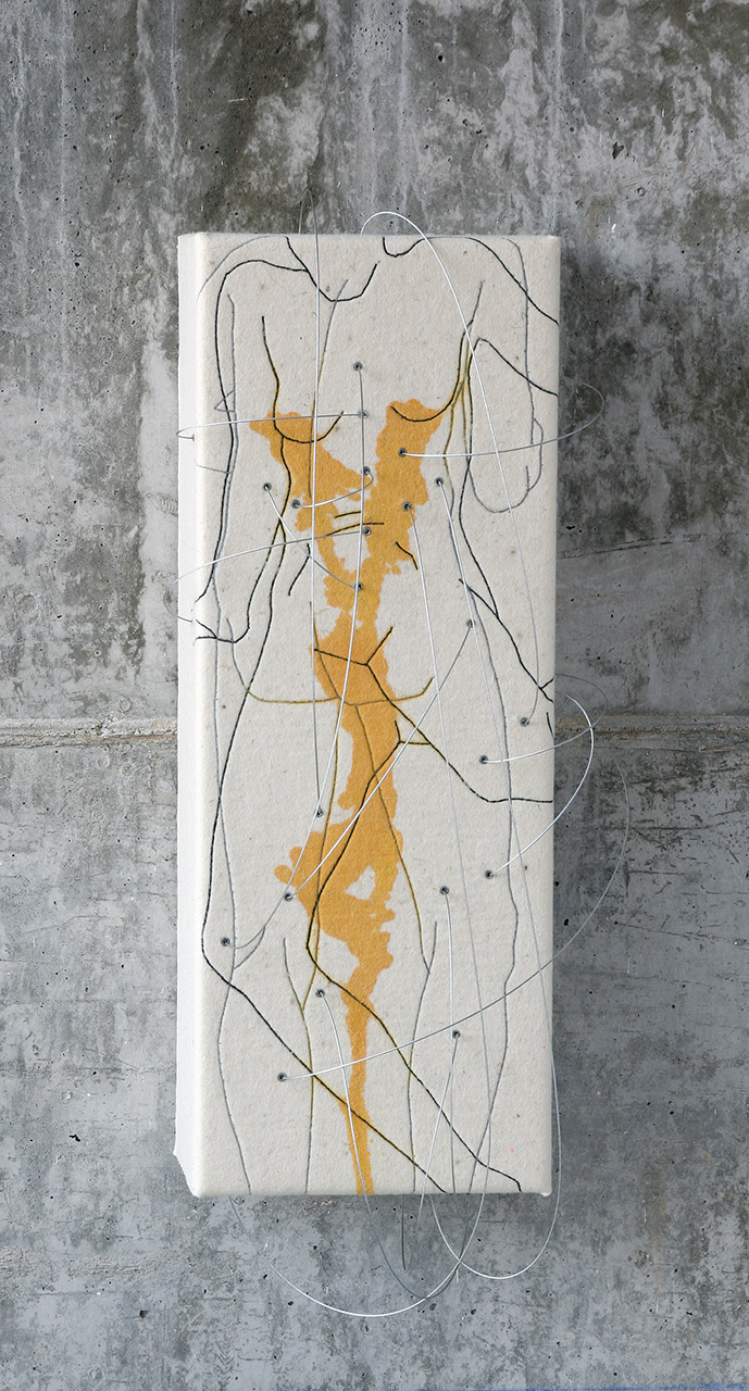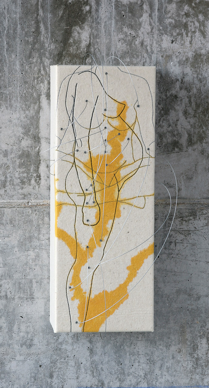 Por último, la serie Doble identidad utiliza el bordado como un código lineal que nos dibuja identidades contemporáneas en una doble visualización, generando una lectura ambigua, resultante de superponer la imagen con un doble movimiento: de frente y de perfil, de frente y de espaldas, estática y dinámica, etc.. El dibujo refuerza su grado de abstracción al plegarse sobre el prisma rectangular que actúa de soporte. Una red de cables de acero cose espacialmente la estructura reforzando los puntos de energía del cuerpo humano. La mancha amarilla nos recuerda a fluidos corporales que se derraman sobre el propio cuerpo, pero también sobre el tejido de fieltro, a modo de manchas, de mapas, de contornos abstractos.