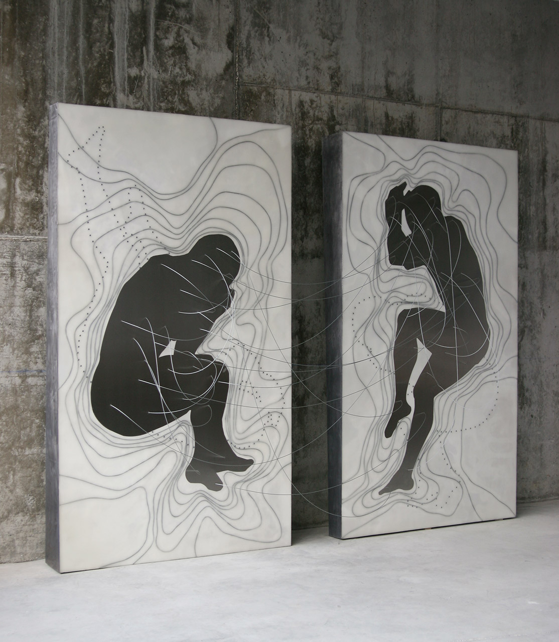 La serie Mapas corporales utiliza un registro más plano, donde la silueta metálica de un cuerpo femenino y otro masculino actúan como centrso energéticos de donde brota un cableado de acero que va conectando ambas figuras. Los cables emergen y se posicionan en puntos estratégicos del cuerpo humano, donde se concentran zonas de energía. De la silueta corporal se activa un mapa de curvas de nivel, que va recorriendo el cuerpo, desdibujando su contorno hacia el exterior.