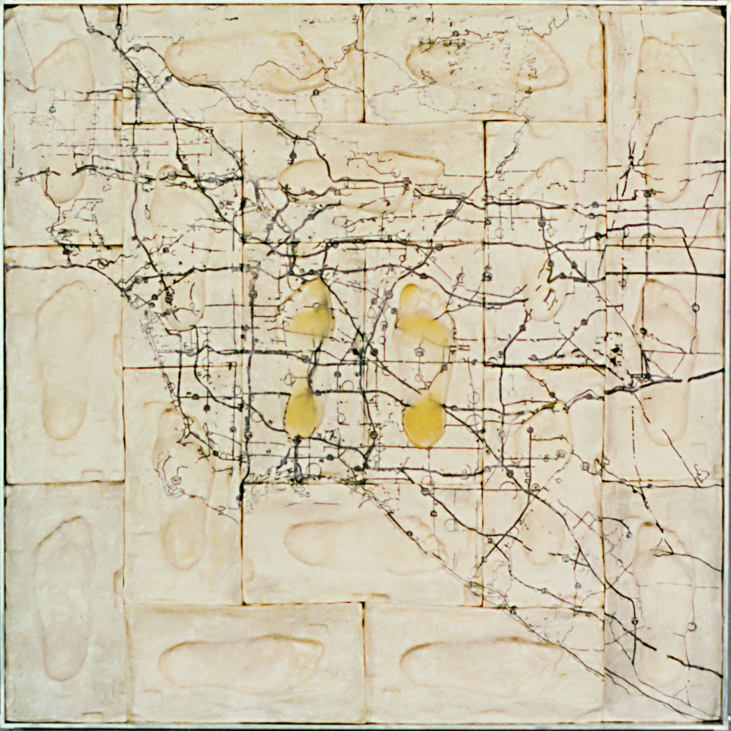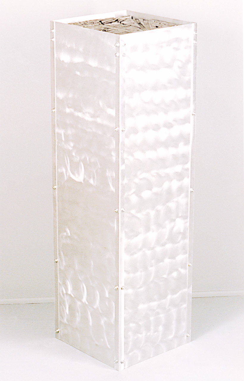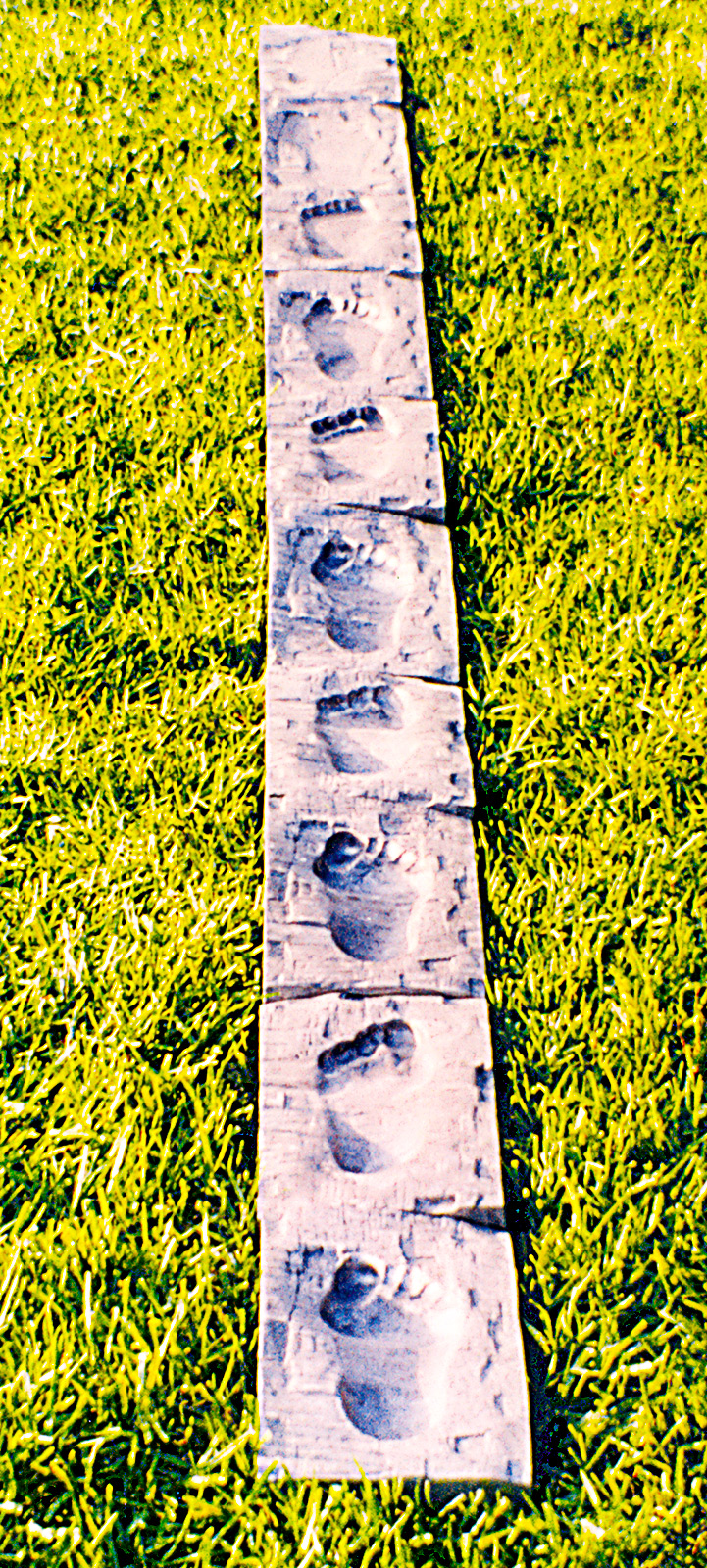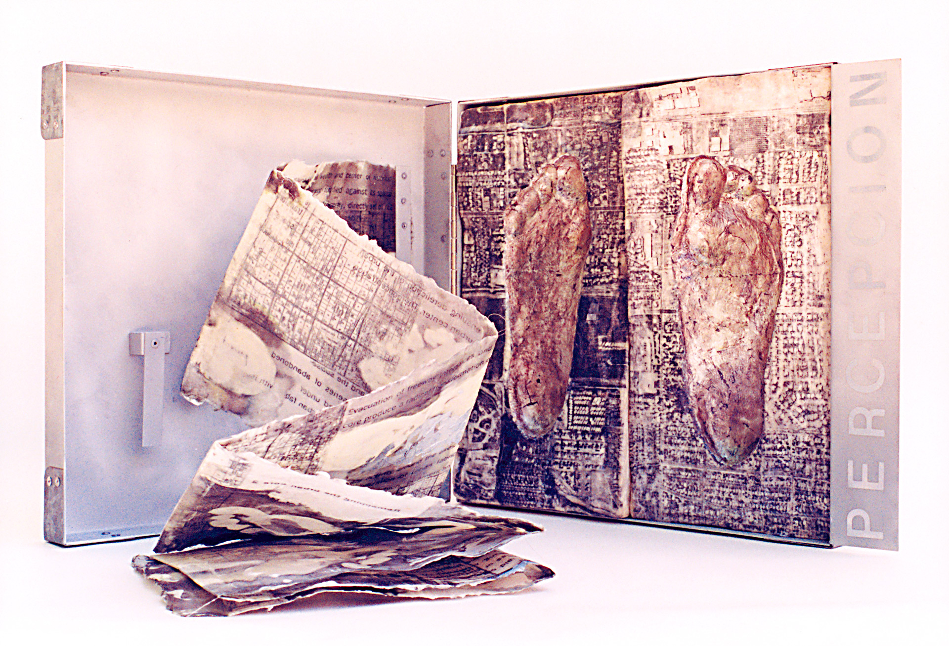 espacio mediante la percepción. El acto de caminar es una manera de medición tanto del espacio como del tiempo. Los caminos te introducen en el paisaje, señalan los lugares y el hombre instaura así su territorio. Esta filosofía de experimentación y percepción del espacio queda recogida en las premisas conceptuales sobre las que se asienta este trabajo. Las huellas solidificadas de aluminio y papel, utilizadas en piezas como Human Perception (Percepción Humana) o Footprints (Huellas), no son sino un gesto que recoge mi camino en la ciudad.