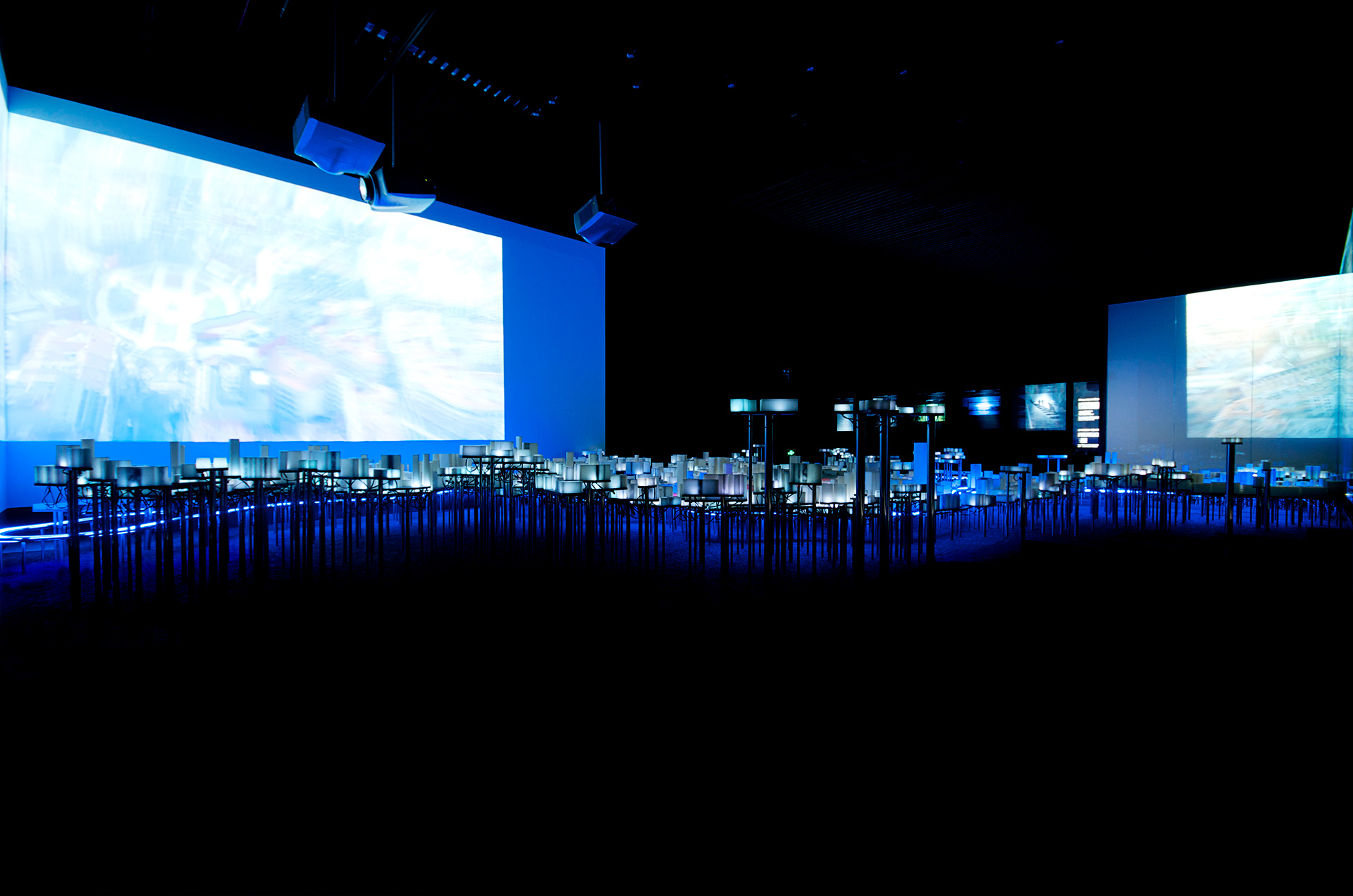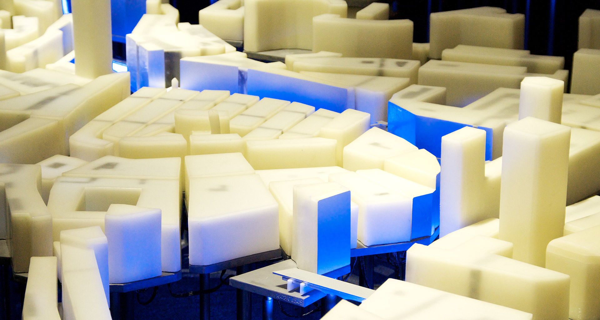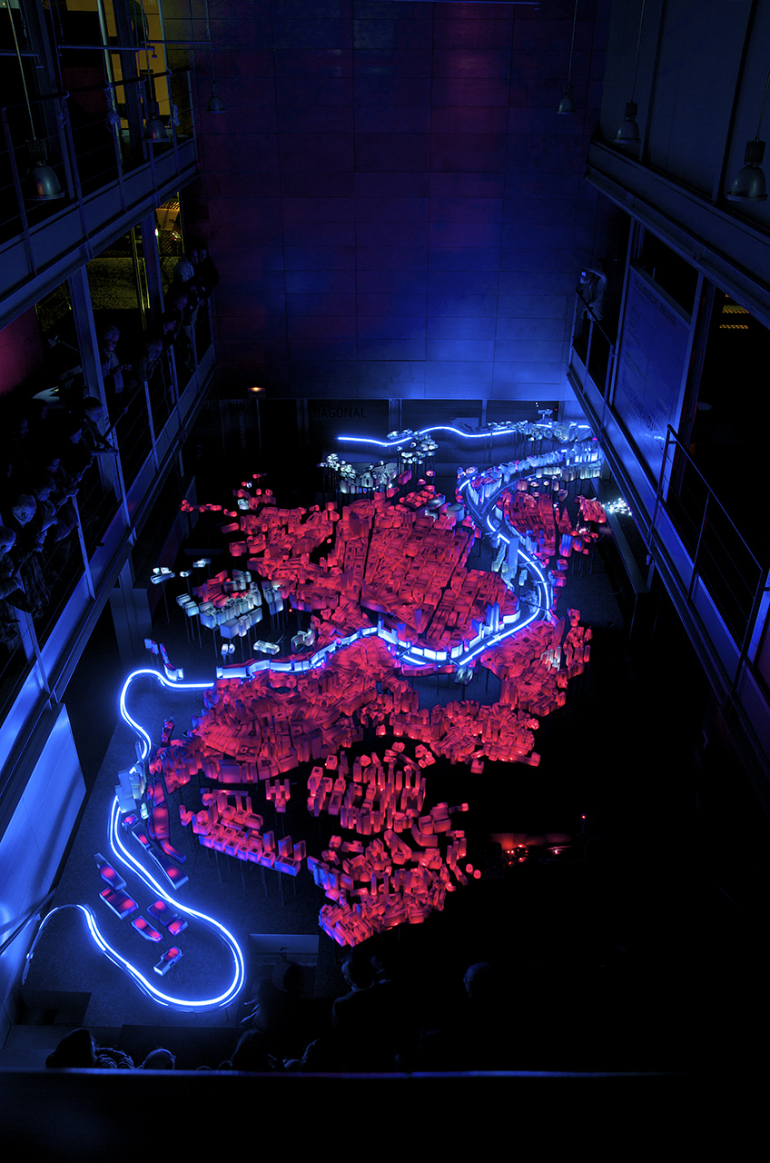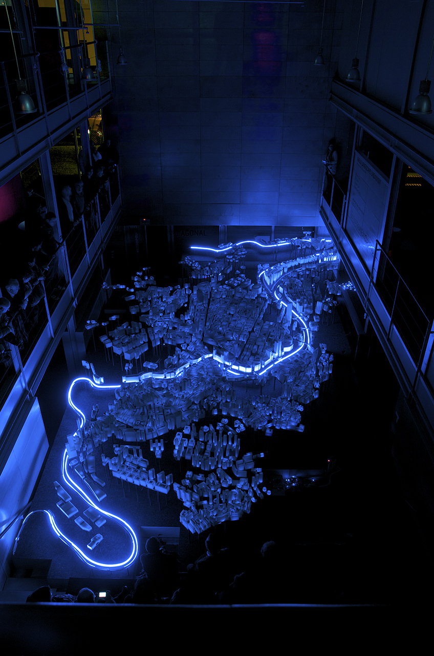 La propuesta necesita generar un contexto que permita explicar la ciudad de Bilbao y que sirva de soporte tridimensional para contar, a través de la luz, las tres revoluciones que ha sufrido la ciudad: la revolución industrial, la revolución urbana y la revolución del conocimiento. Una compleja red de LEDs recorre todas las plataformas de plomo depositando un punto de luz en el interior de cada volumen de cera, como si una red neuronal conectara toda la ciudad convirtiéndola en un organismo aún más vivo. Todo el entramado de tubos de diferentes diámetros produce un ordenado y misterioso paisaje inferior que nos hace recordar a un bosque donde los troncos se organizan en un incompresible, pero bello, orden interno.
