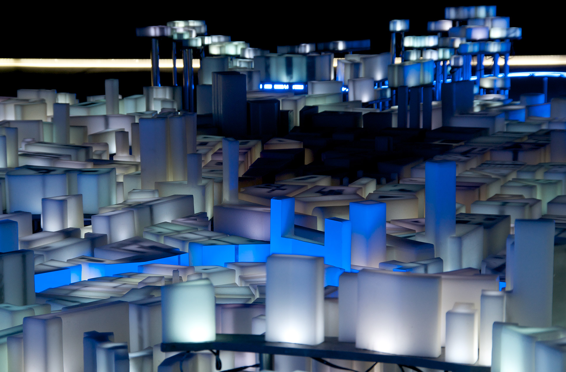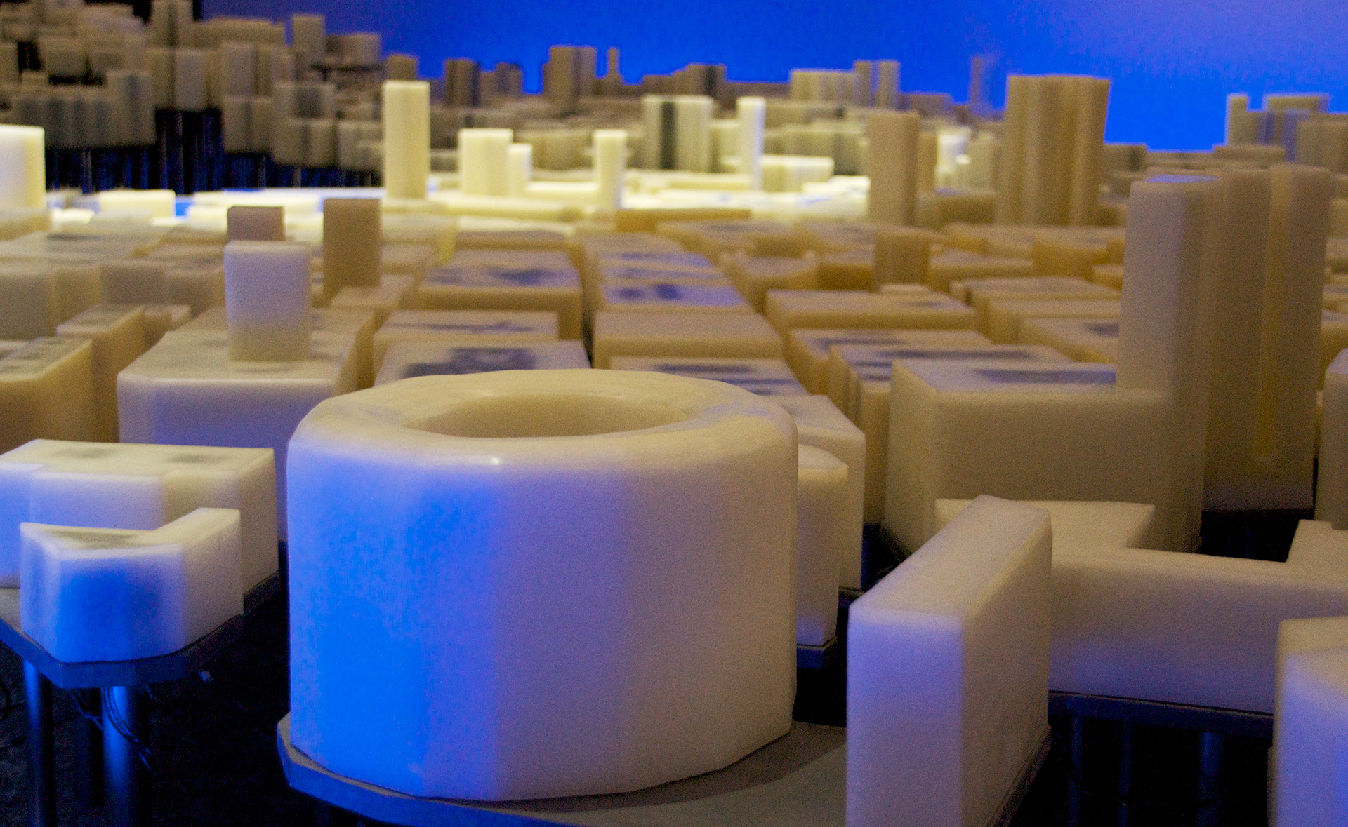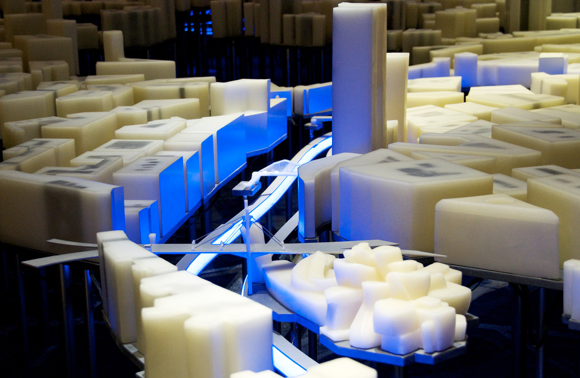 La propuesta necesita generar un contexto que permita explicar la ciudad de Bilbao y que sirva de soporte tridimensional para contar, a través de la luz, las tres revoluciones que ha sufrido la ciudad: la revolución industrial, la revolución urbana y la revolución del conocimiento. Una compleja red de LEDs recorre todas las plataformas de plomo depositando un punto de luz en el interior de cada volumen de cera, como si una red neuronal conectara toda la ciudad convirtiéndola en un organismo aún más vivo. Todo el entramado de tubos de diferentes diámetros produce un ordenado y misterioso paisaje inferior que nos hace recordar a un bosque donde los troncos se organizan en un incompresible, pero bello, orden interno.
