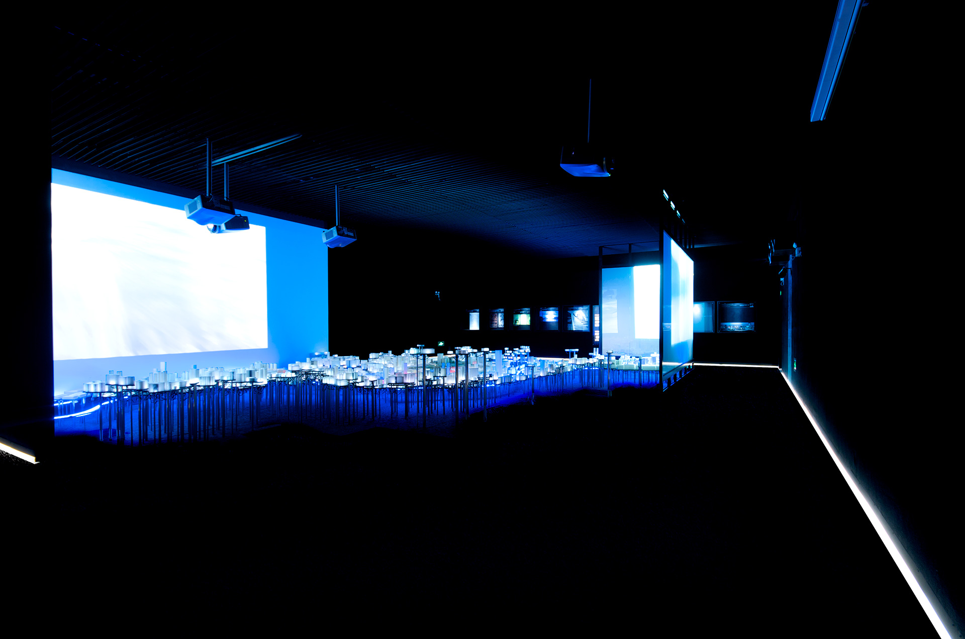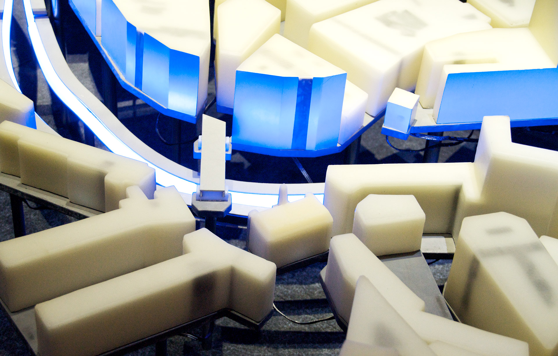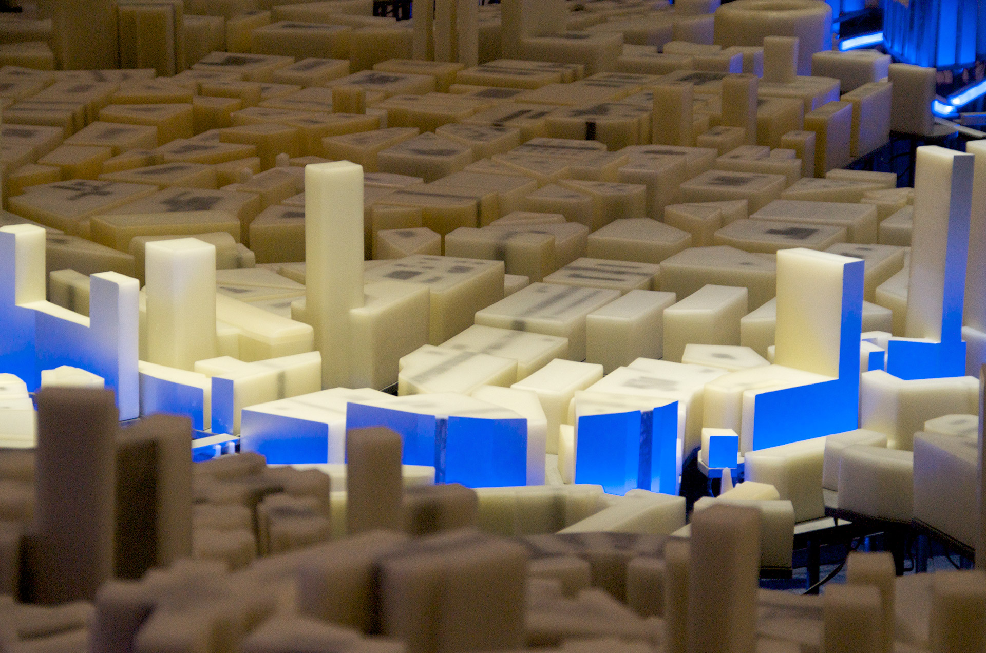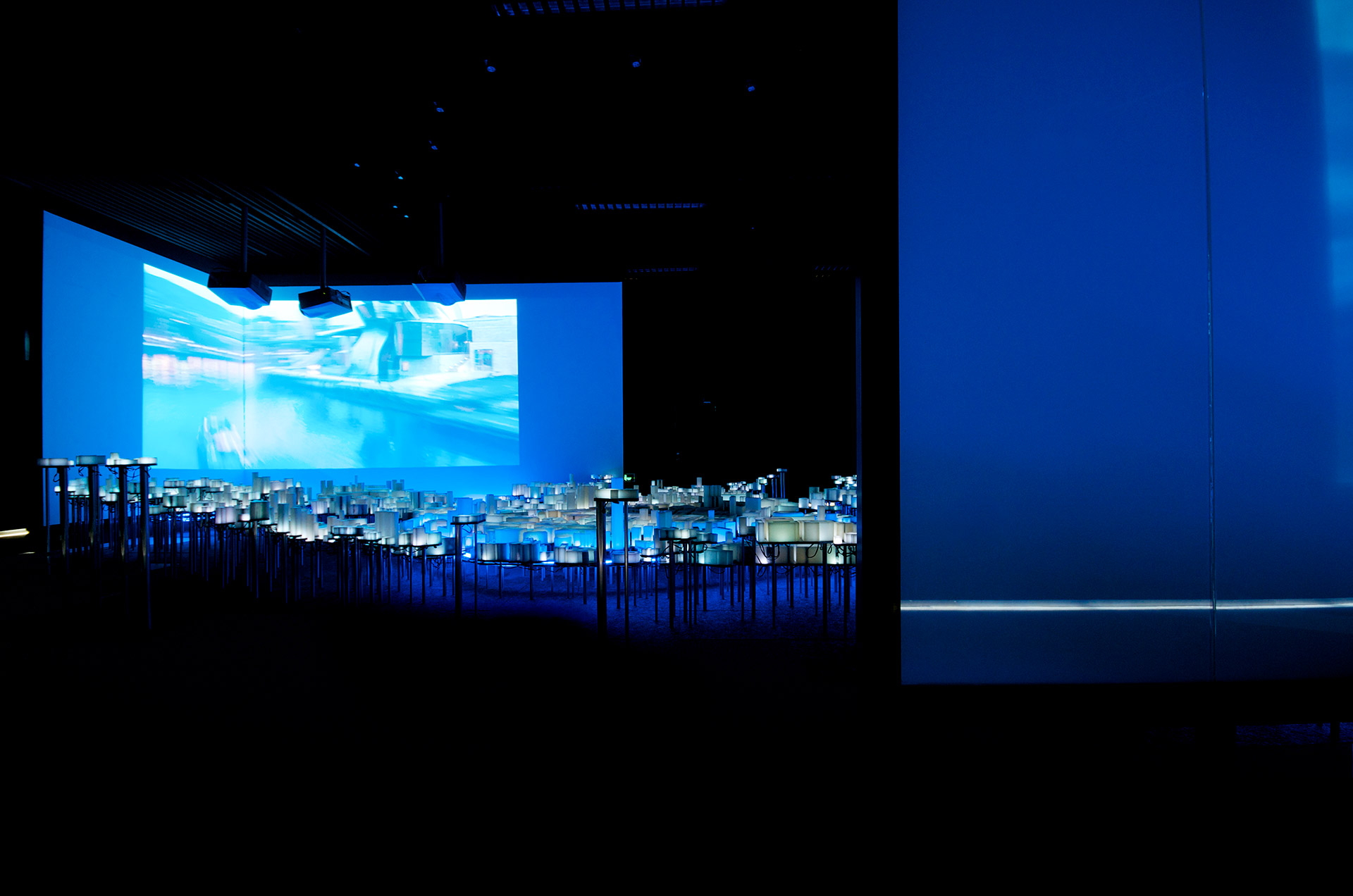 La propuesta necesita generar un contexto que permita explicar la ciudad de Bilbao y que sirva de soporte tridimensional para contar, a través de la luz, las tres revoluciones que ha sufrido la ciudad: la revolución industrial, la revolución urbana y la revolución del conocimiento. Una compleja red de LEDs recorre todas las plataformas de plomo depositando un punto de luz en el interior de cada volumen de cera, como si una red neuronal conectara toda la ciudad convirtiéndola en un organismo aún más vivo. Todo el entramado de tubos de diferentes diámetros produce un ordenado y misterioso paisaje inferior que nos hace recordar a un bosque donde los troncos se organizan en un incompresible, pero bello, orden interno.