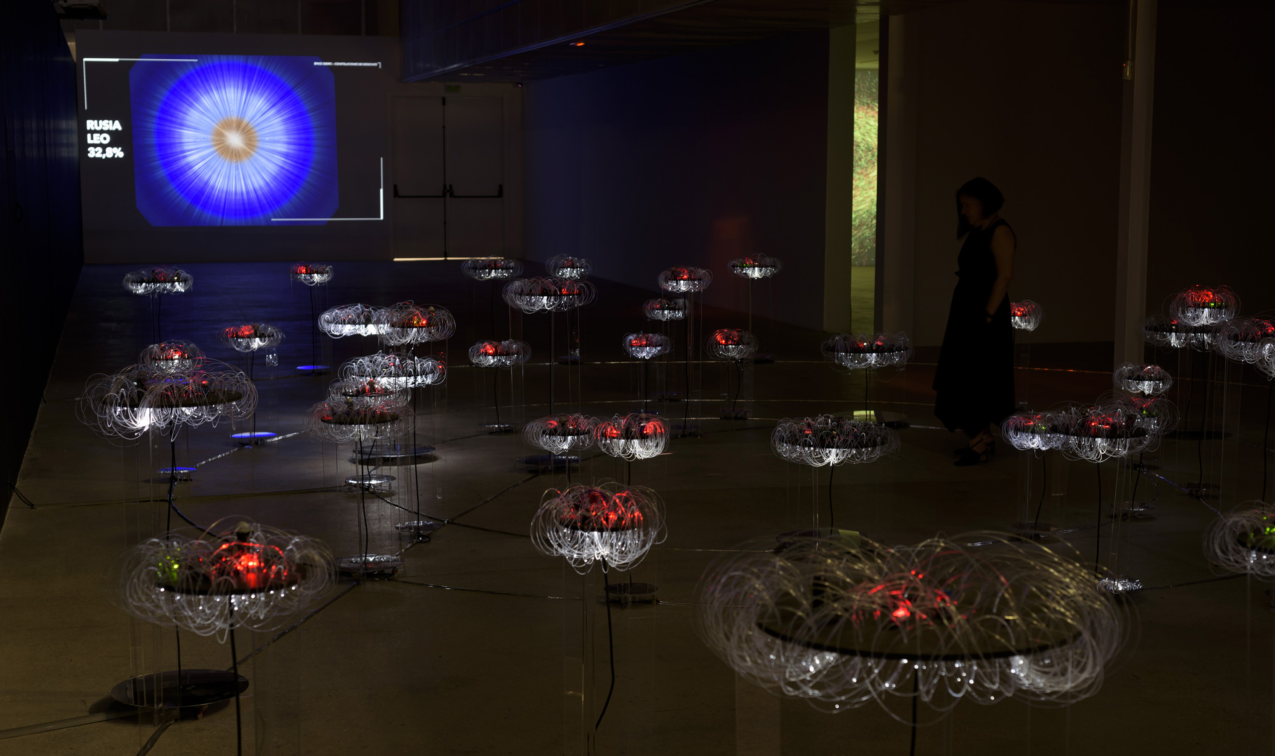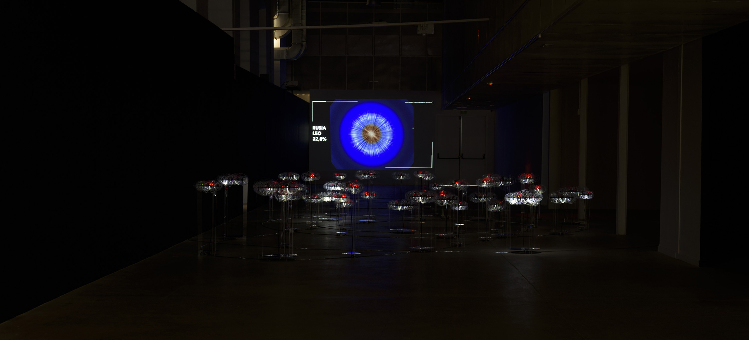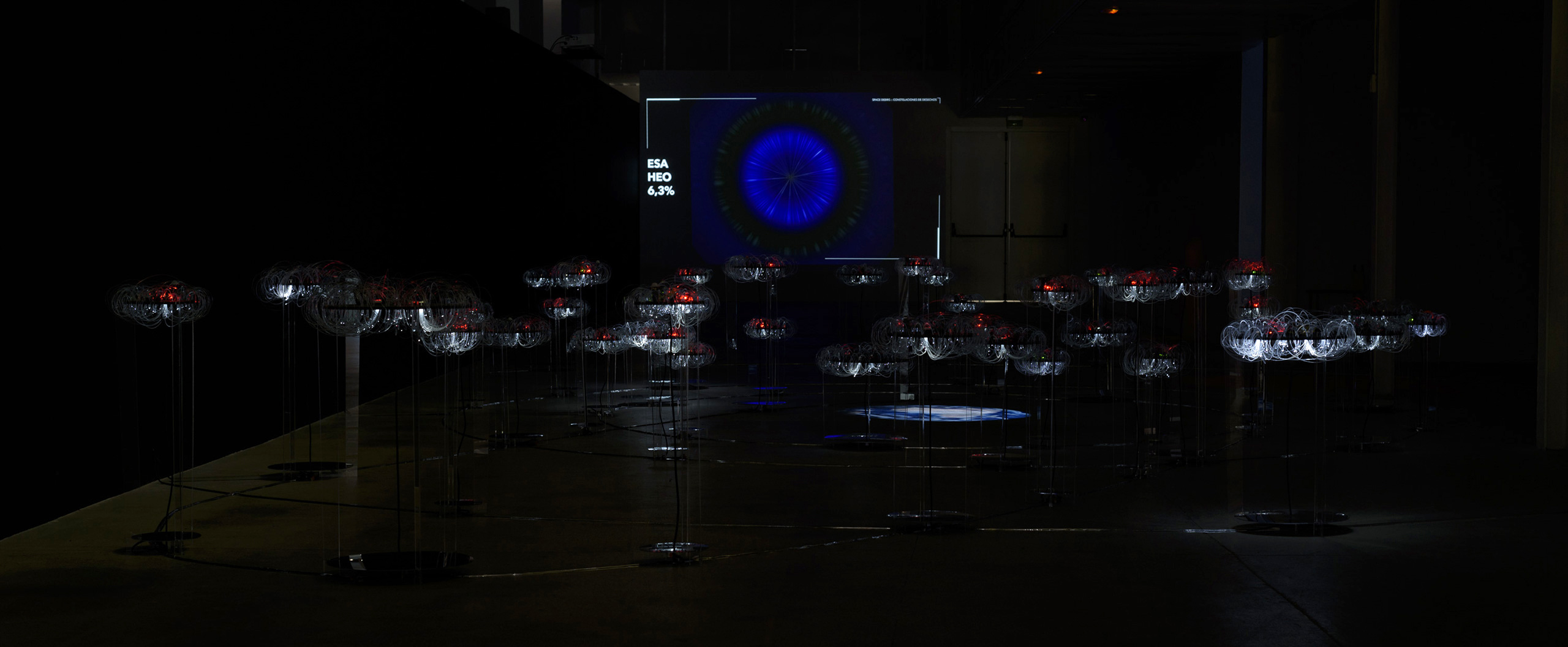 La exposición se articula en torno a tres ejes. El primero, el conceptual, revela los datos recabados de fuentes científicas y elabora unos gráficos que ayuden a su comprensión. Cada país ha sido clasificado en base a las cuatro órbitas terrestres, LEO, MEO, GEO y HEO; y en torno a las tres principales categorías de basura espacial: debris, rocket body y payload. El segundo eje, y el principal, está constituido por una gran instalación tridimensional e interactiva que interpreta el espacio exterior y sus cuatro órbitas principales. Una proyección de la Tierra actúa como centro, a su alrededor se distribuyen 44 plataformas tejidas con fibra óptica y activadas lumínicamente con sensores. En su proyección perpendicular un óculo especular nos muestra los datos de ese país en forma de gráfico de anillos circulares y un audio completa este ambiente inmersivo. Las plataformas de los países con mayor impacto accionan una proyección que traduce los datos del estado activado, en una visualización dinámica y generativa. Por último, el eje documental contextualiza esta problemática mediante la proyección “Time to act”, de la European Space Agency (ESA).