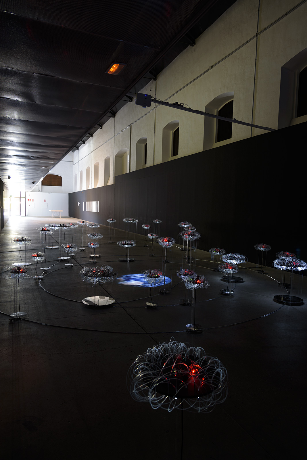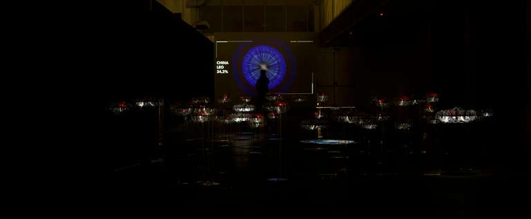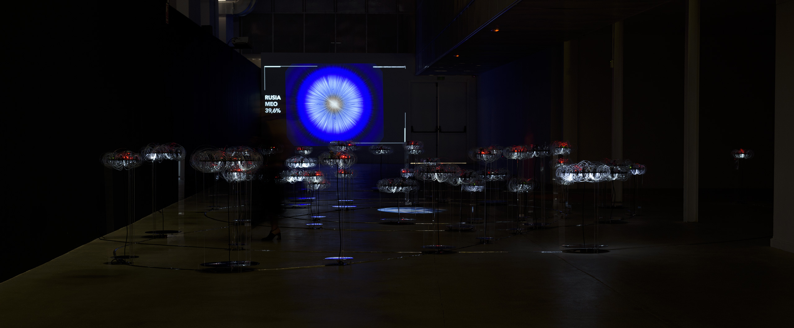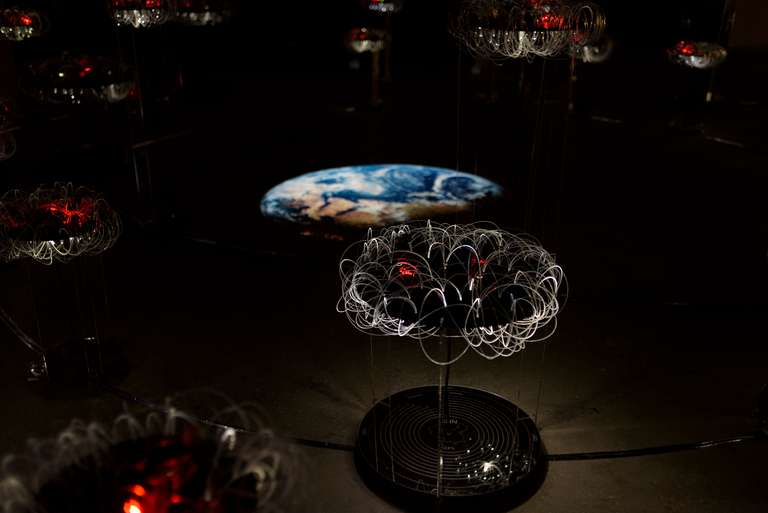 La exposición se articula en torno a tres ejes. El primero, el conceptual, revela los datos recabados de fuentes científicas y elabora unos gráficos que ayuden a su comprensión. Cada país ha sido clasificado en base a las cuatro órbitas terrestres, LEO, MEO, GEO y HEO; y en torno a las tres principales categorías de basura espacial: debris, rocket body y payload. El segundo eje, y el principal, está constituido por una gran instalación tridimensional e interactiva que interpreta el espacio exterior y sus cuatro órbitas principales. Una proyección de la Tierra actúa como centro, a su alrededor se distribuyen 44 plataformas tejidas con fibra óptica y activadas lumínicamente con sensores. En su proyección perpendicular un óculo especular nos muestra los datos de ese país en forma de gráfico de anillos circulares y un audio completa este ambiente inmersivo. Las plataformas de los países con mayor impacto accionan una proyección que traduce los datos del estado activado, en una visualización dinámica y generativa. Por último, el eje documental contextualiza esta problemática mediante la proyección “Time to act”, de la European Space Agency (ESA).