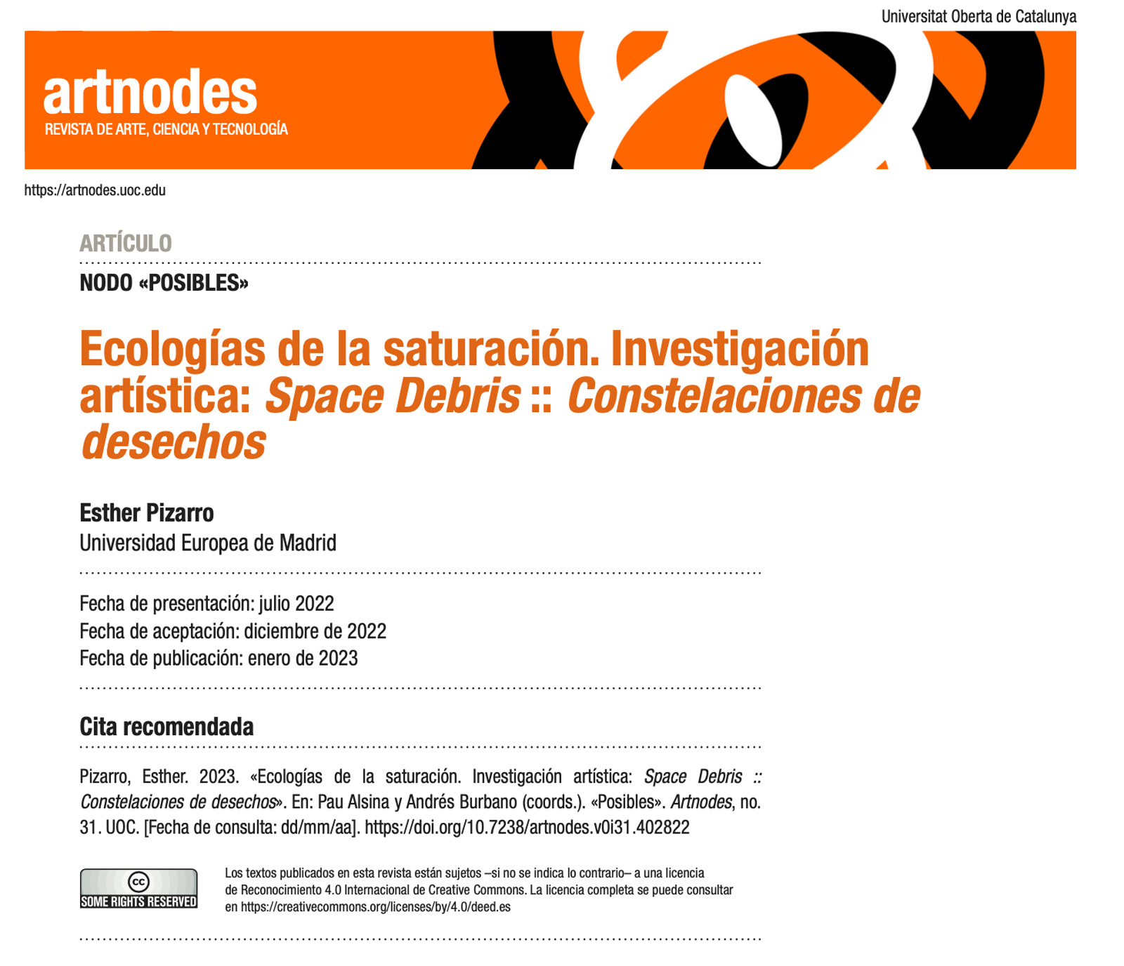 PUBLICACIÓN: “Ecologías de la saturación. Investigación artística: Space Debris :: Constelaciones de desechos”, Revista ARTNODES