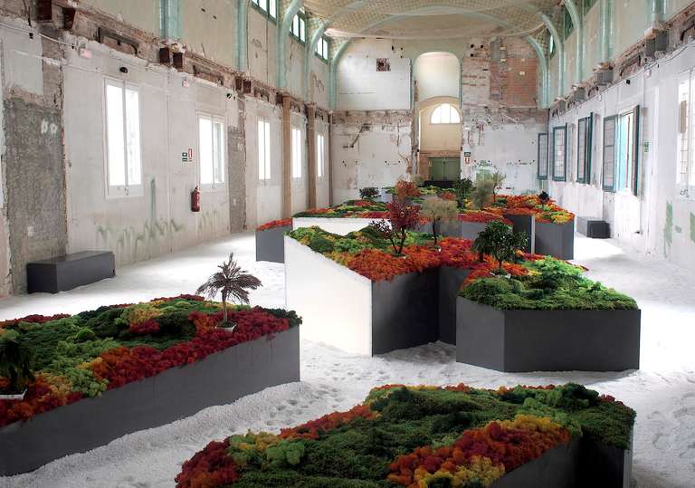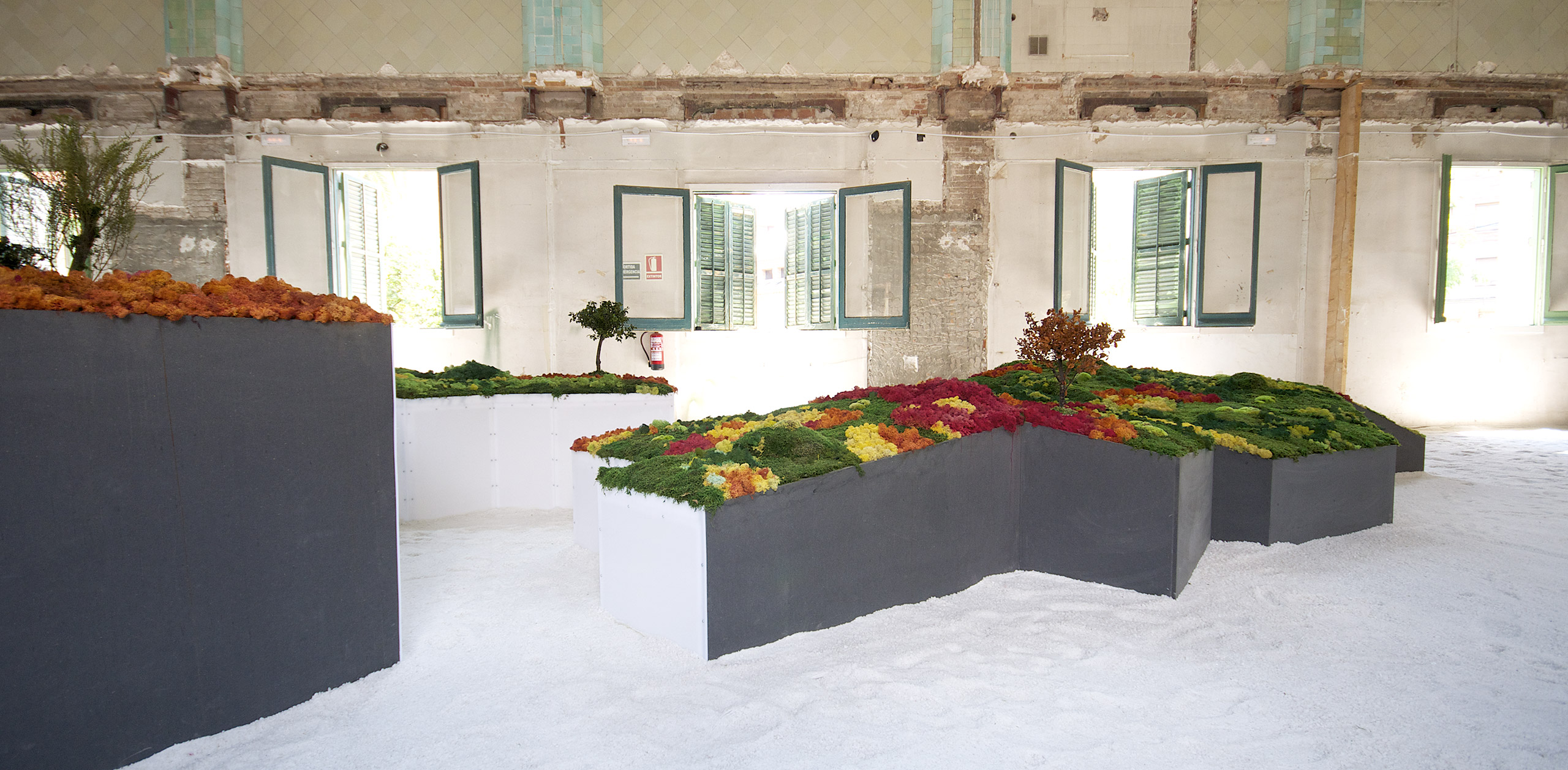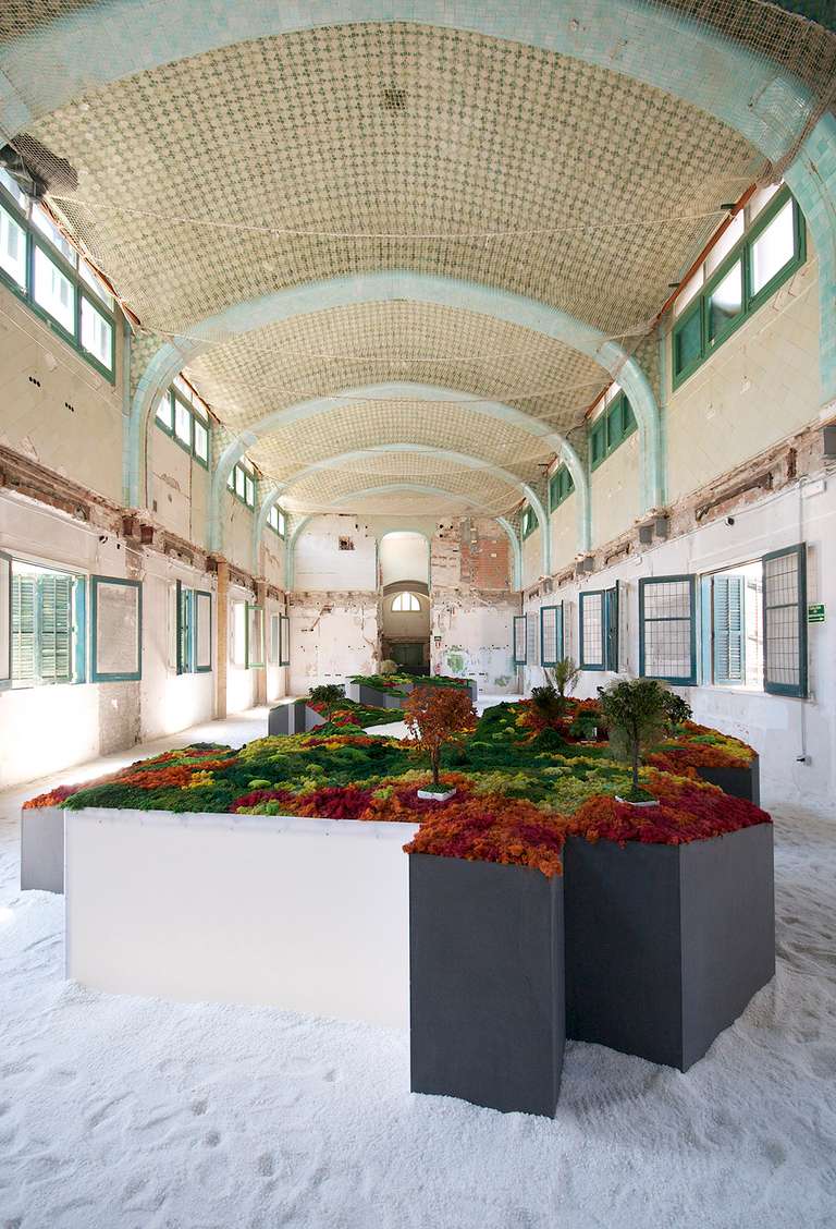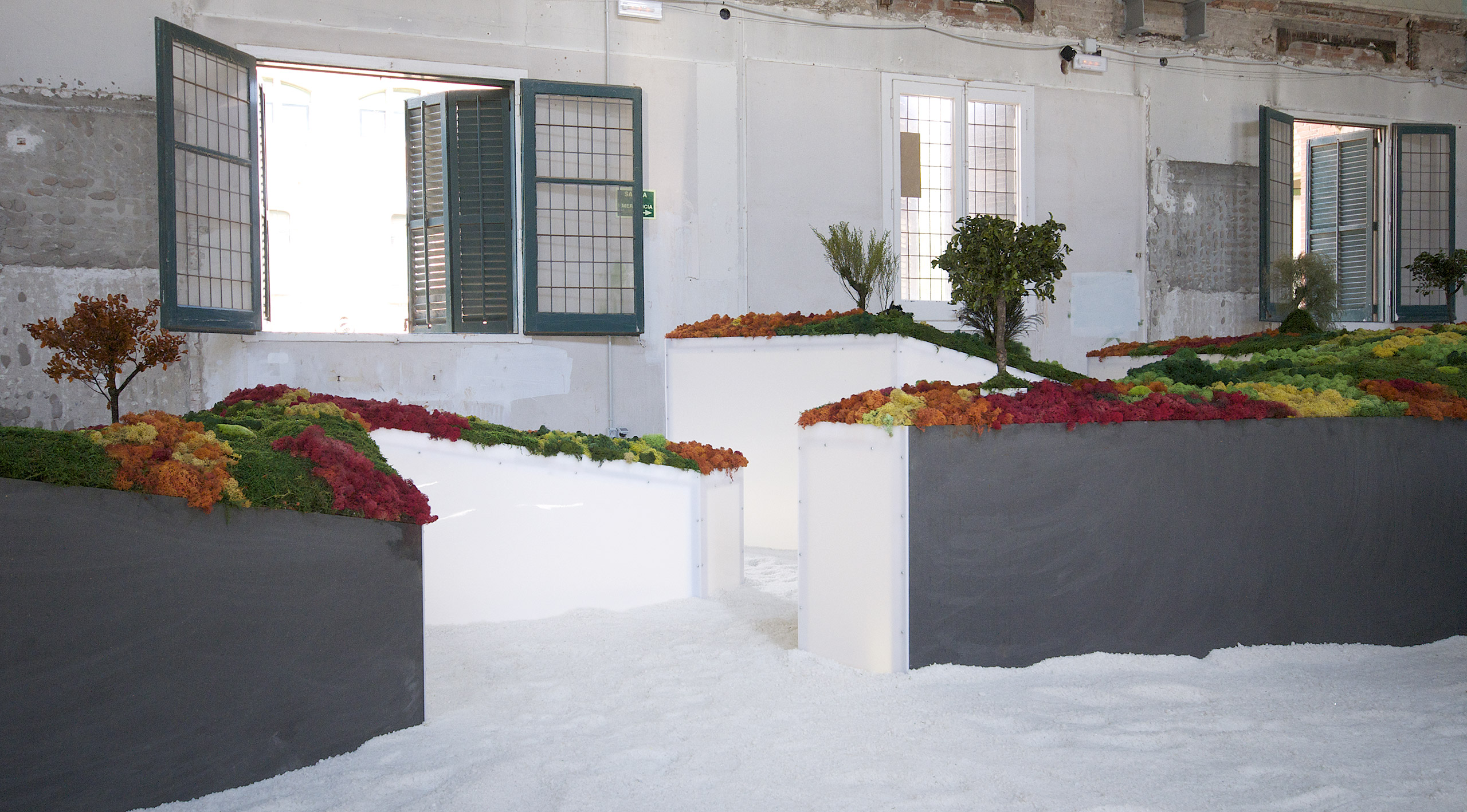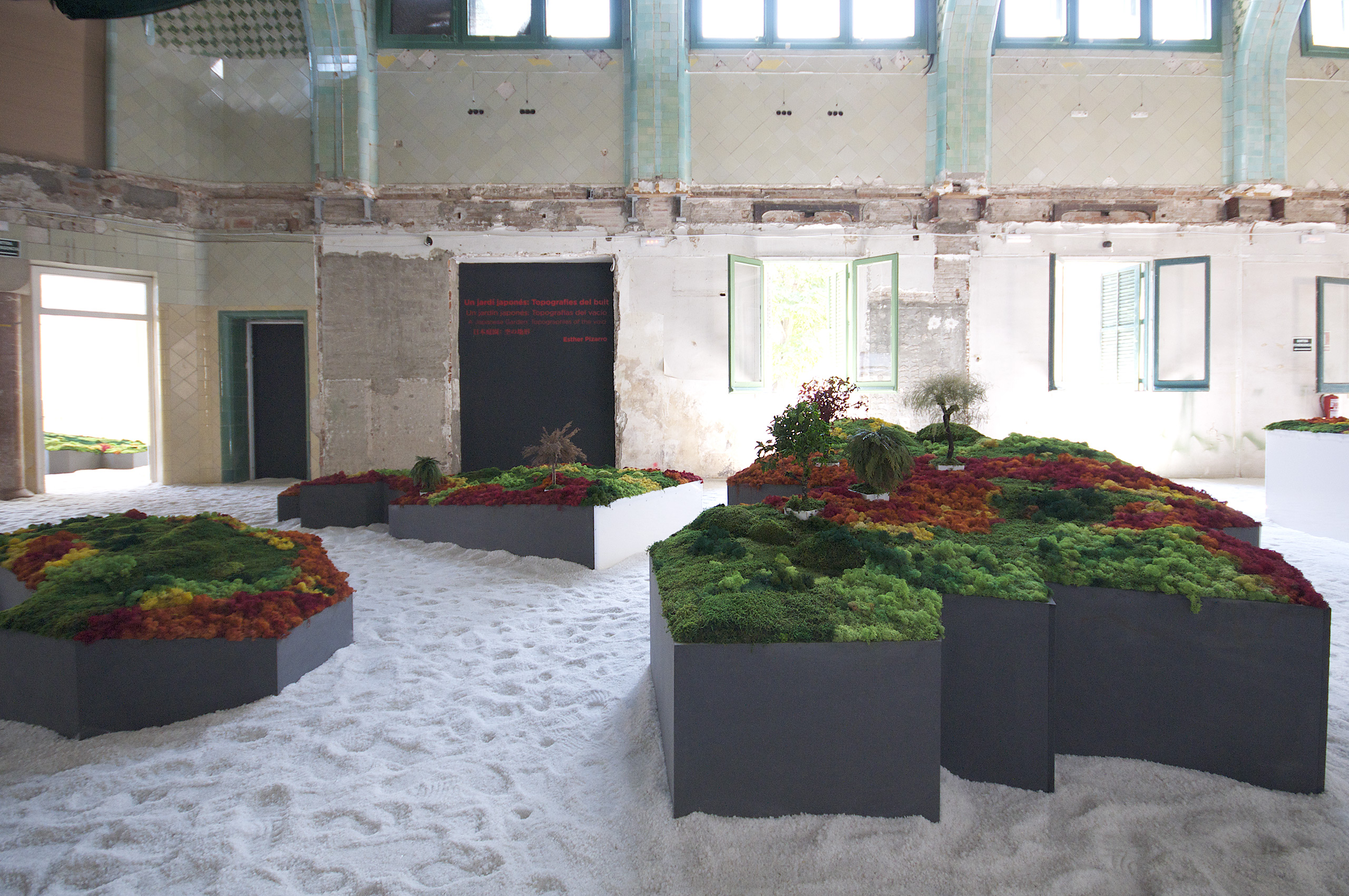 Este proyecto expositivo consta de una instalación única realizada por Esther Pizarro y comisariado por Menene Gras Balaguer. En base al archipiélago que configura el país nipón, se ha diseñado un jardín japonés que trata de conectar con los valores estéticos universales de esta cultura. Un jardín japonés es un espacio que invita a la contemplación imitando la naturaleza que trata de reproducir en miniatura, pero a la vez compartiendo códigos estéticos con la caligrafía, el arte y la tradición. Todos los componentes que forman parte del jardín japonés importan un simbolismo y unas normas que informan sobre el significado de la disposición de todos y cada uno de ellos, como si fueran los elementos de una escritura gráfica con una identidad cultural definida. Este proyecto que han producido Matadero Madrid y Casa Asia delimita el espacio del jardín sobre la planta territorial que ocupa el país. Es un jardín seco rodeado de un mar de sal, en el que las ocho regiones se han convertido en islas, al abrir caminos entre ellas para que el público pueda desplazarse como por el interior de un organismo vivo, a imagen de la naturaleza en cada una de sus representaciones.