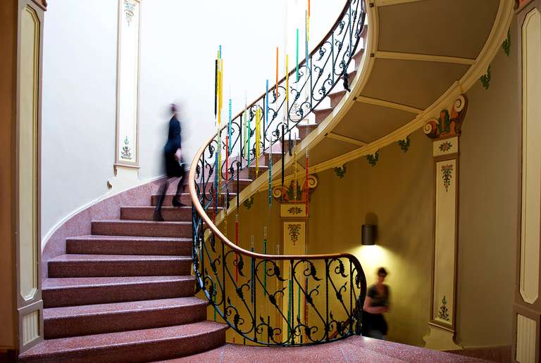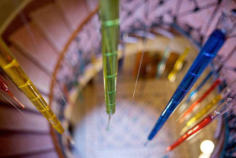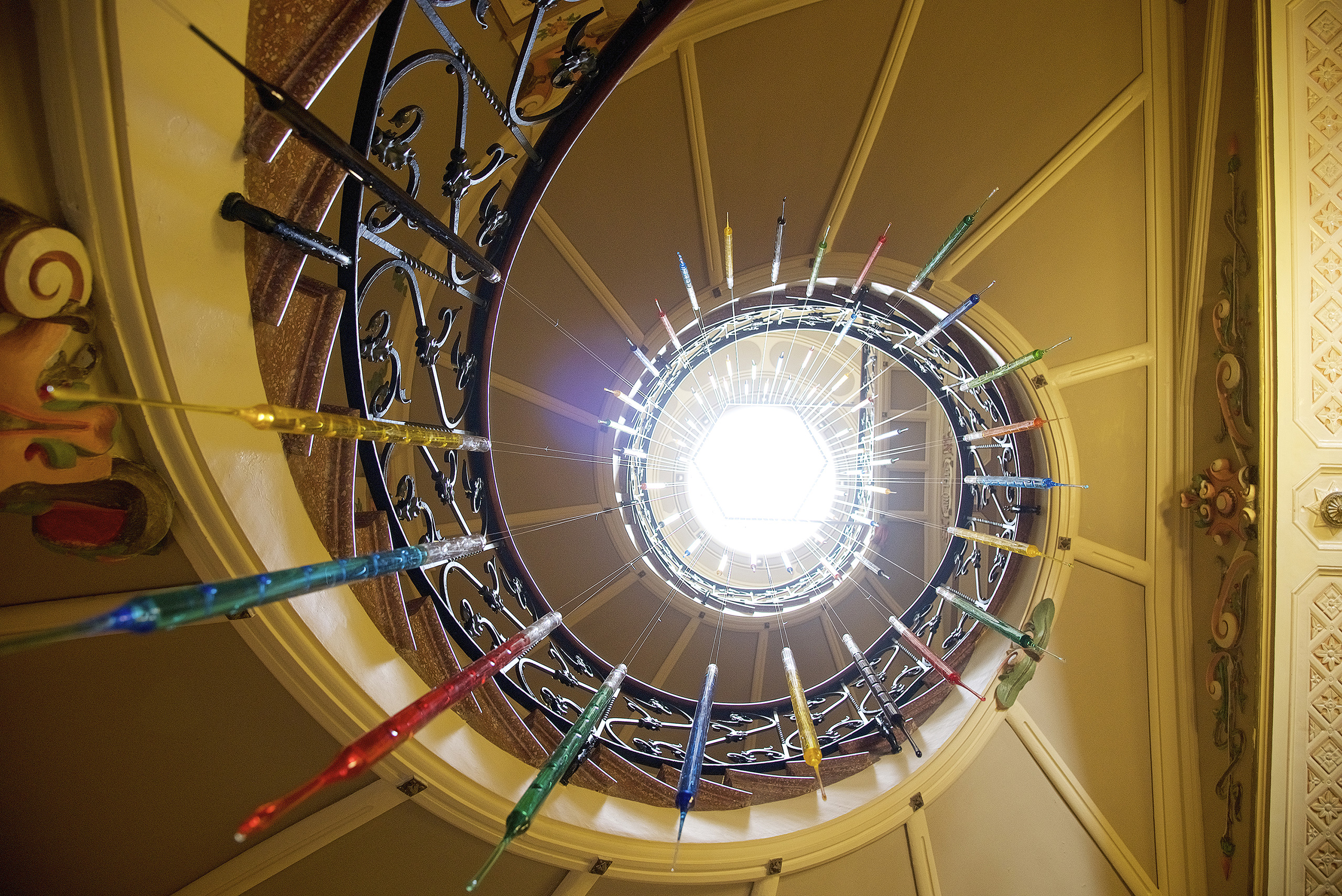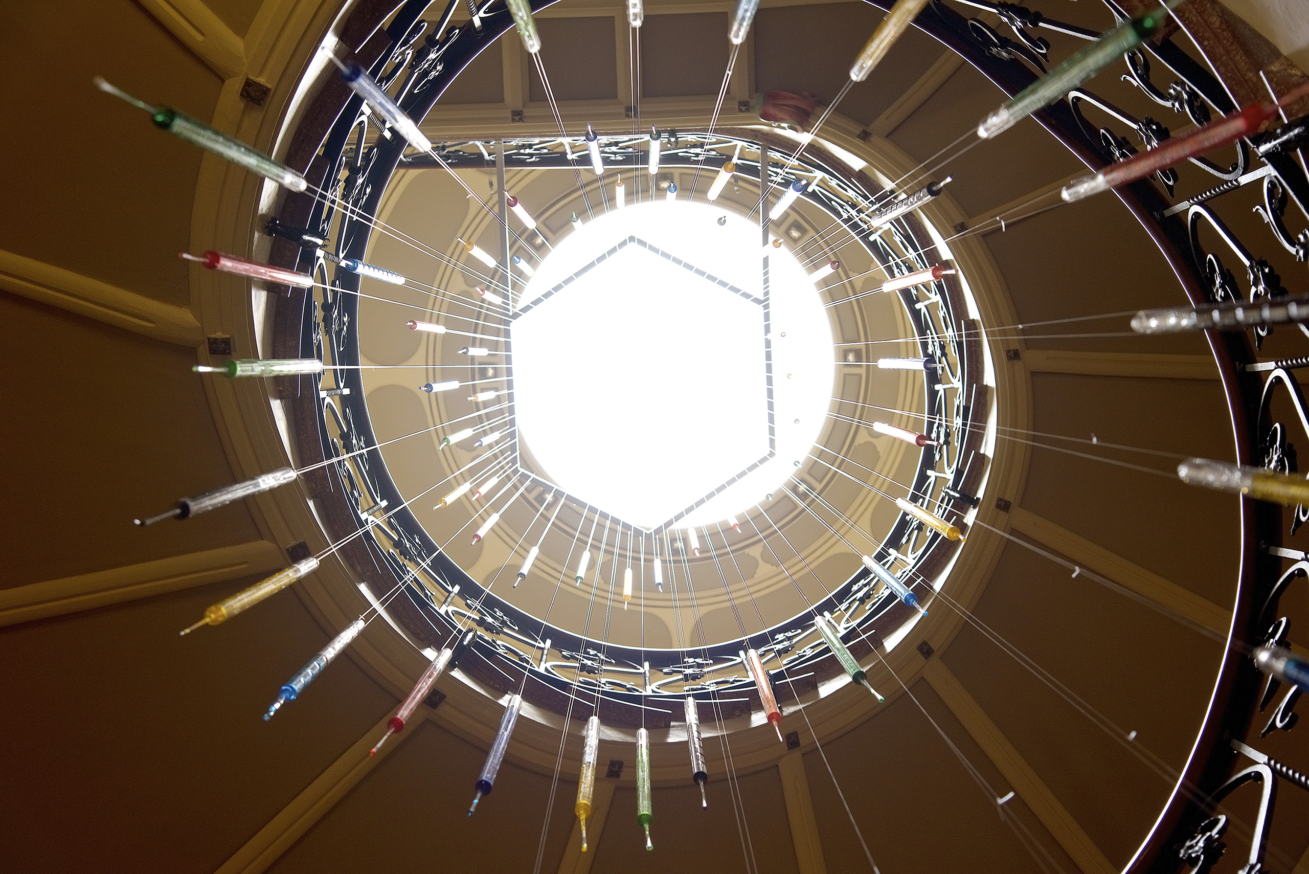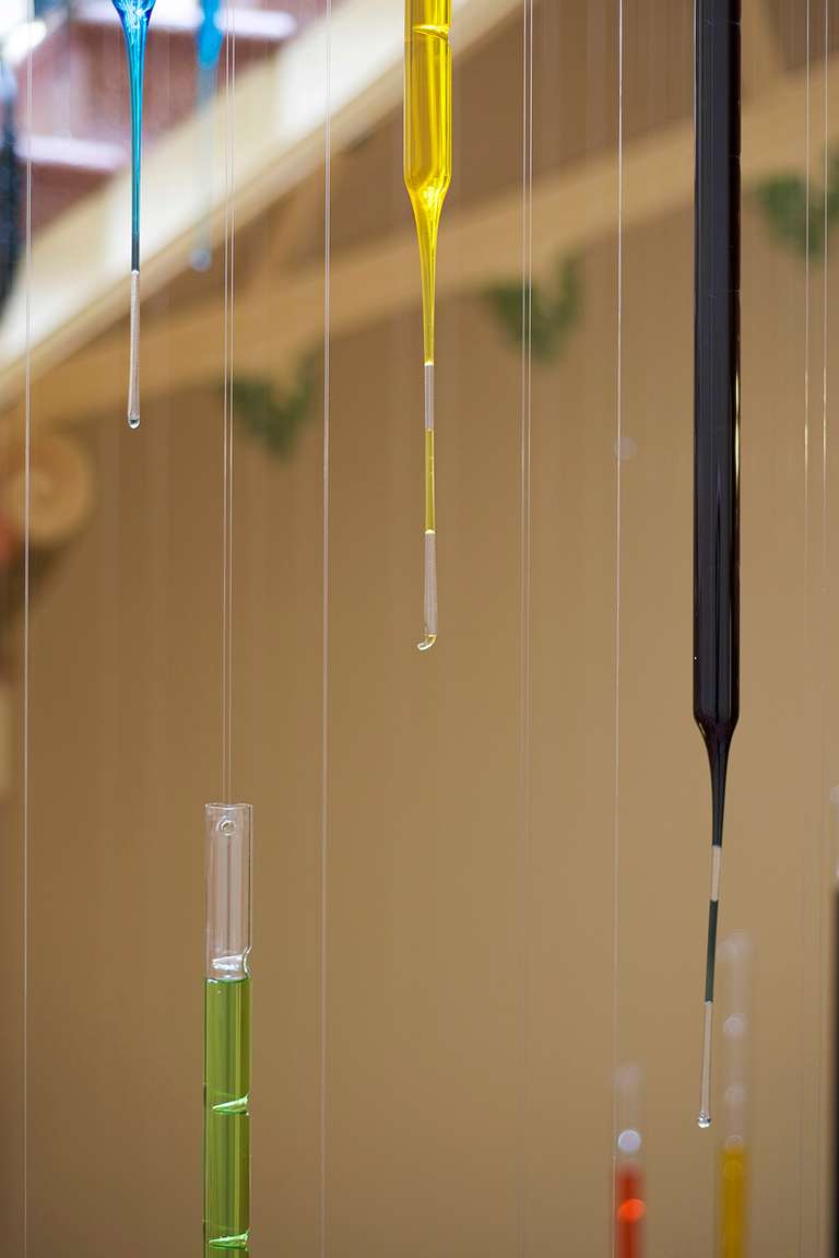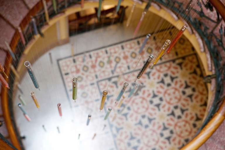 La instalación Vitrales Líquidos plantea una revisión del concepto de vidriera en forma de cascada helicoidal de probetas de vidrio; en cuyo interior agua coloreada deconstruye la visión tradicional que tenemos de una vidriera. El Movimiento Modernista libera al vitral de su funcionalidad religiosa para apropiarse de sus increíbles efectos ópticos. La propuesta se articula como una vidriera tridimensional que se repliega sobre sí misma, ocupando el hueco central de la escalera del Museo Modernista, Can Prunera (Soller, Mallorca). Su recorrido introduce al espectador en una experiencia perceptiva, inmersiva y efímera. La paleta mironiana está presente en el juego de colores propuesto en el interior de la probetas cristalinas que conforman esta particular vidriera.