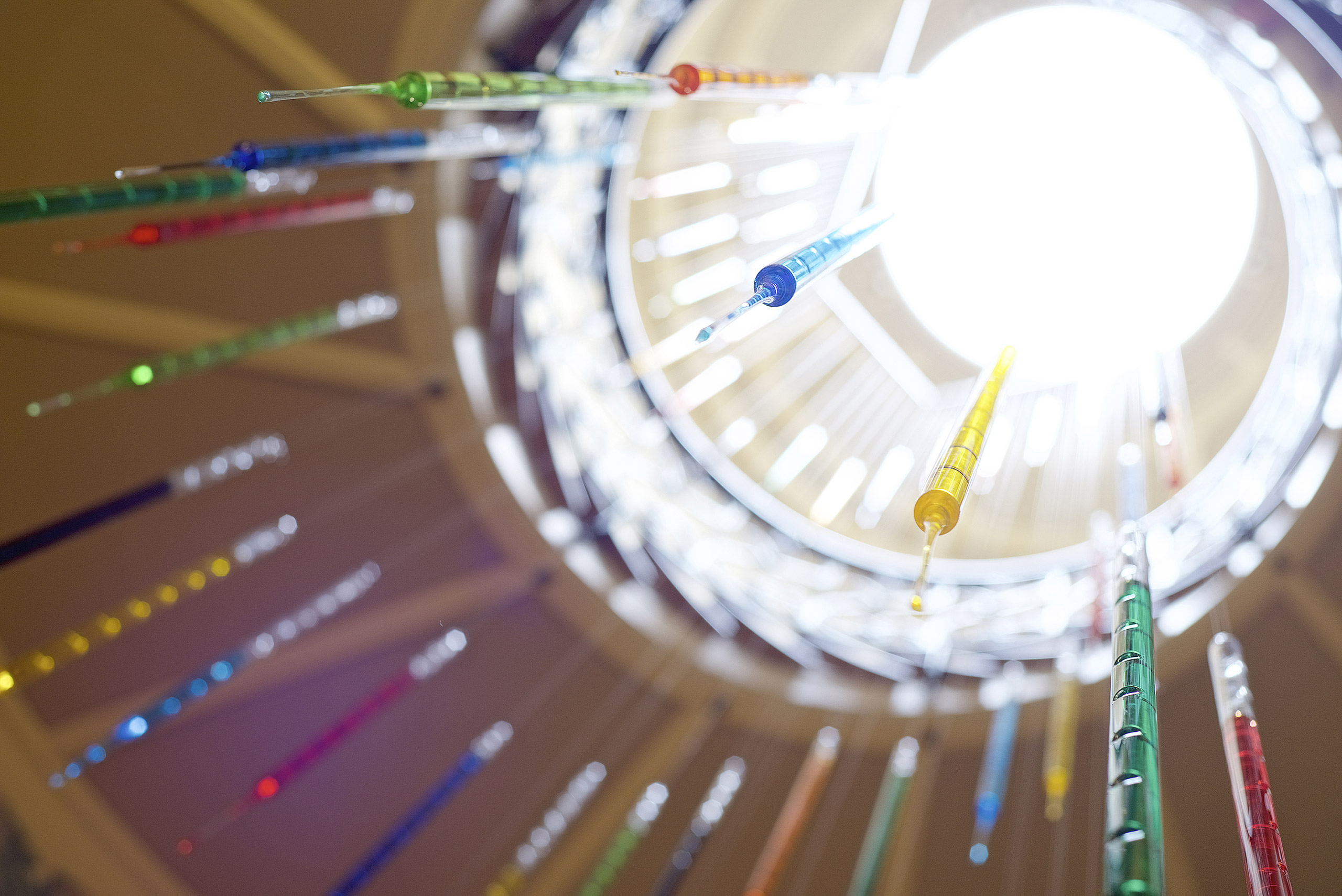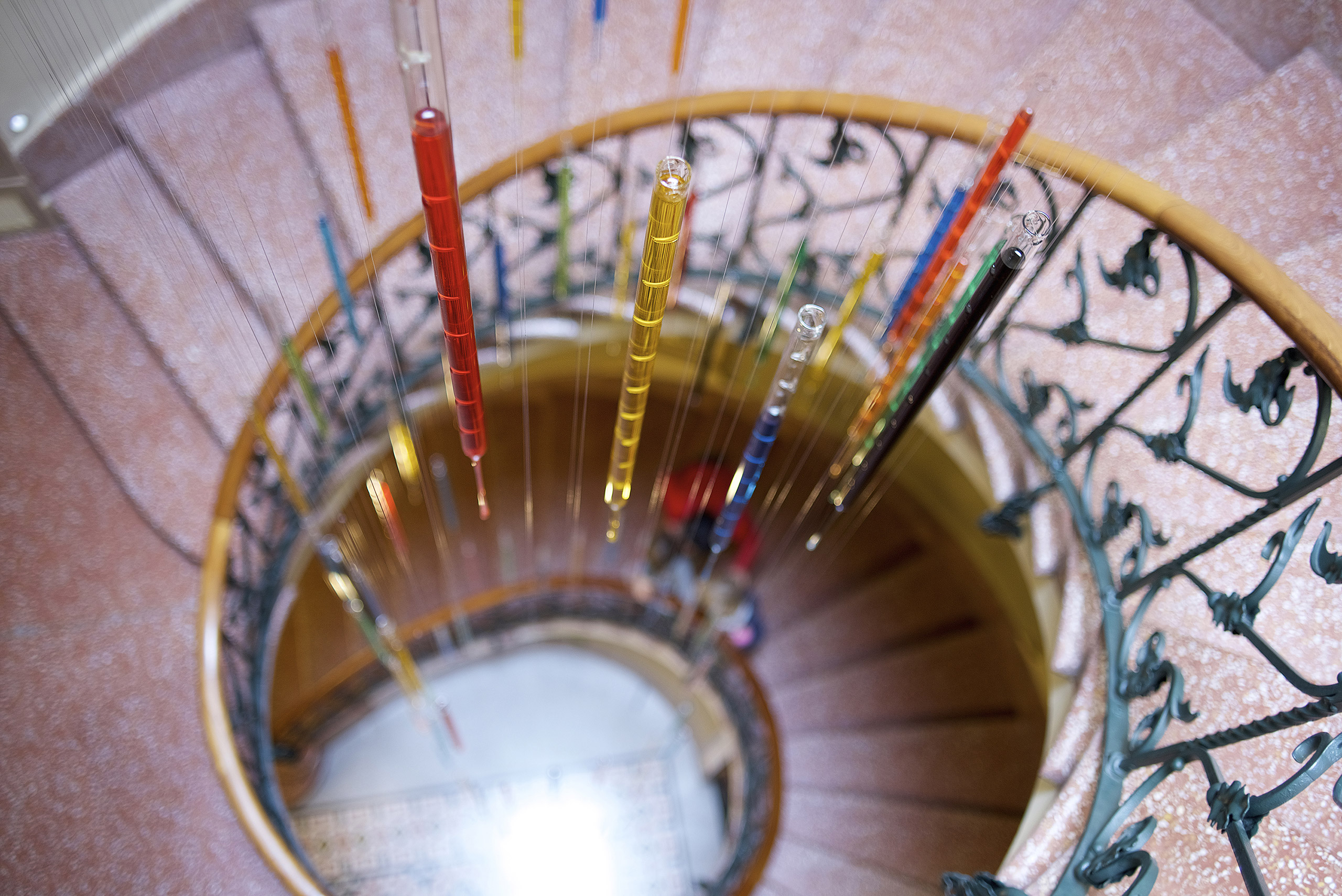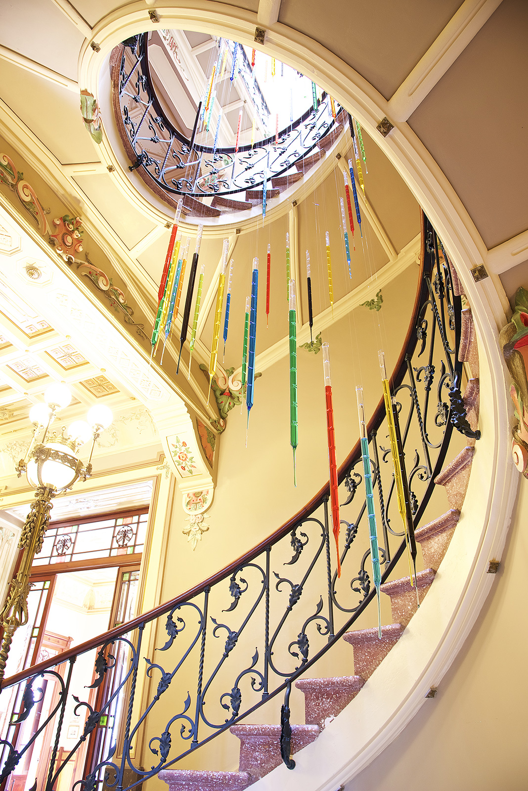 La instalación Vitrales Líquidos plantea una revisión del concepto de vidriera en forma de cascada helicoidal de probetas de vidrio; en cuyo interior agua coloreada deconstruye la visión tradicional que tenemos de una vidriera. El Movimiento Modernista libera al vitral de su funcionalidad religiosa para apropiarse de sus increíbles efectos ópticos. La propuesta se articula como una vidriera tridimensional que se repliega sobre sí misma, ocupando el hueco central de la escalera del Museo Modernista, Can Prunera (Soller, Mallorca). Su recorrido introduce al espectador en una experiencia perceptiva, inmersiva y efímera. La paleta mironiana está presente en el juego de colores propuesto en el interior de la probetas cristalinas que conforman esta particular vidriera.